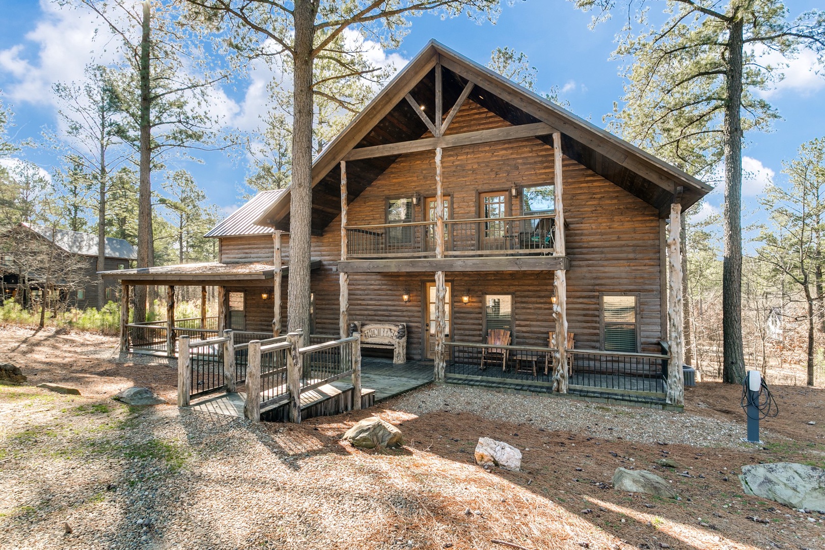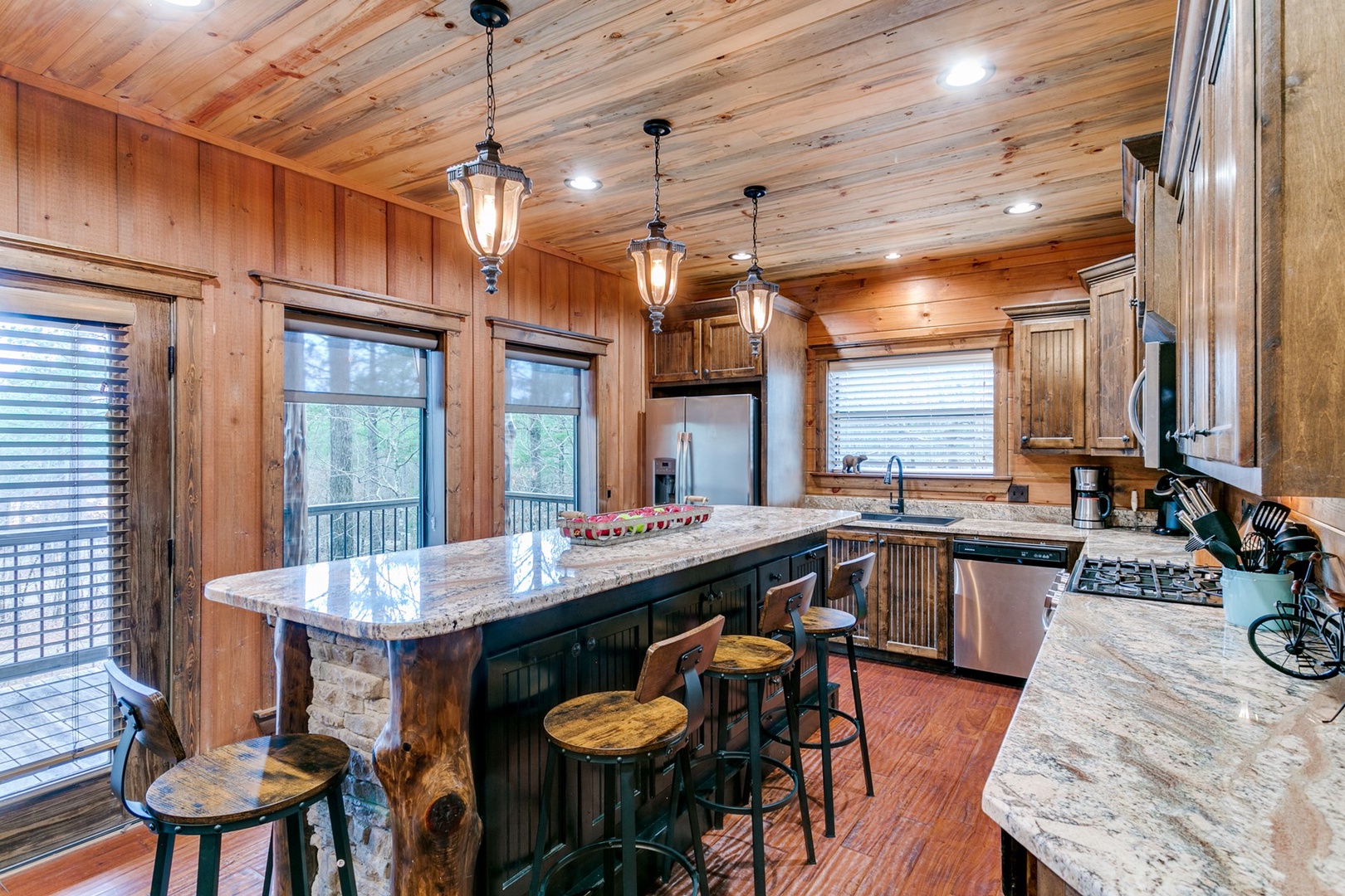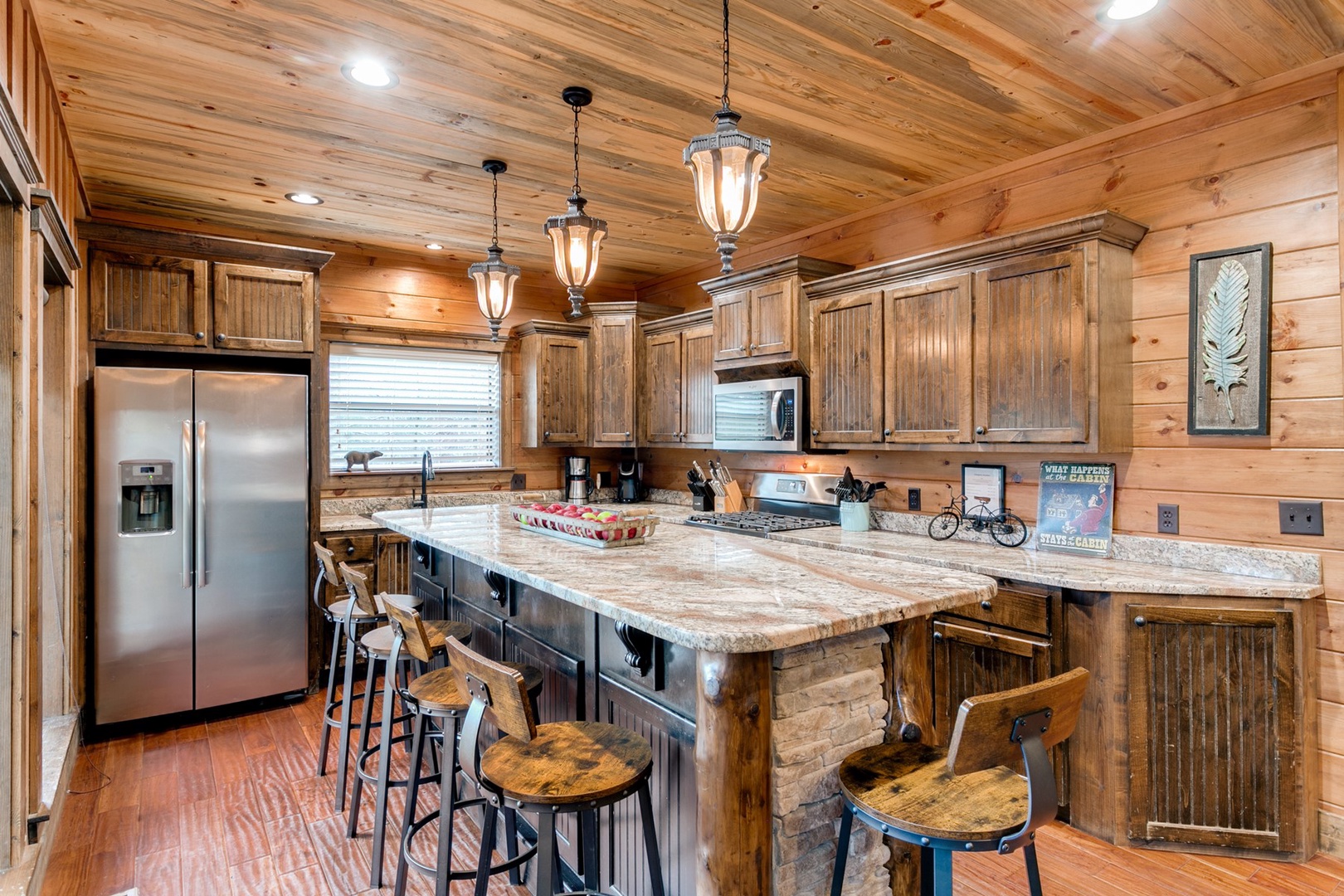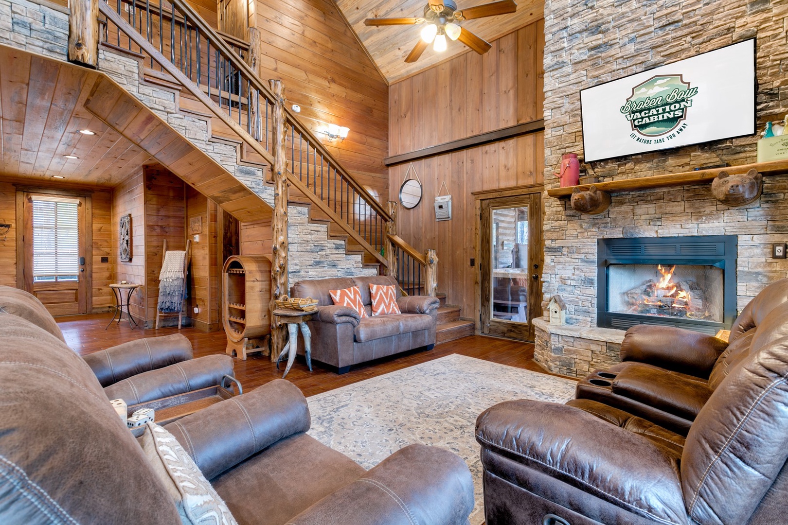The living area allows for multiple seating in front of a custom crafted wood mantle depicting twin bears for which the cabin gets its name. The cabin interior has wood tones and dry stack stone perfect for entertaining and relaxing. Four master bedrooms each have a private bath with custom rock showers.