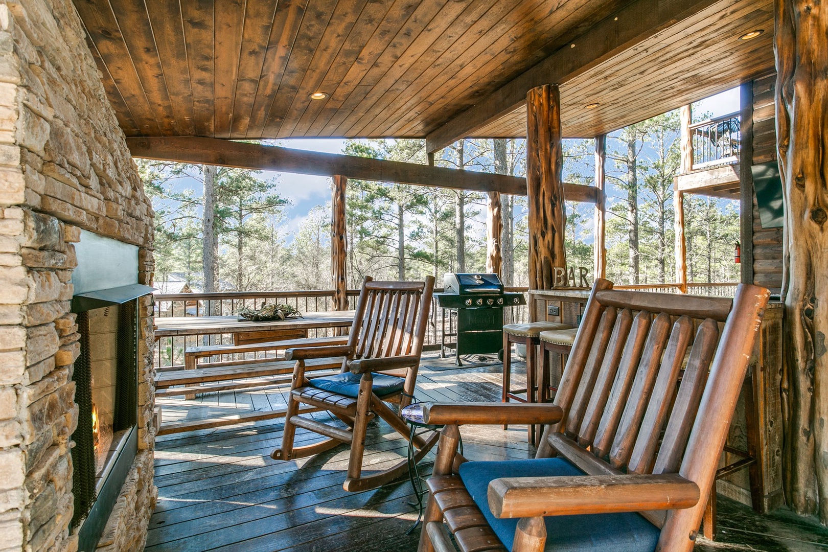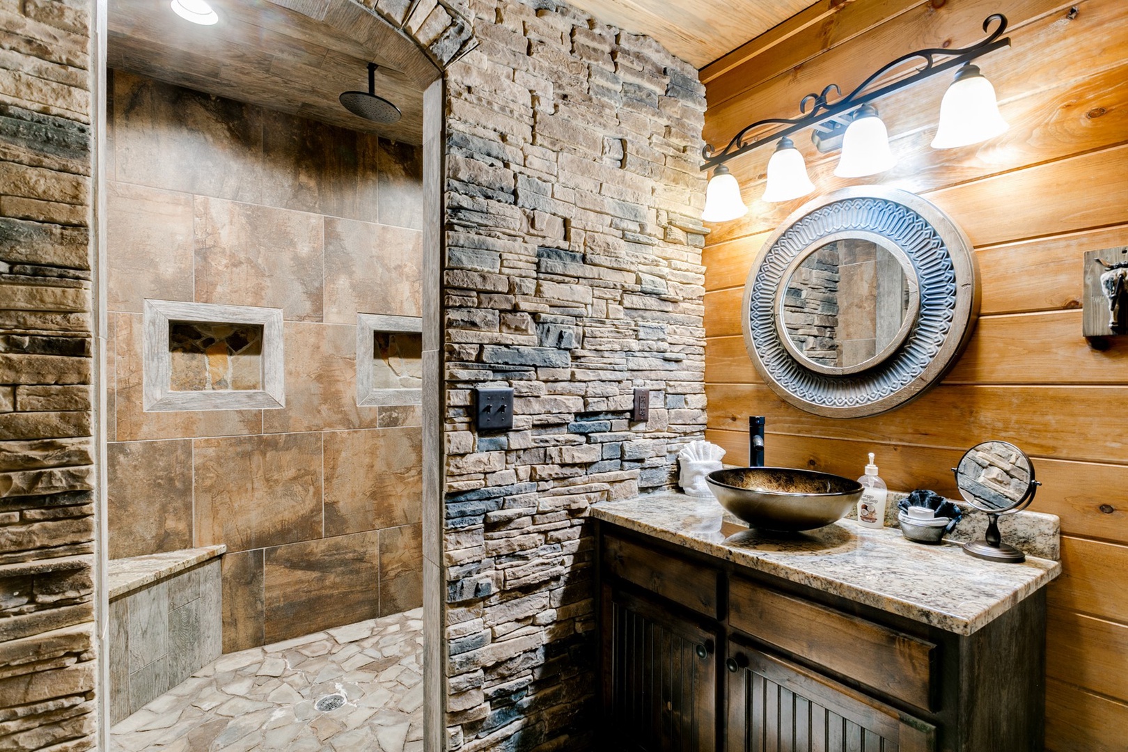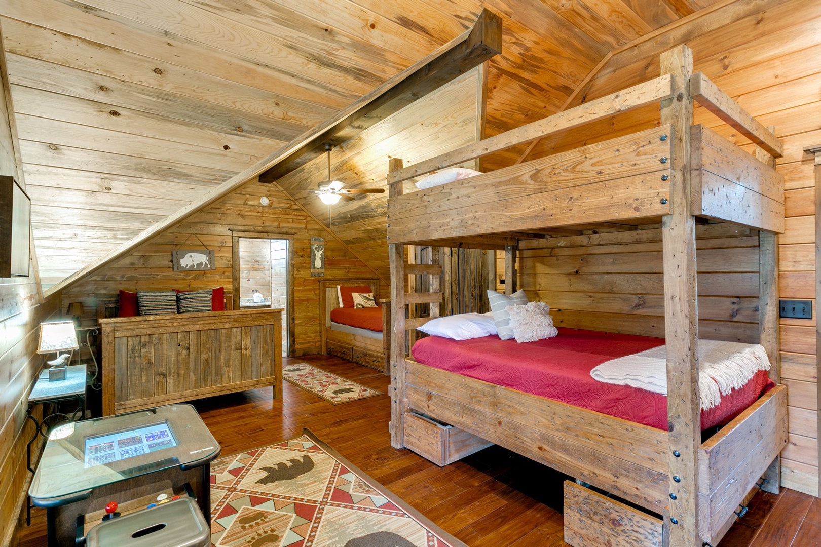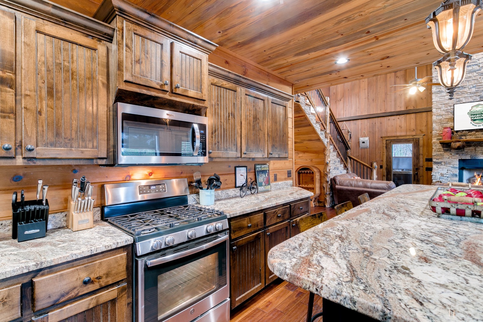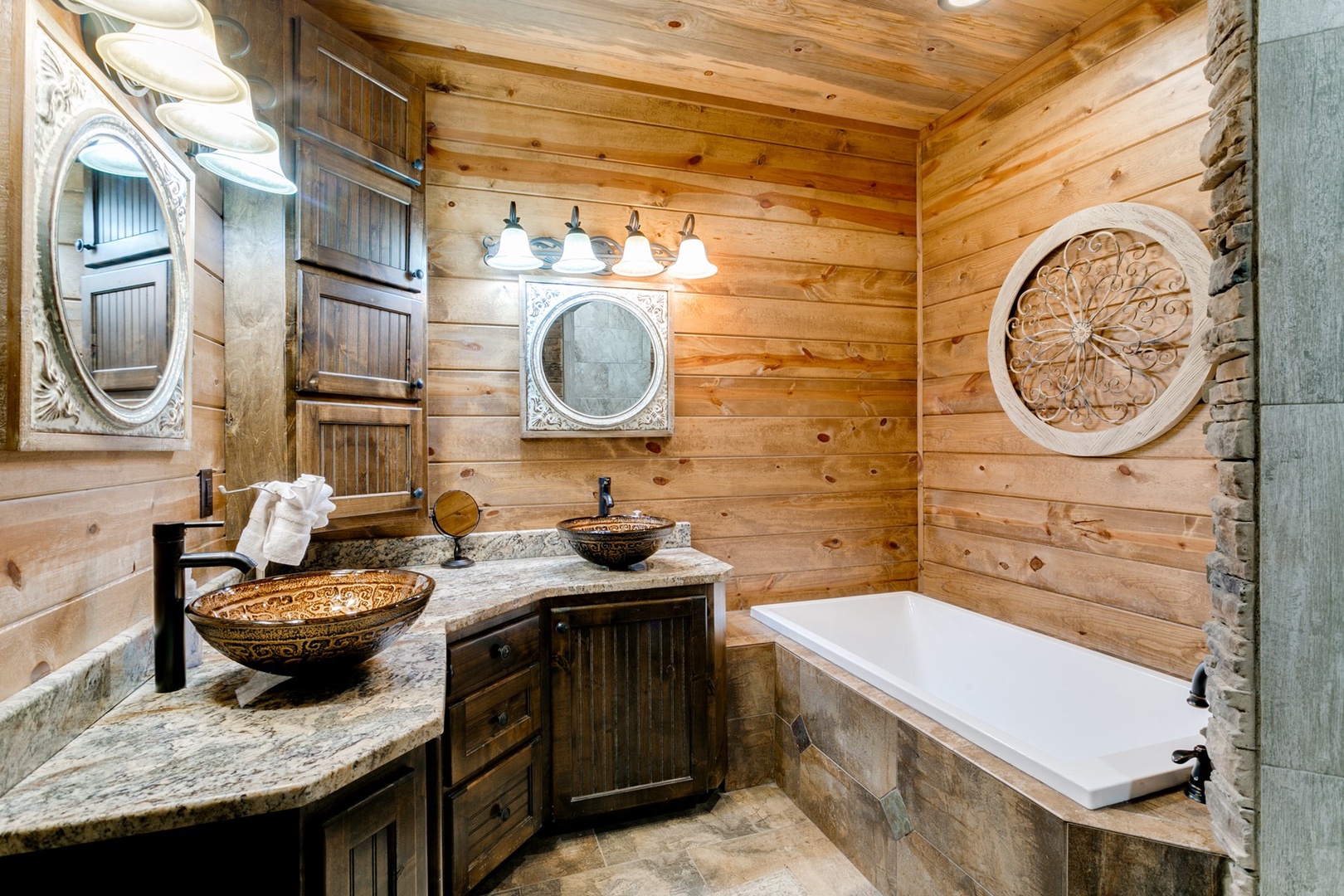 The living area allows for multiple seating in front of a custom crafted wood mantle depicting twin bears for which the cabin gets its name. The cabin interior has wood tones and dry stack stone perfect for entertaining and relaxing. Four master bedrooms each have a private bath with custom rock showers.