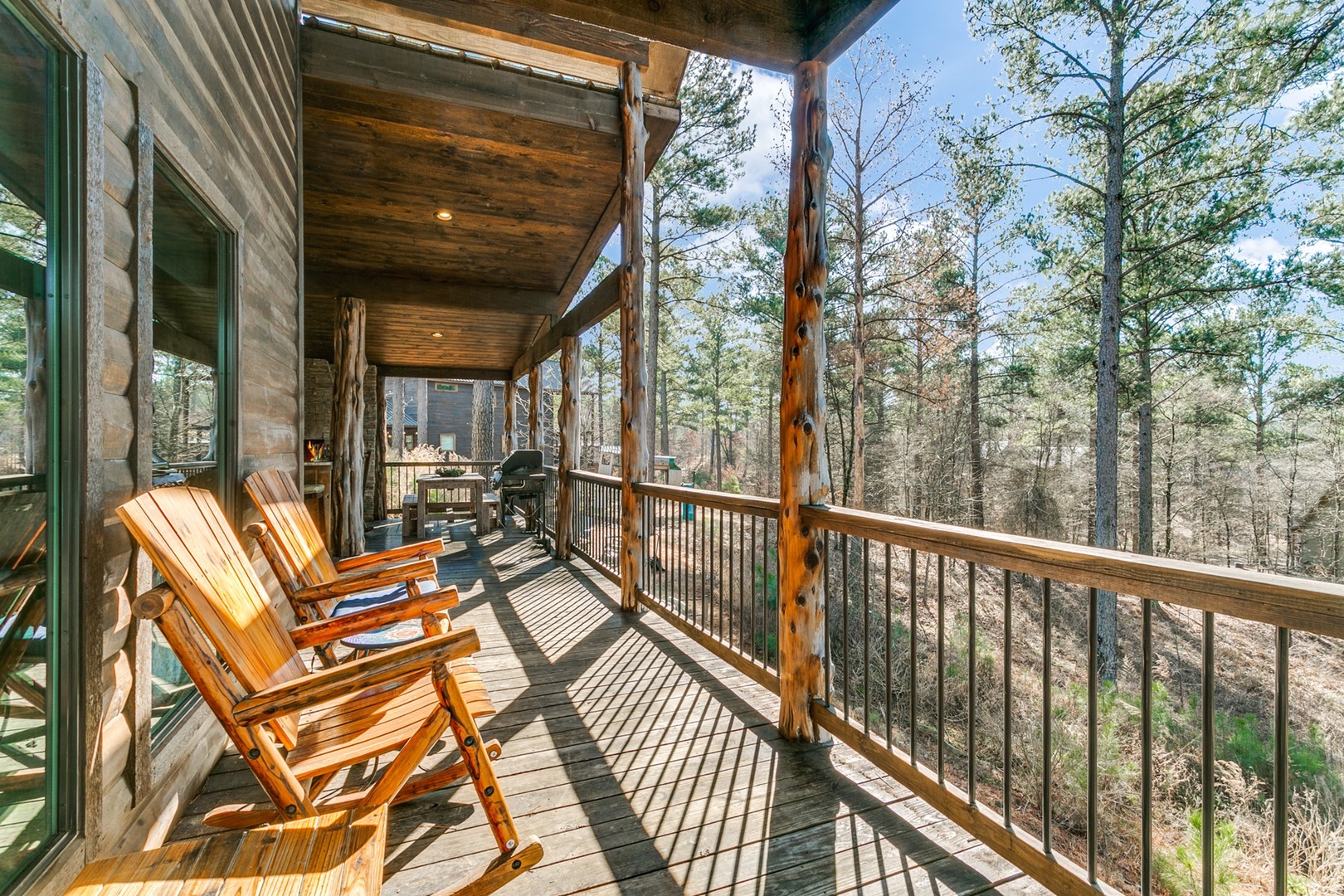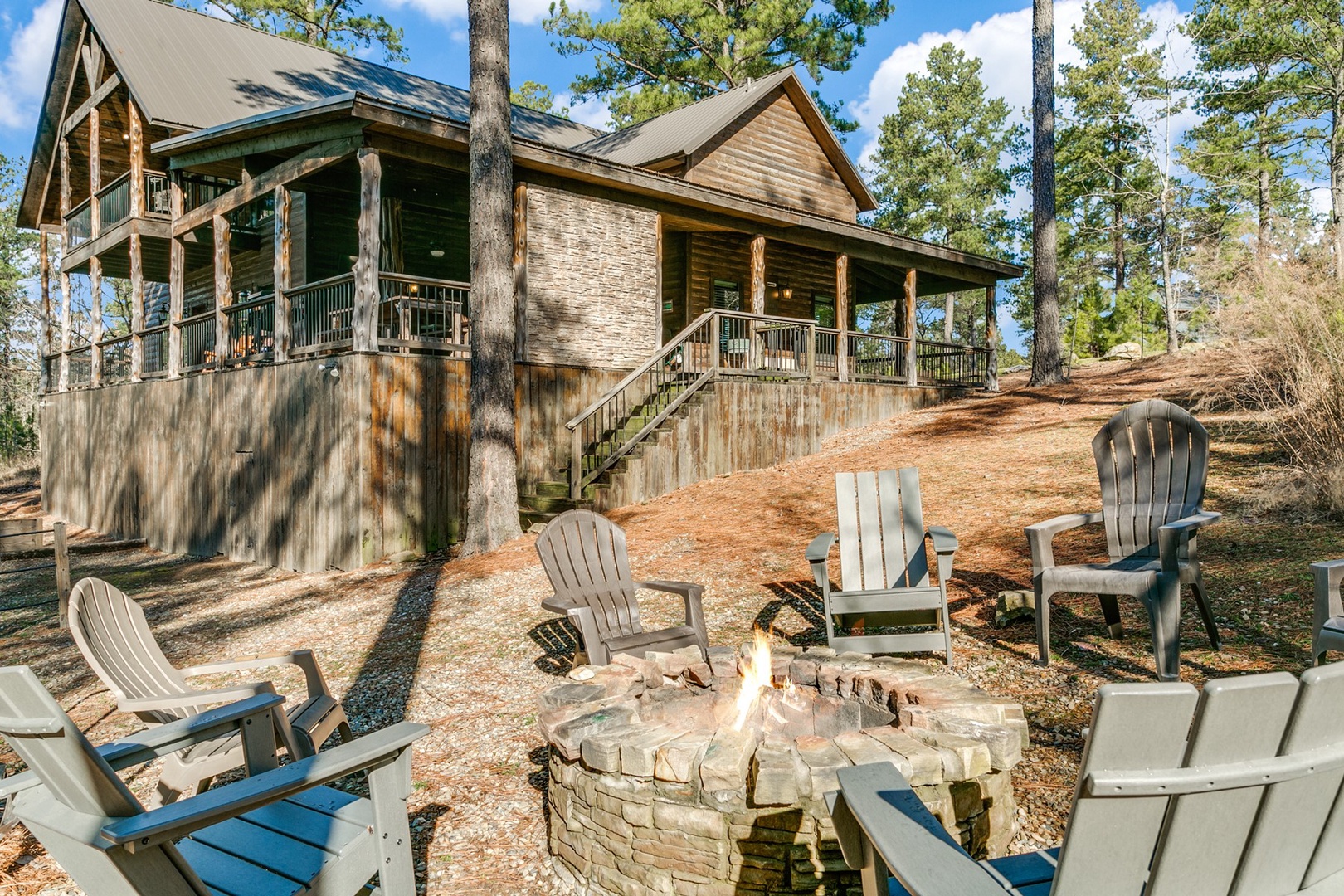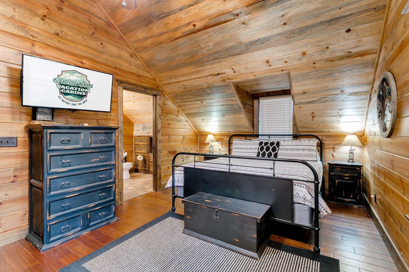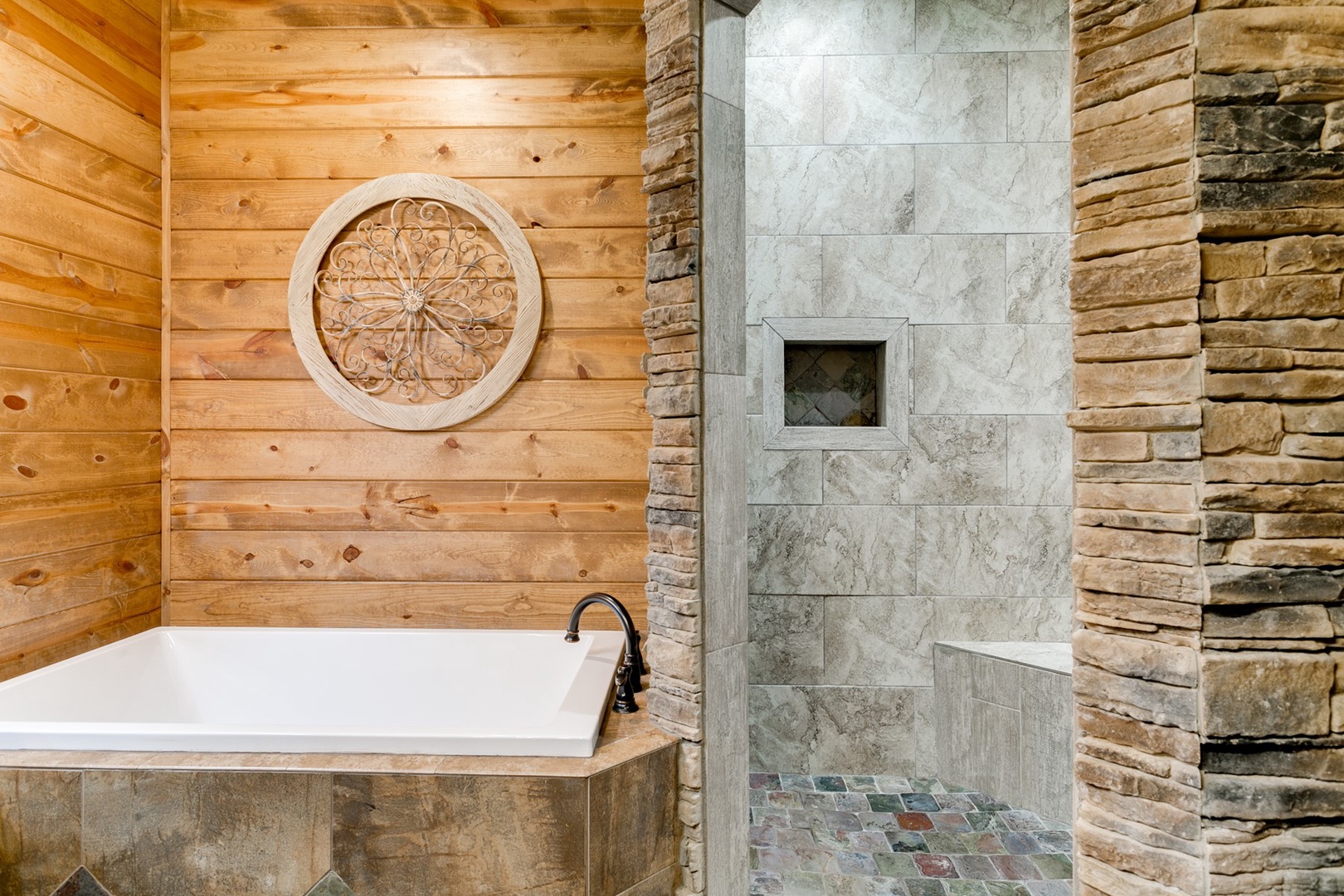 The living area allows for multiple seating in front of a custom crafted wood mantle depicting twin bears for which the cabin gets its name. The cabin interior has wood tones and dry stack stone perfect for entertaining and relaxing. Four master bedrooms each have a private bath with custom rock showers.