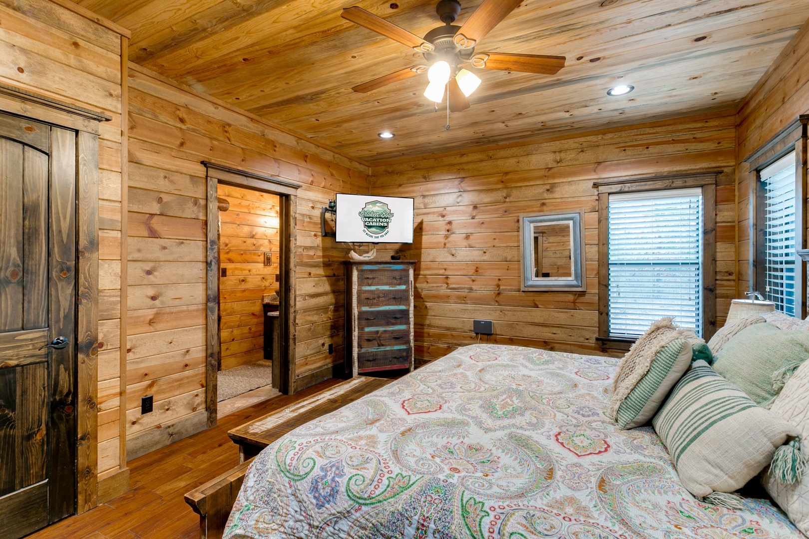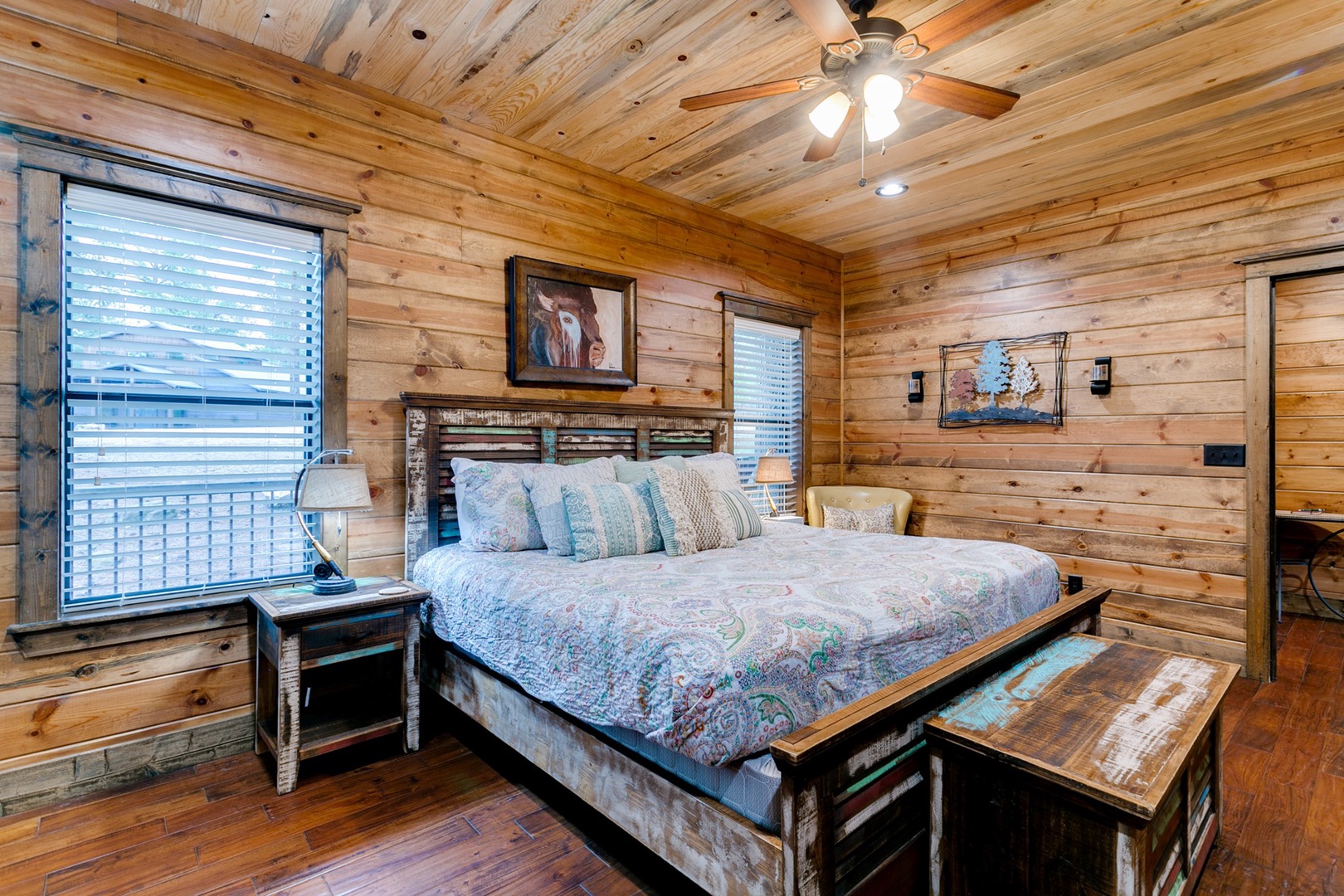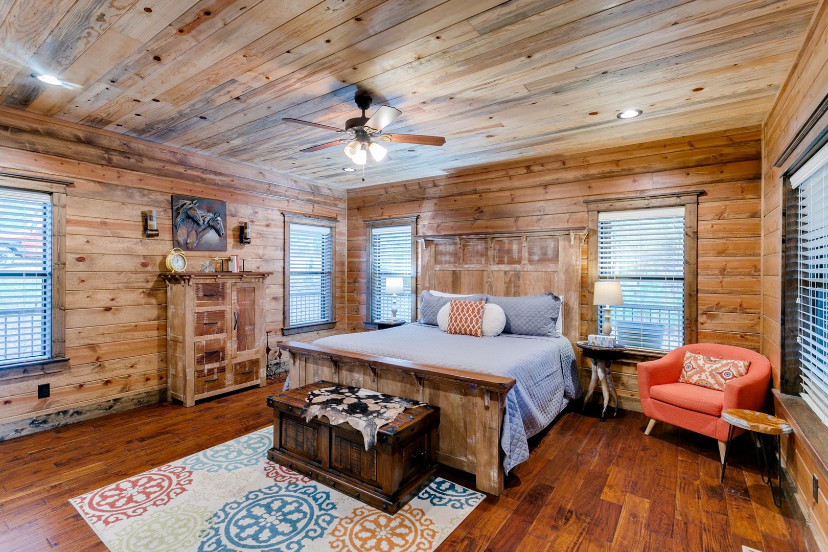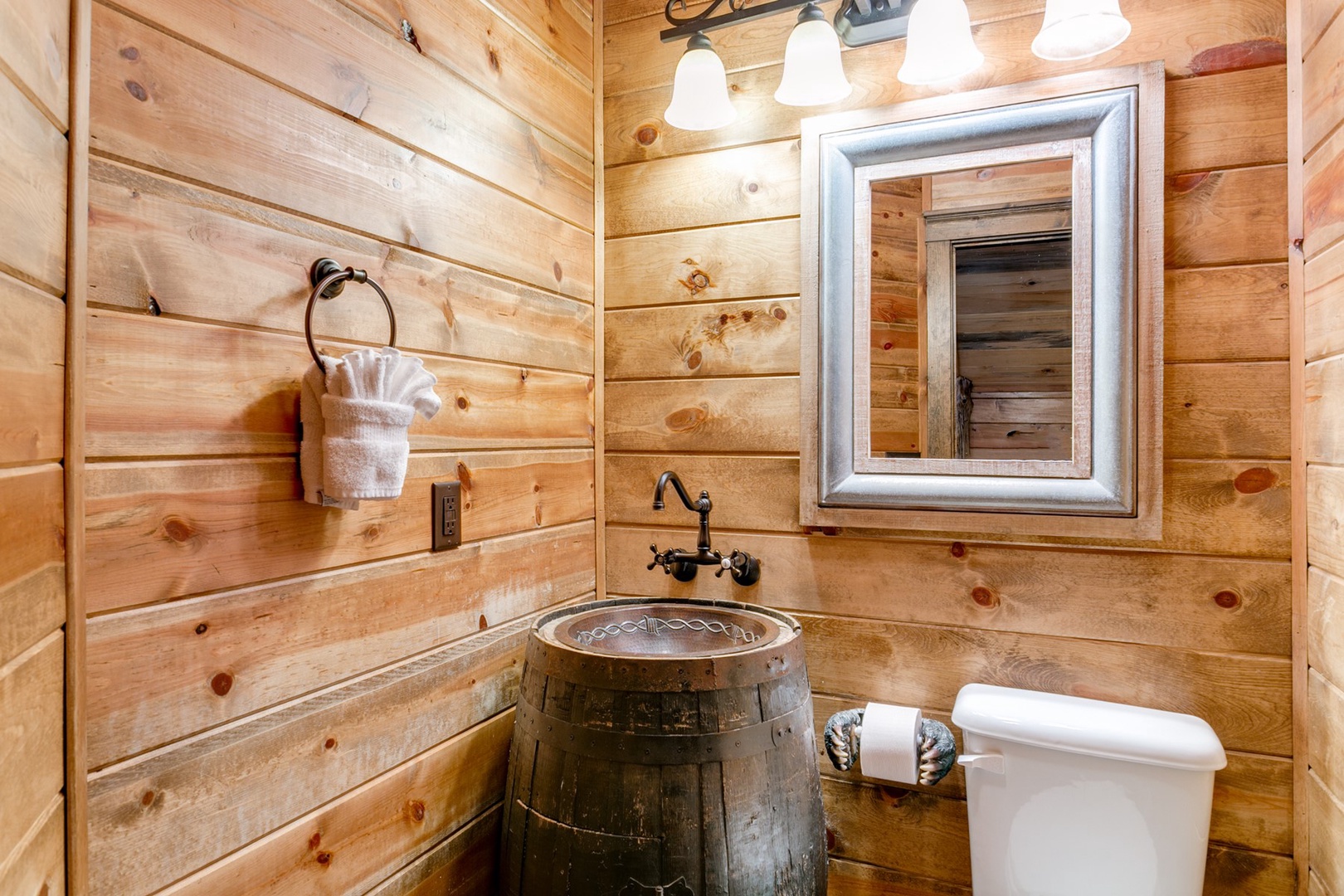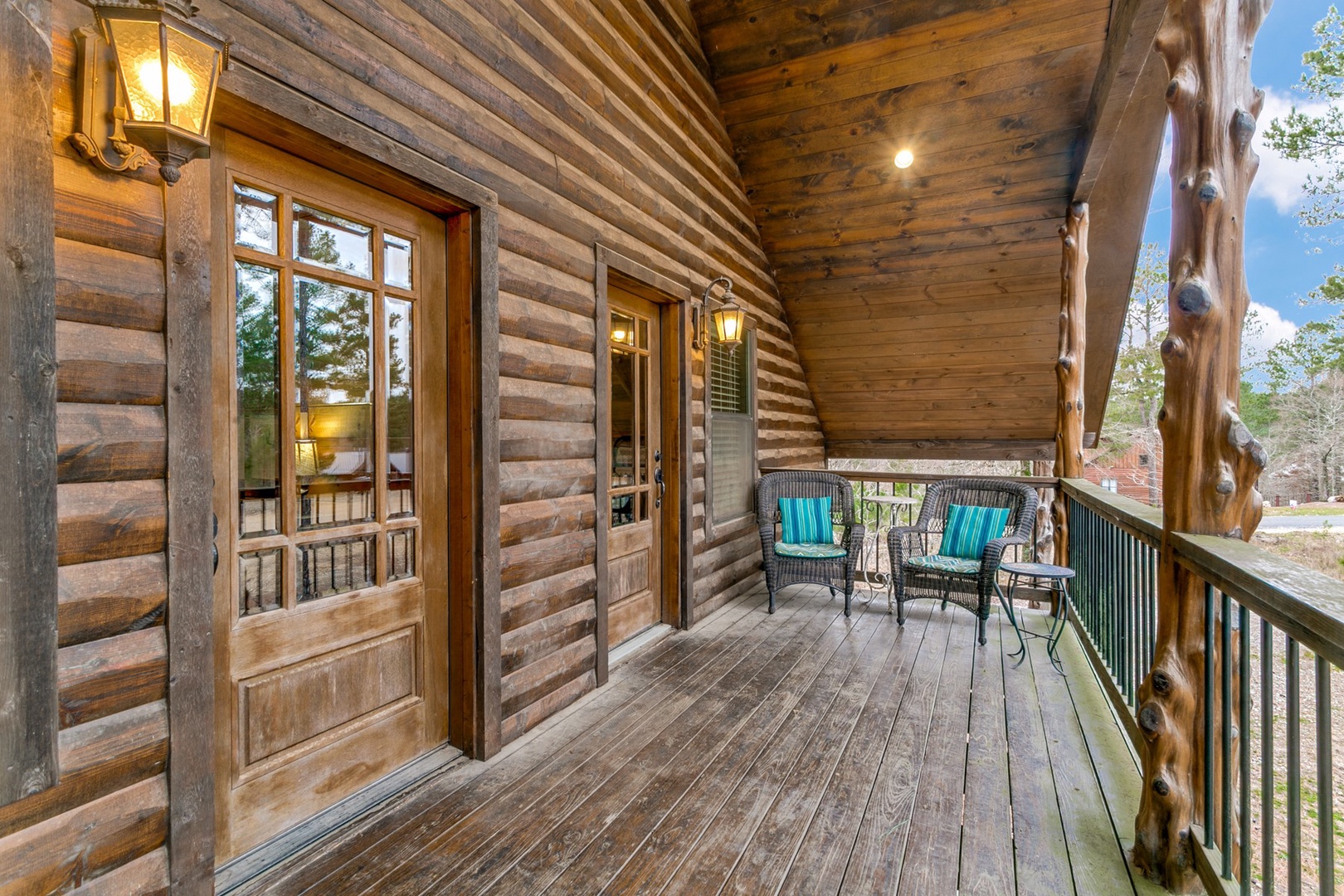 The living area allows for multiple seating in front of a custom crafted wood mantle depicting twin bears for which the cabin gets its name. The cabin interior has wood tones and dry stack stone perfect for entertaining and relaxing. Four master bedrooms each have a private bath with custom rock showers.