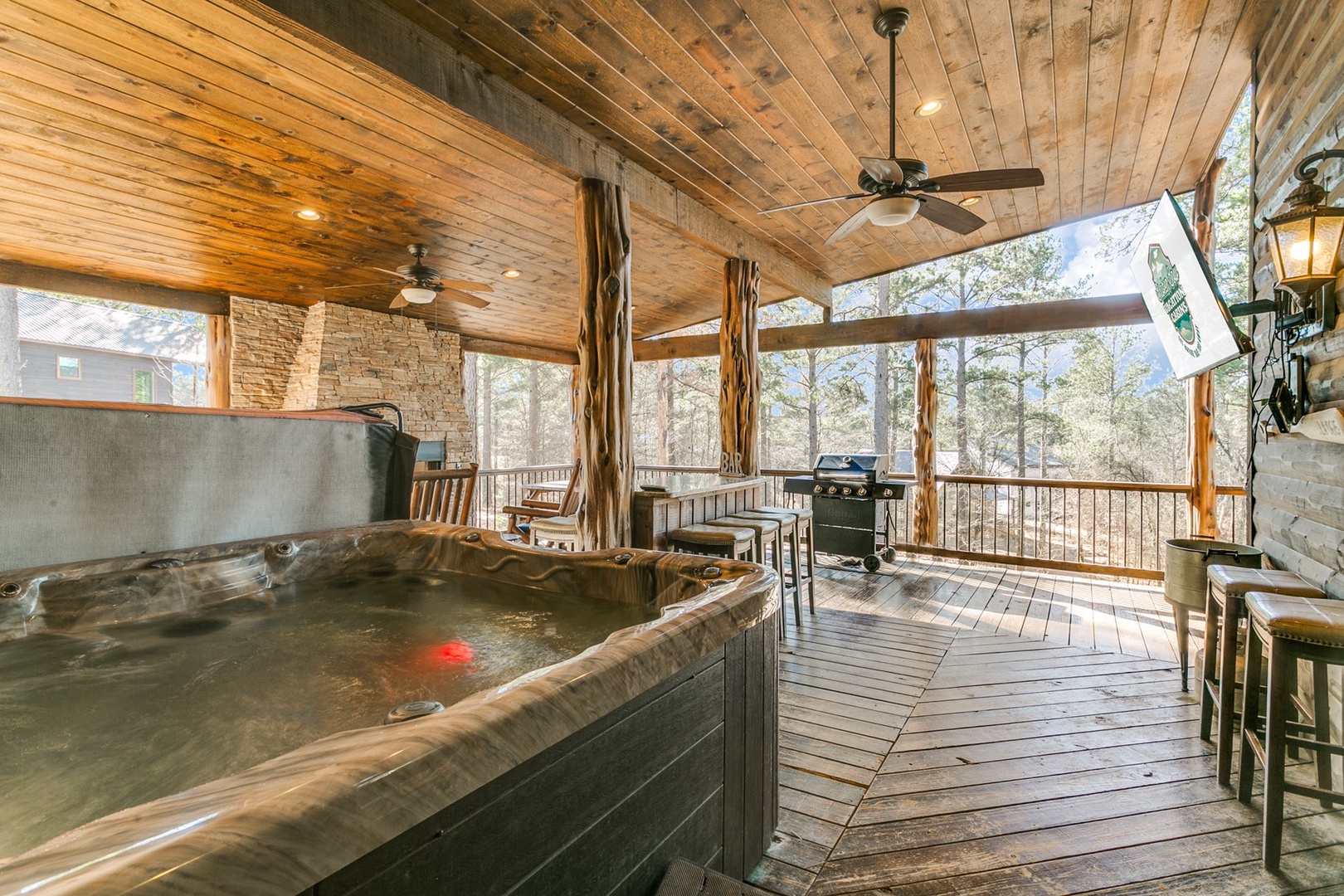 - Covered Decks with multiple seating options; gas fireplace (seasonal October 15th – April 15th); Propane gas grill; Hot tub