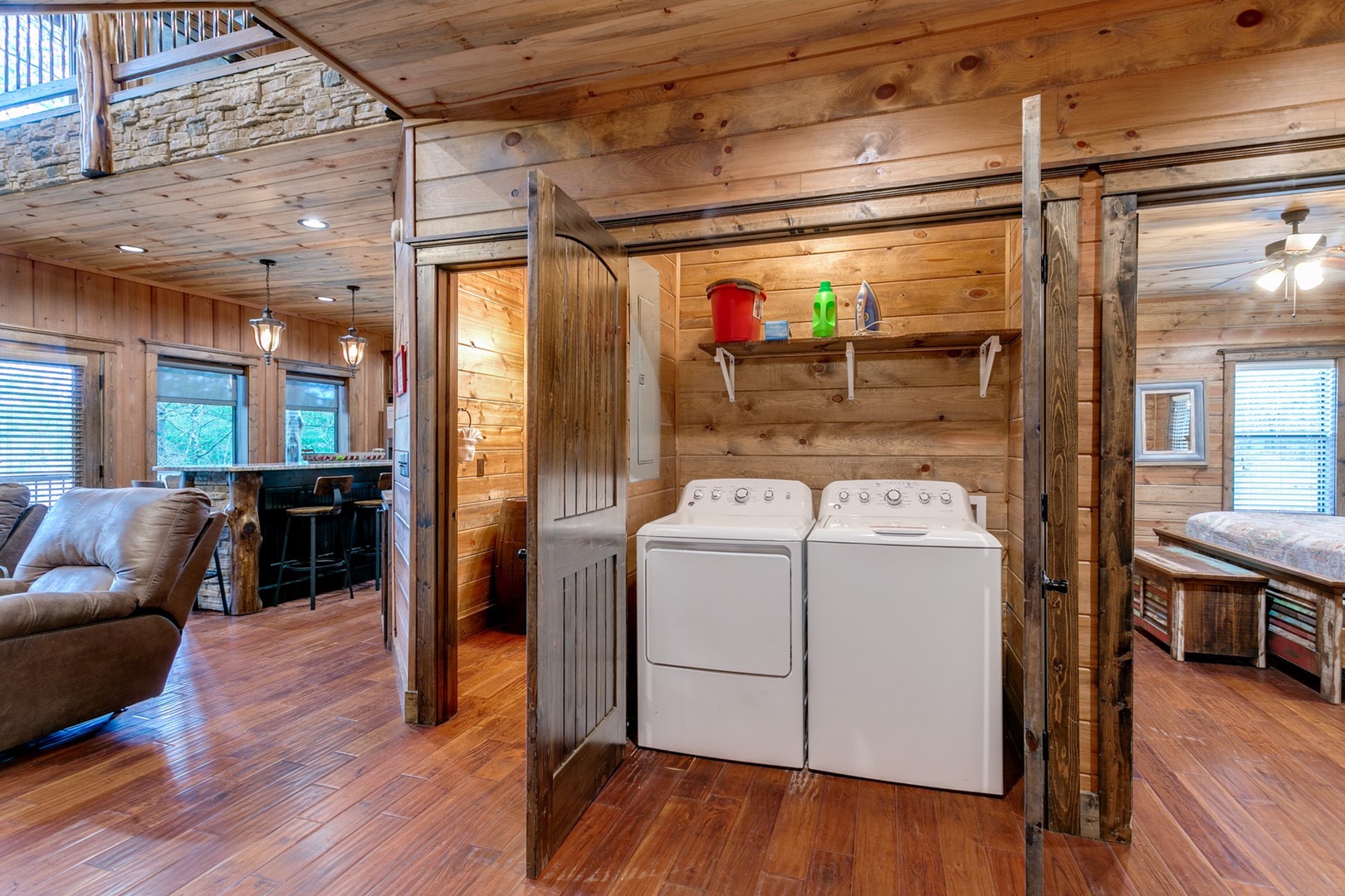 - Laundry closet with full size washer and dryer (detergent and dryer sheets provided); Iron & ironing board