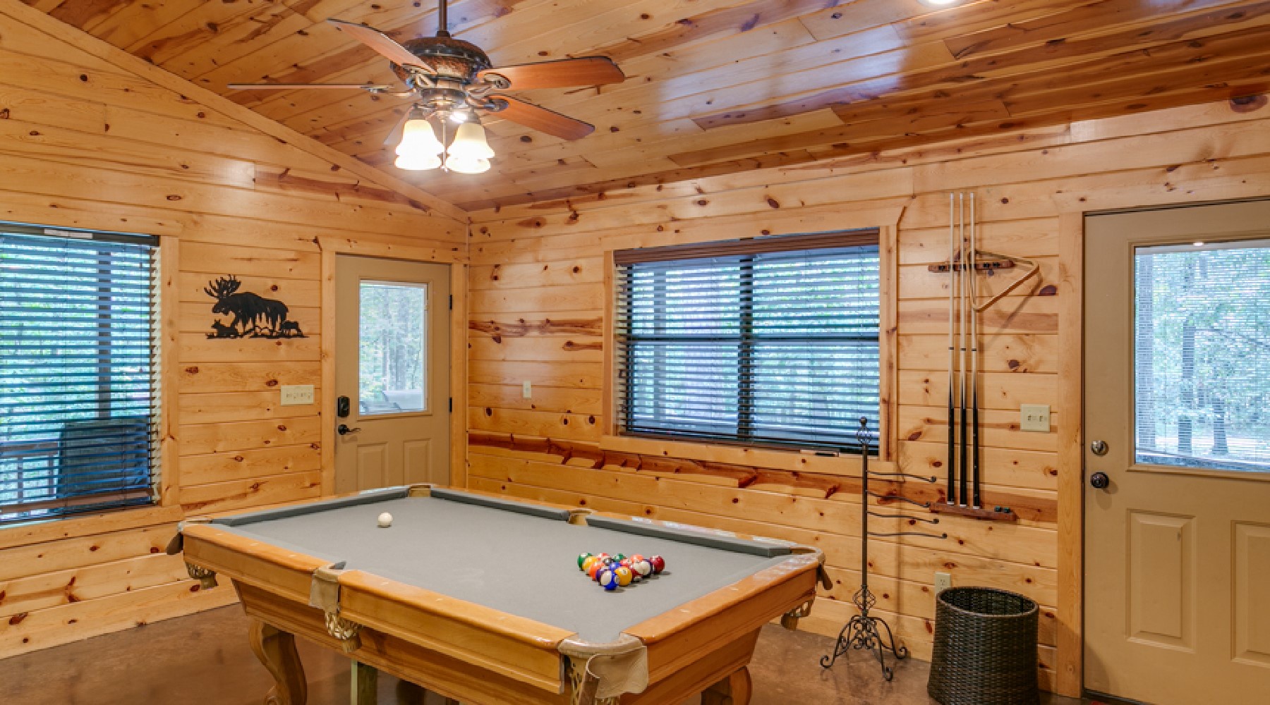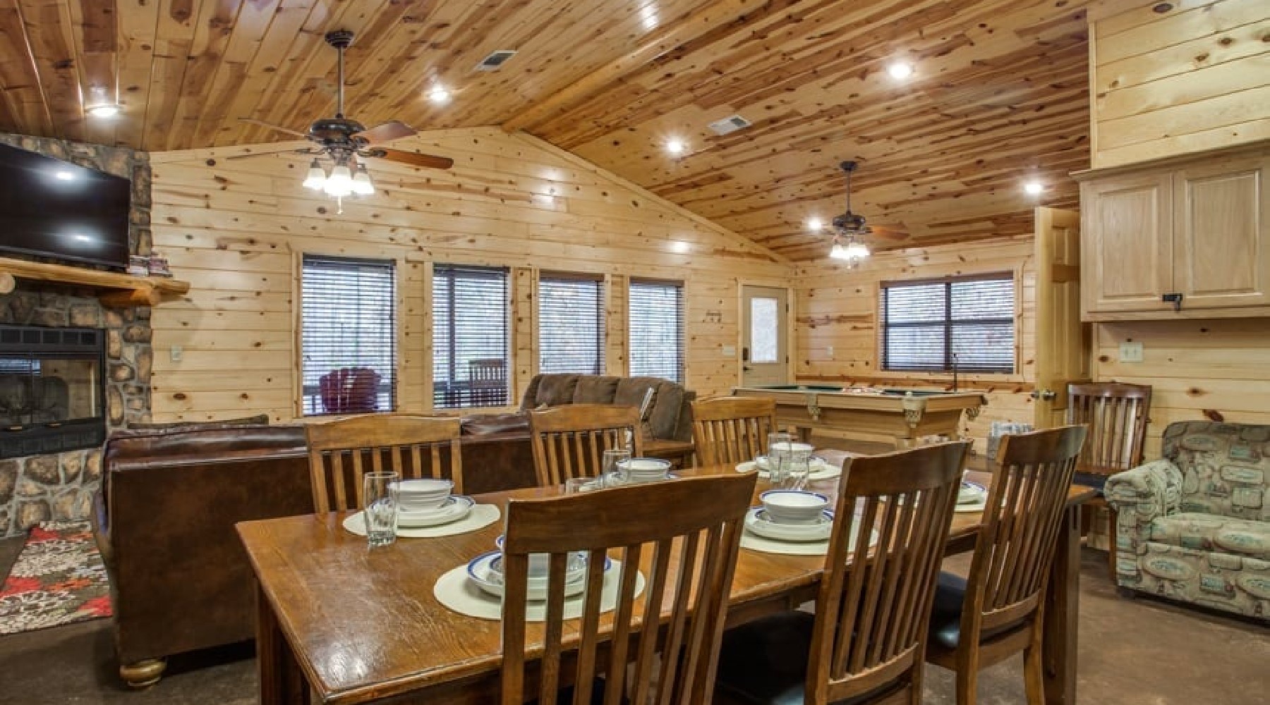 The spacious living area is furnished with two full sized sofas- one sofa converts to a queen sleeper. Above the natural stone hearth of the wood burning fireplace, a 55″ HDTV is mounted also with Direct TV package (PPV not available). A DVD player is provided for this TV. Enjoy a challenging game of pool on the solid oak pool table that sits in the large openness of the living/kitchen area.