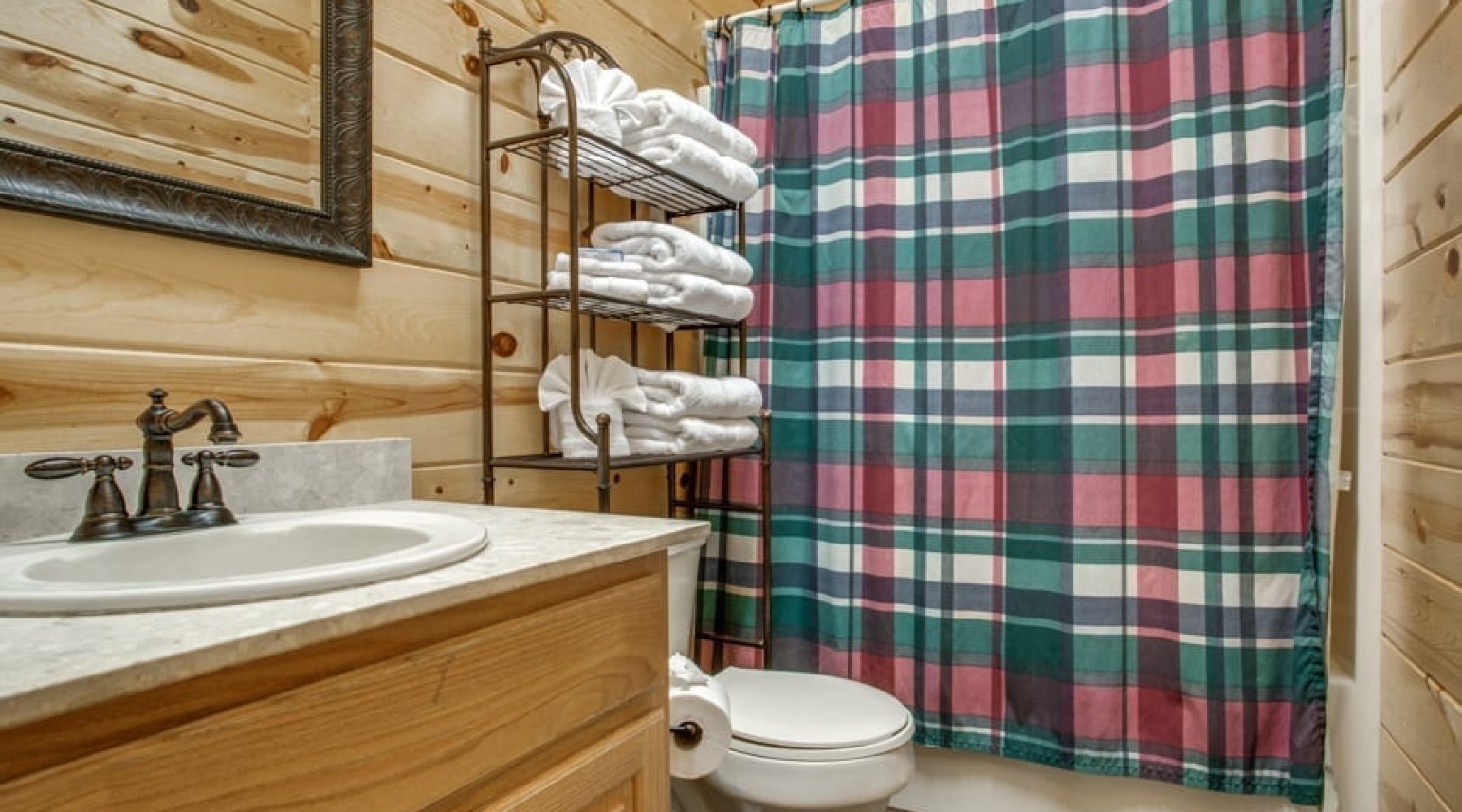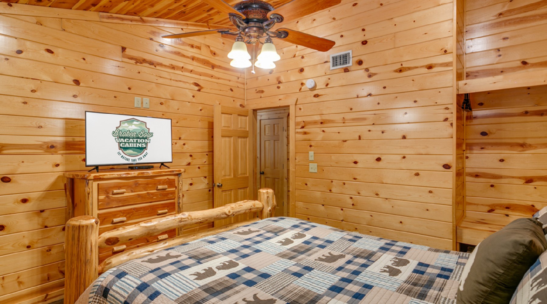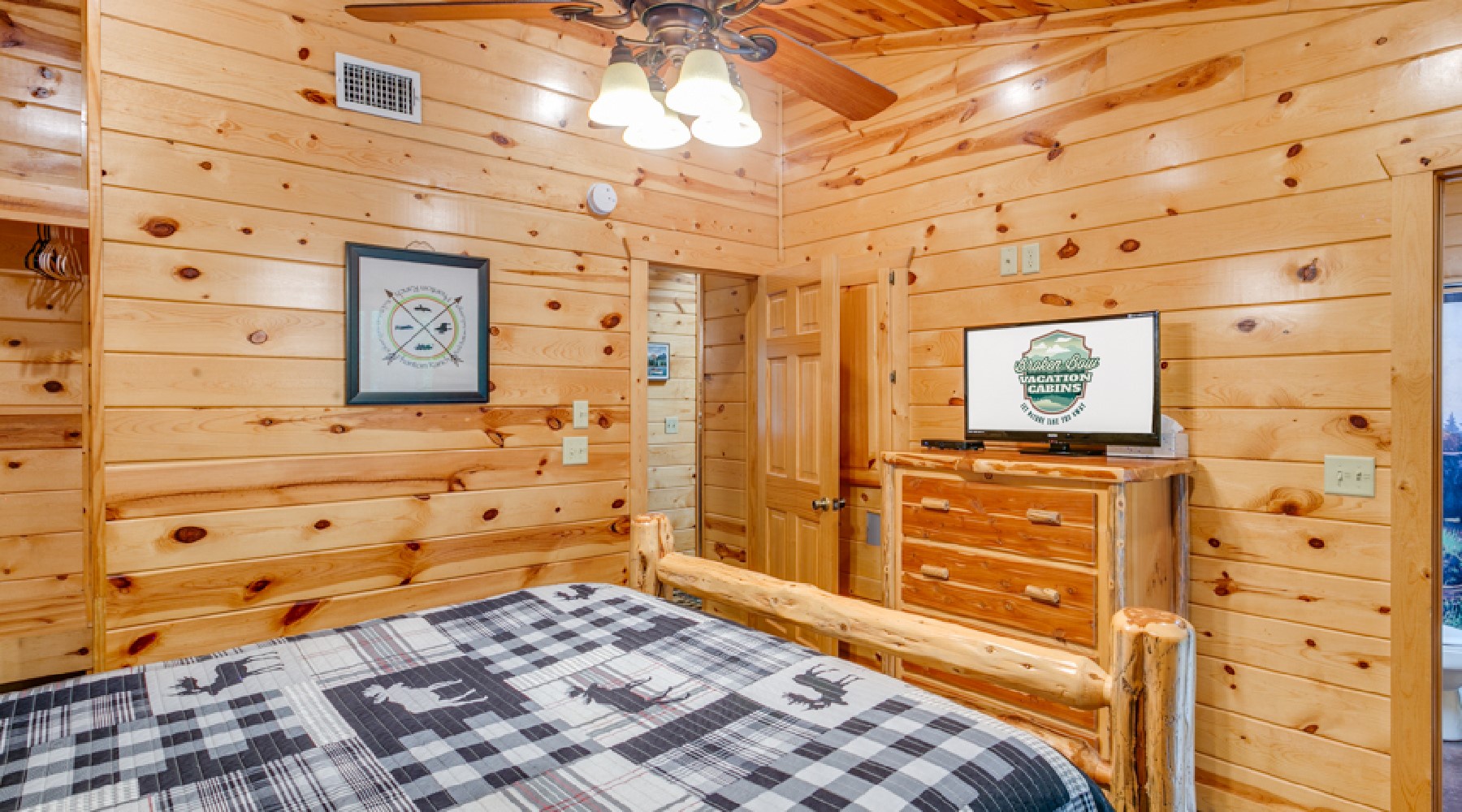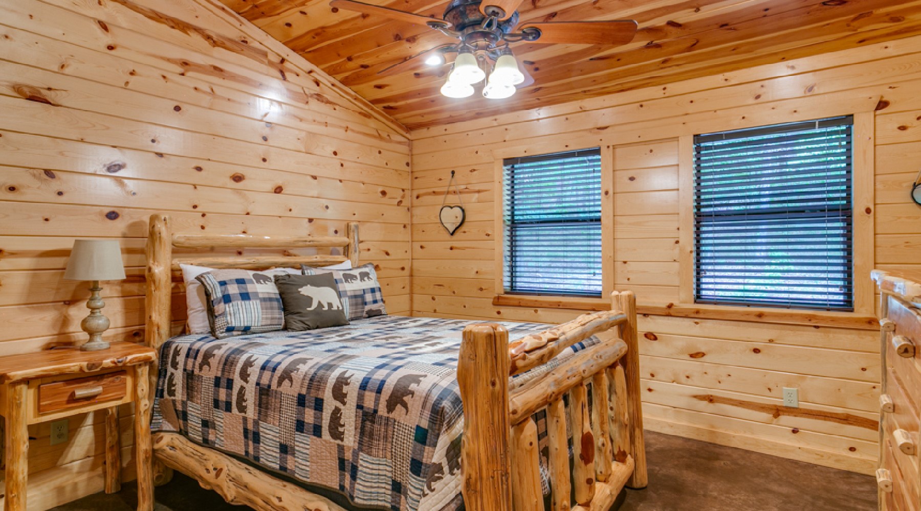 With 1227 square feet of living area, the Whispering Pines Cabin is a beautiful single story, real log cabin that can sleep up to 6 guests. The cabin has two bedrooms and two full baths making it very convenient for larger families or multiple couples. Each bedroom features a queen size bed made of natural logs and flat screen TV with Direct TV package (PPV not available). One bath is located in the master bedroom and the other is a hallway bath. Both have tub/shower combinations. All linens and towels are provided.
