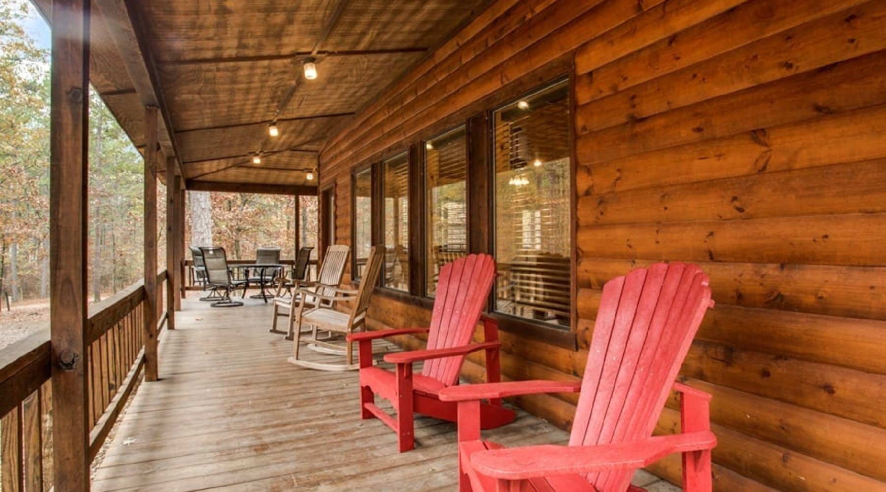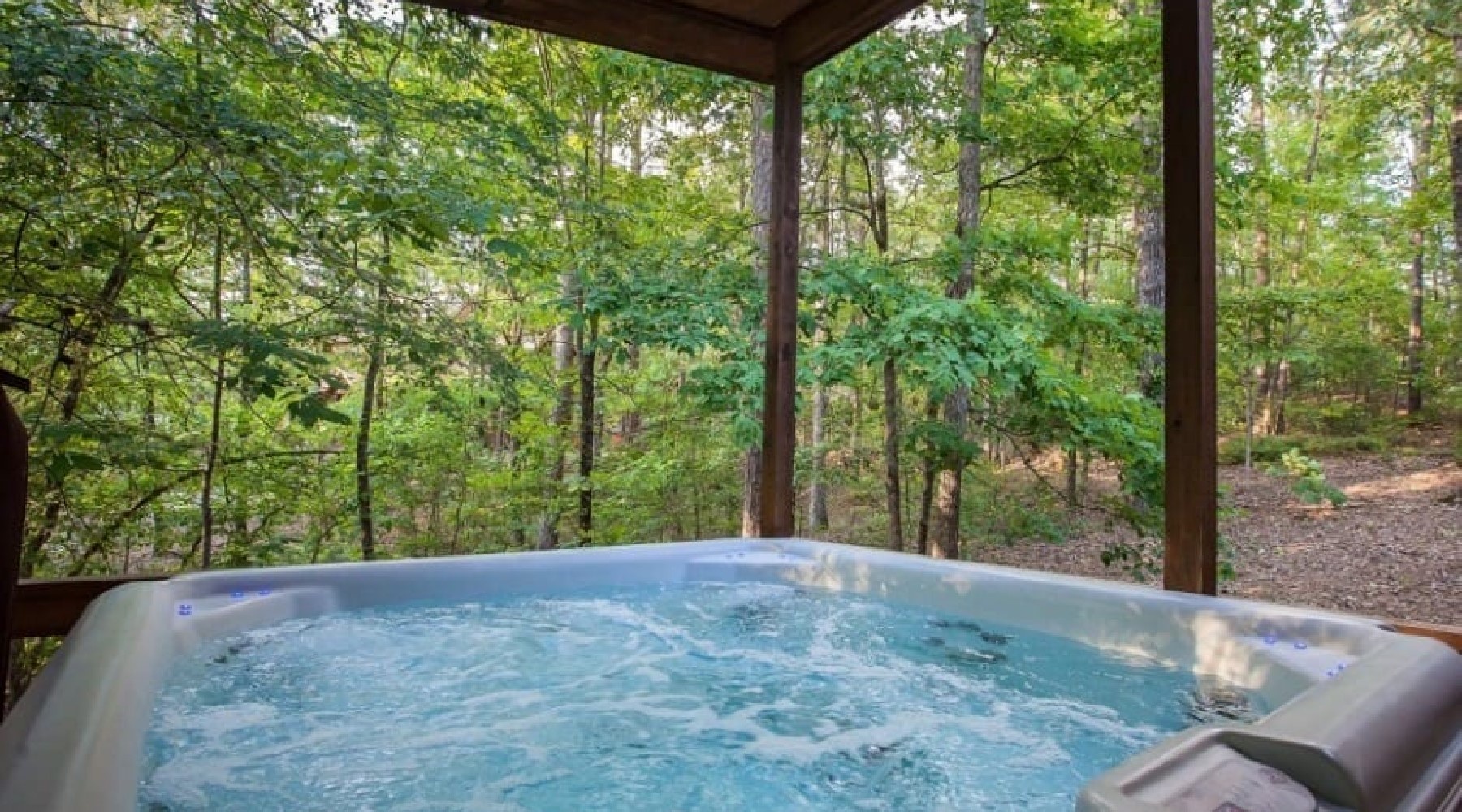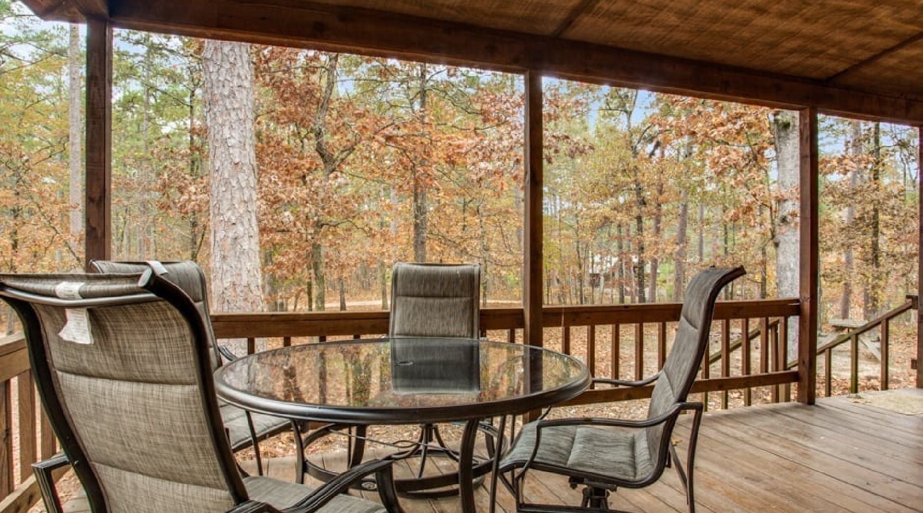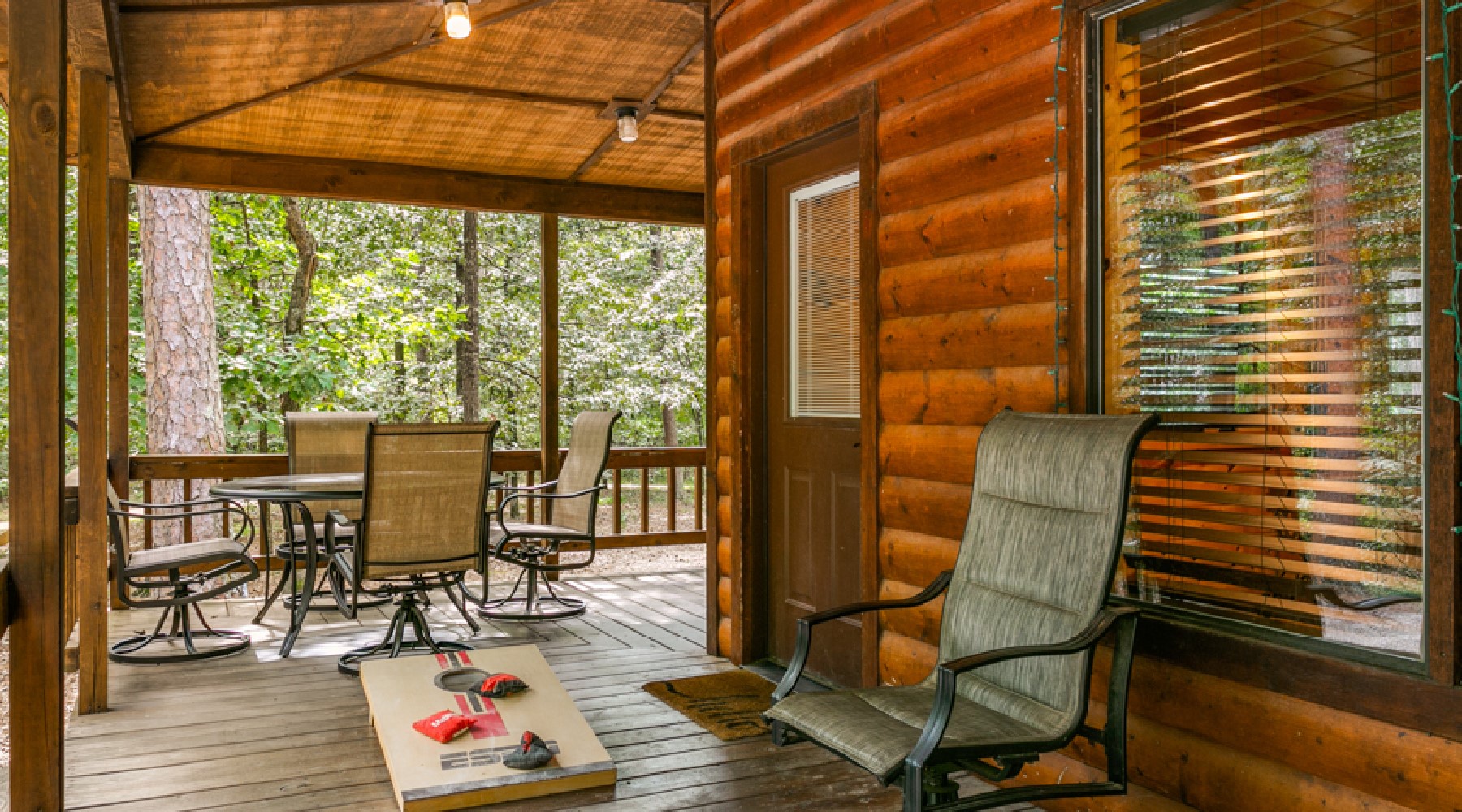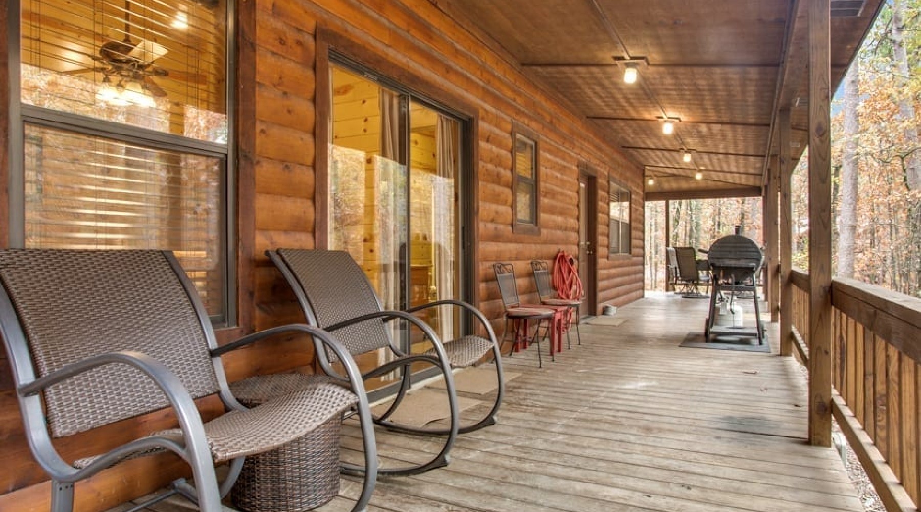 The Whispering Pines Cabin has large covered decks, furnished with rockers and multiple sitting areas, to allow enjoyment of the wooded area surrounding the cabin. A gas grill, outdoor seating along with a 4–5-person hot tub sits close by. Off of the deck, on the graveled area a circular stone fire pit provides space for a campfire so don’t forget the marshmallows!