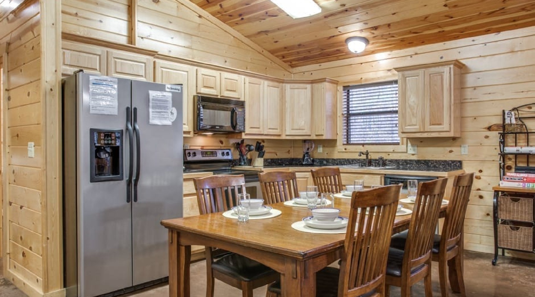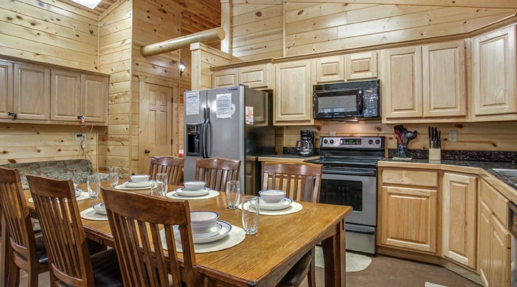 The Whispering Pines Cabin offers a fully furnished kitchen with rich granite countertops and modern appliances. The cabin includes a side-by-side refrigerator, electric range, microwave, and dishwasher. Cookware and serving ware are provided for preparation and eating of meals at the cabin.