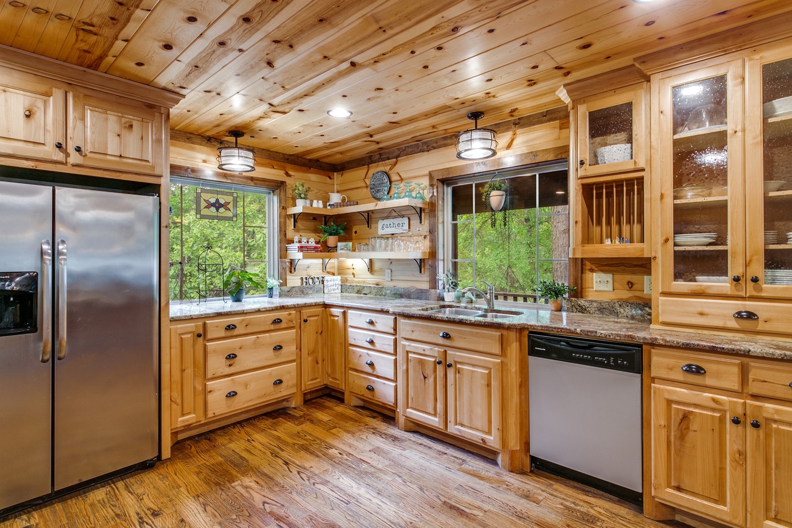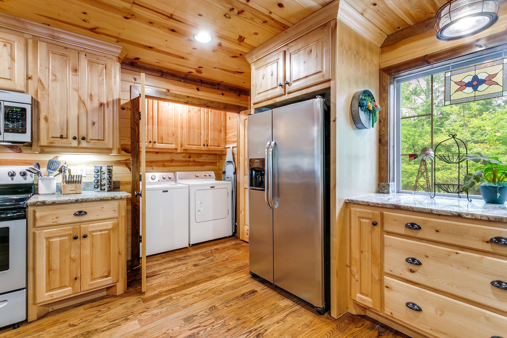 Windmill Escape has a large fully equipped kitchen with modern appliances. Beautiful custom cabinets hold all the necessary items for your culinary needs. You just bring the food.