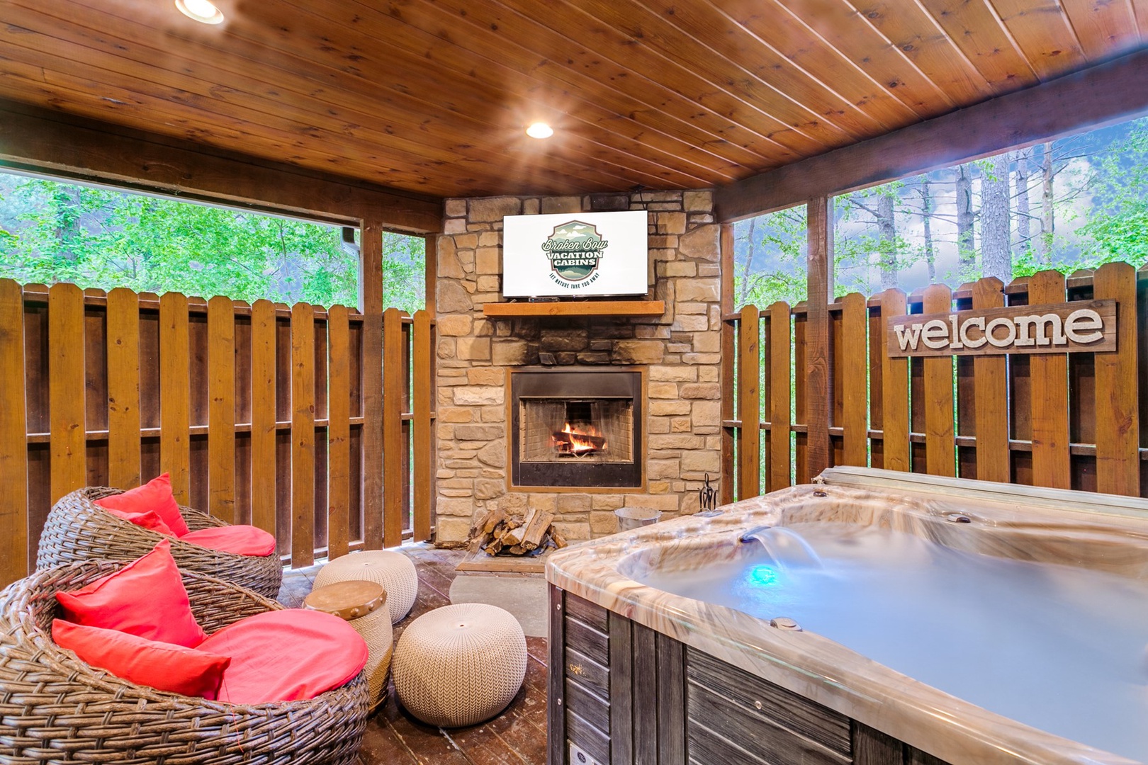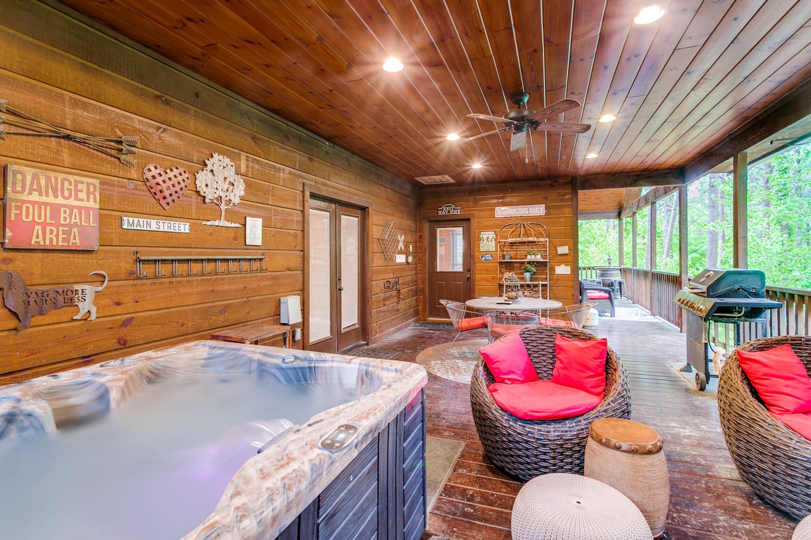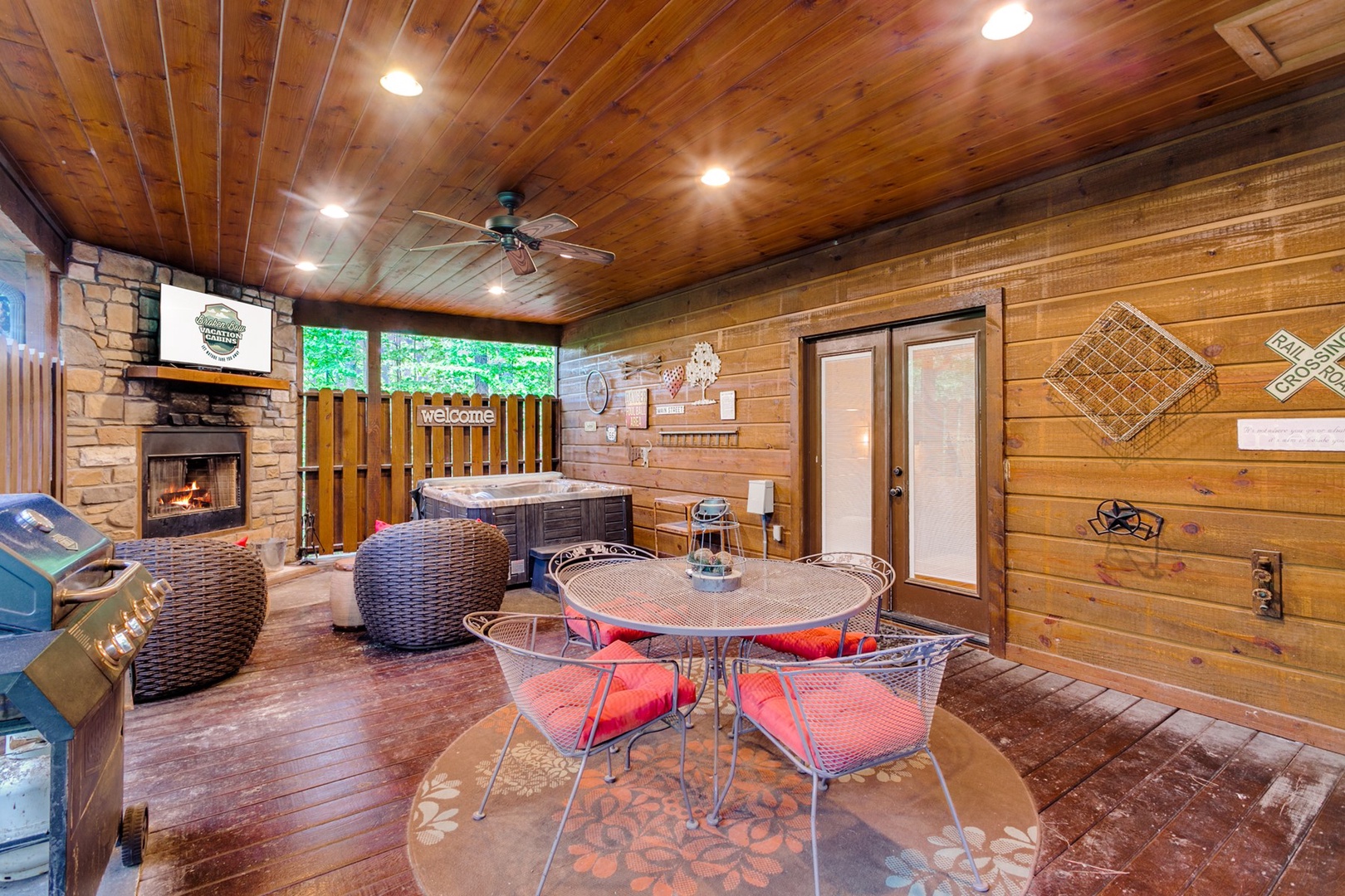 From the bedroom, French doors lead to the covered outdoor deck which is perfect for grilling or dining alfresco. A propane grill (propane provided), cornhole, and Jenga games are available. Or, just unwind in one of the cozy patio chairs in front of a wood burning fireplace where you can watch movies on a large HDTV. Better yet, relax and watch TV in the hot tub.