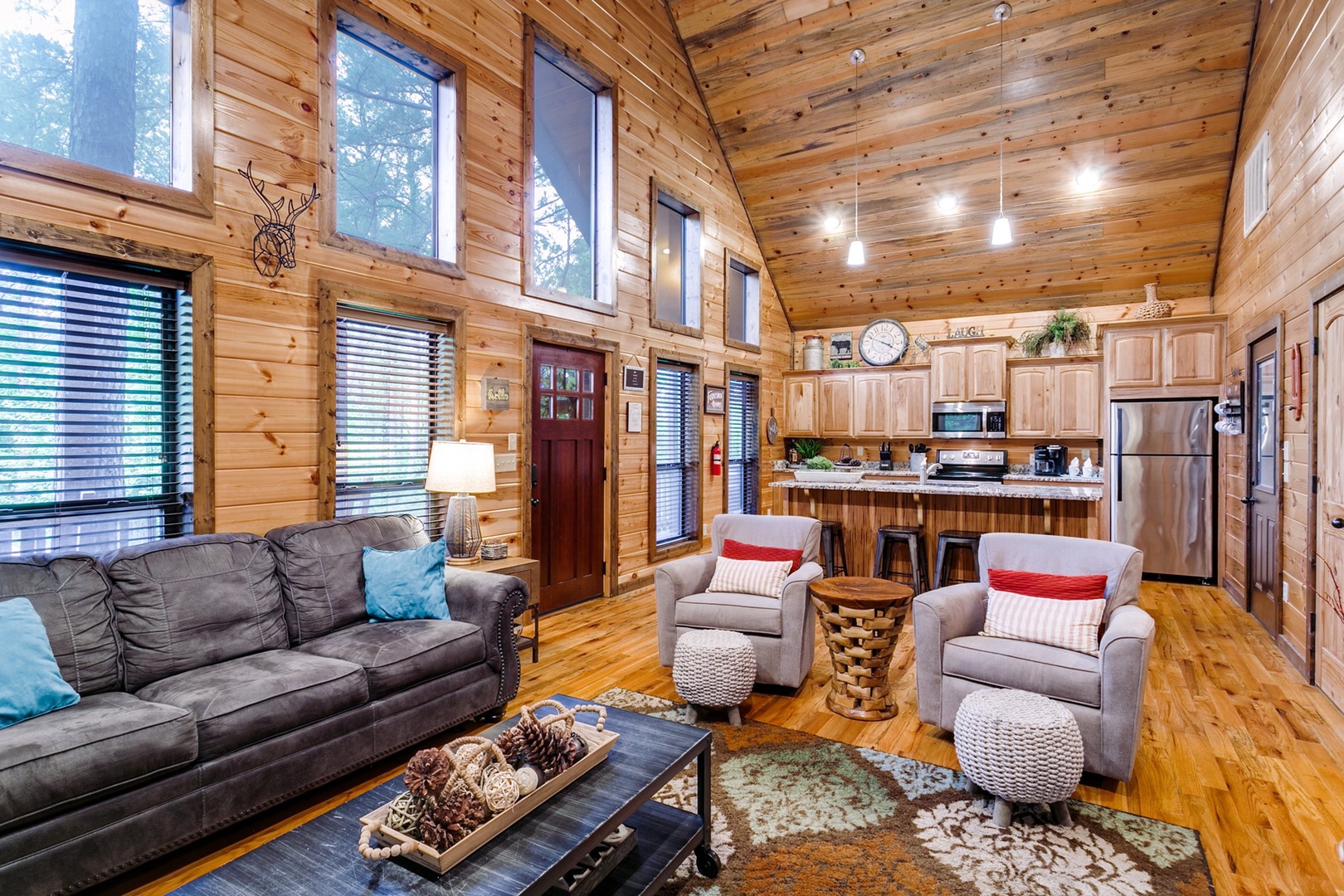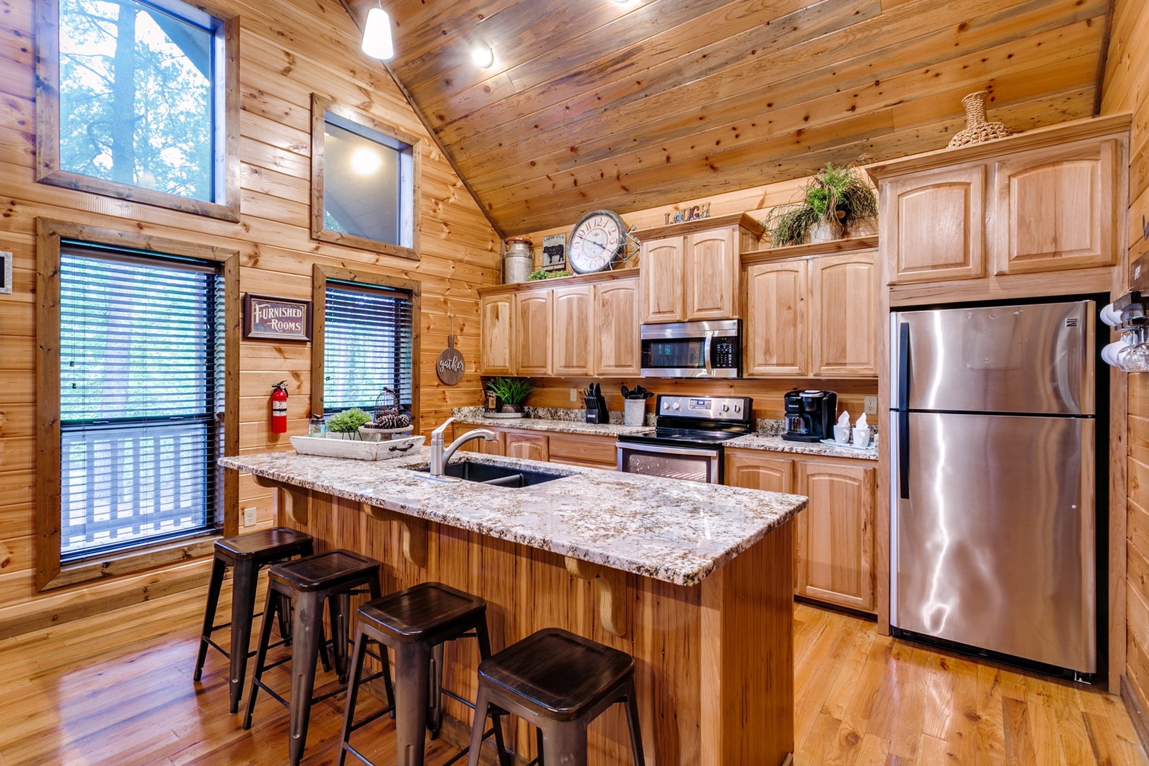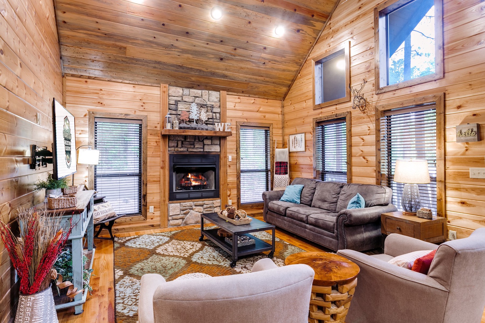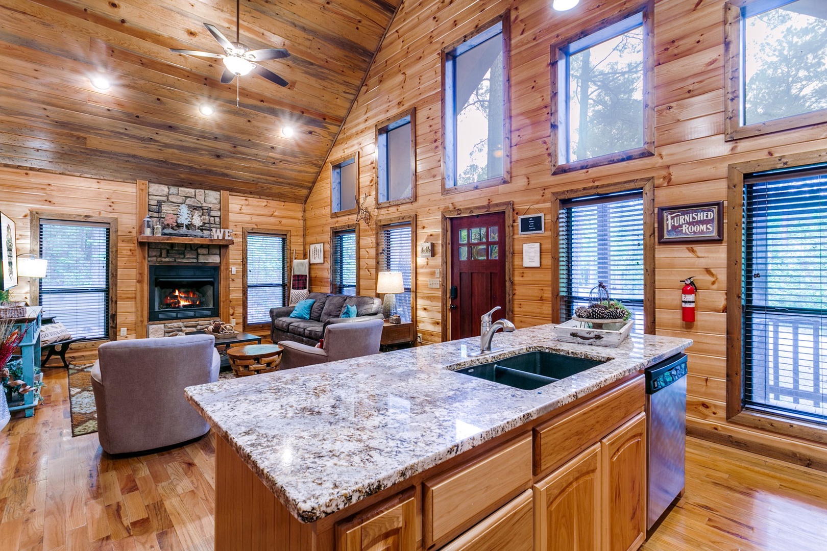 The open concept living room is furnished with modern amenities to ensure a perfect stay. Relax in the cozy living area, complete with a comfortable sofa that transforms into a queen sleeper. A half bath is in the living area for added convenience. A rock gas burning fireplace (seasonal Oct 15-April 15) adds to this relaxing warm and romantic atmosphere. Enjoy your favorite shows on the HDTV which allow you to connect to your favorite streaming apps. Kick back and relax!