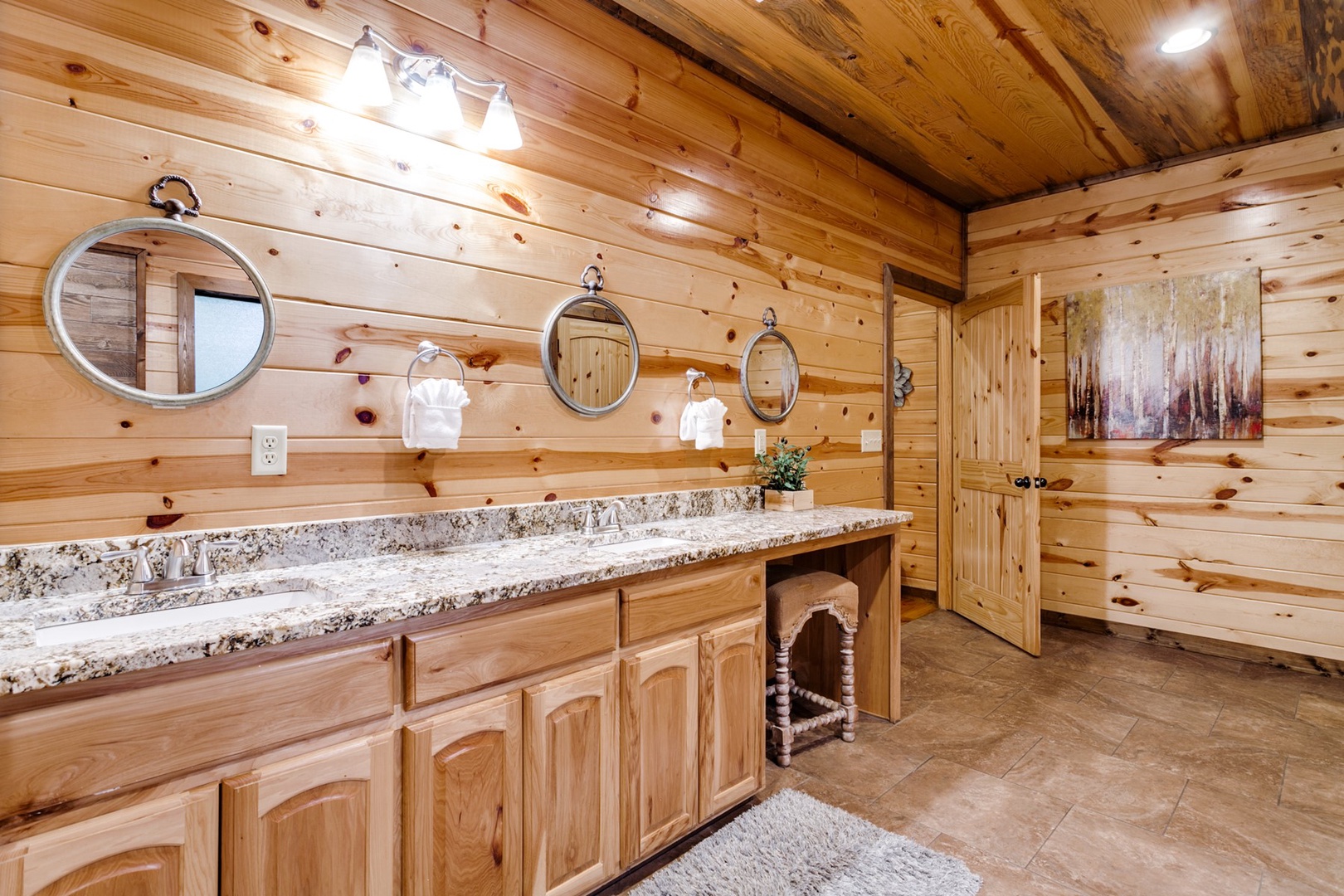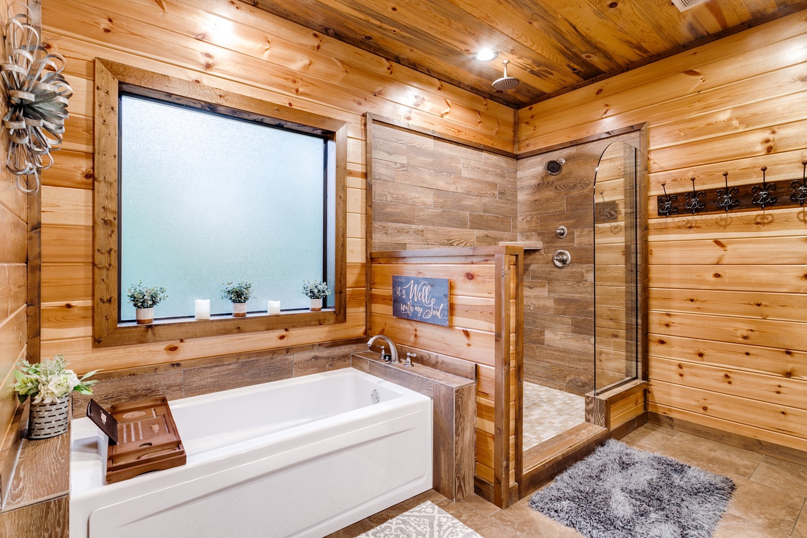 The large luxurious bedroom suite features a custom made king sized bed covered in soft linens. Under the wall mounted TV is a dresser containing board games. Inside the closet you will find 2 monogrammed "Woodland Escape" robes to add that spa feeling! Relax and unwind in one of the plush chase lounges!
