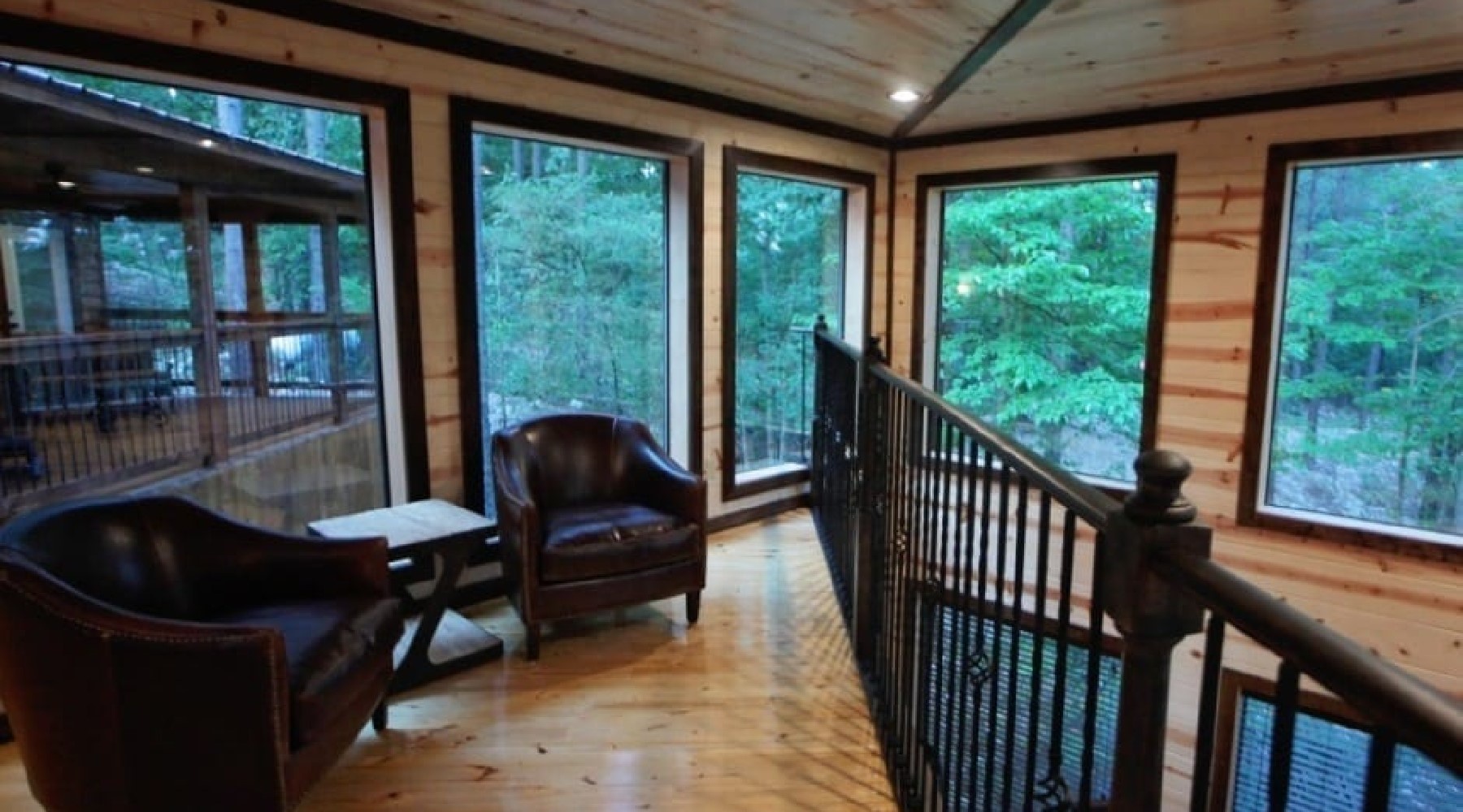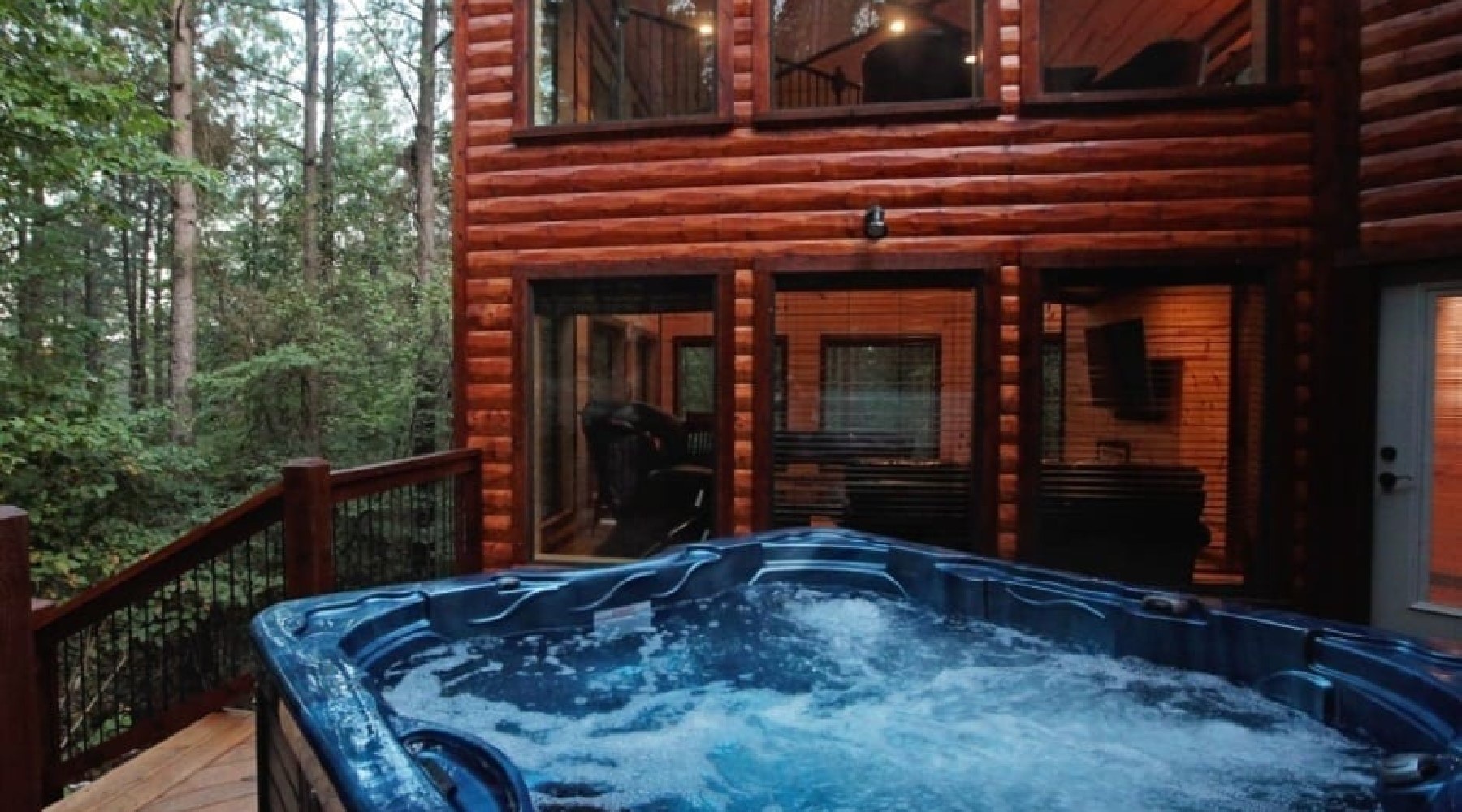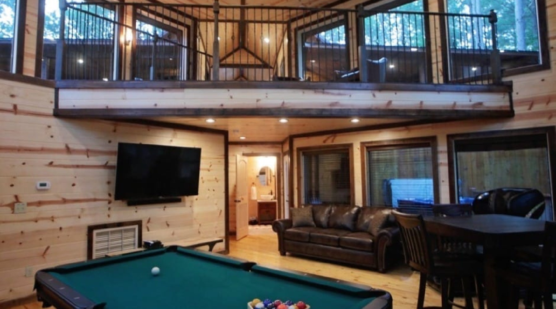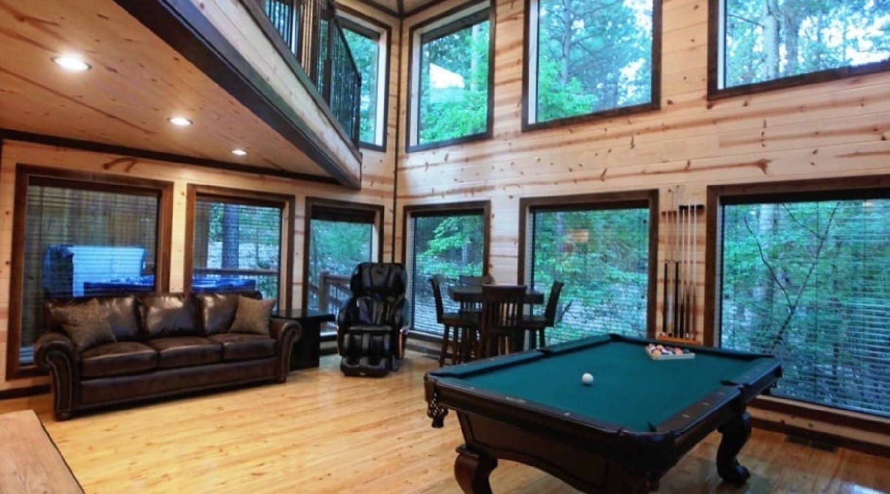 Diamond Point is a 2-bedroom master suite luxury cabin, completed in August 2016. The rustic exterior of the cabin blends nicely with the wooded surroundings. Once you open the door and step in you will be awestruck. The cabin is furnished with luxury and no detail has been overlooked in order to provide a relaxing, pampered getaway. You will be immediately drawn through the vaulted living space to the loft, where you will look down into a 2 story “diamond solarium” game room. The 21 large window solarium provides a 270-degree view of trees and occasional wildlife, placing you in the thick of the woods, while at the same time enjoying the comforts of the indoors. As you follow the steps downstairs you enter the game room where you can play a game of pool or be pampered head to foot in the full body massage chair. From the game room step out onto the spa deck and indulge in the large 6-person hot tub.