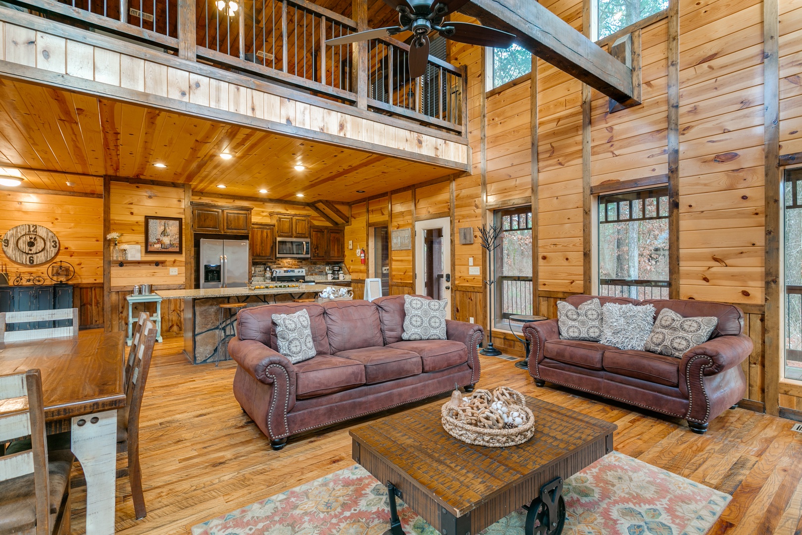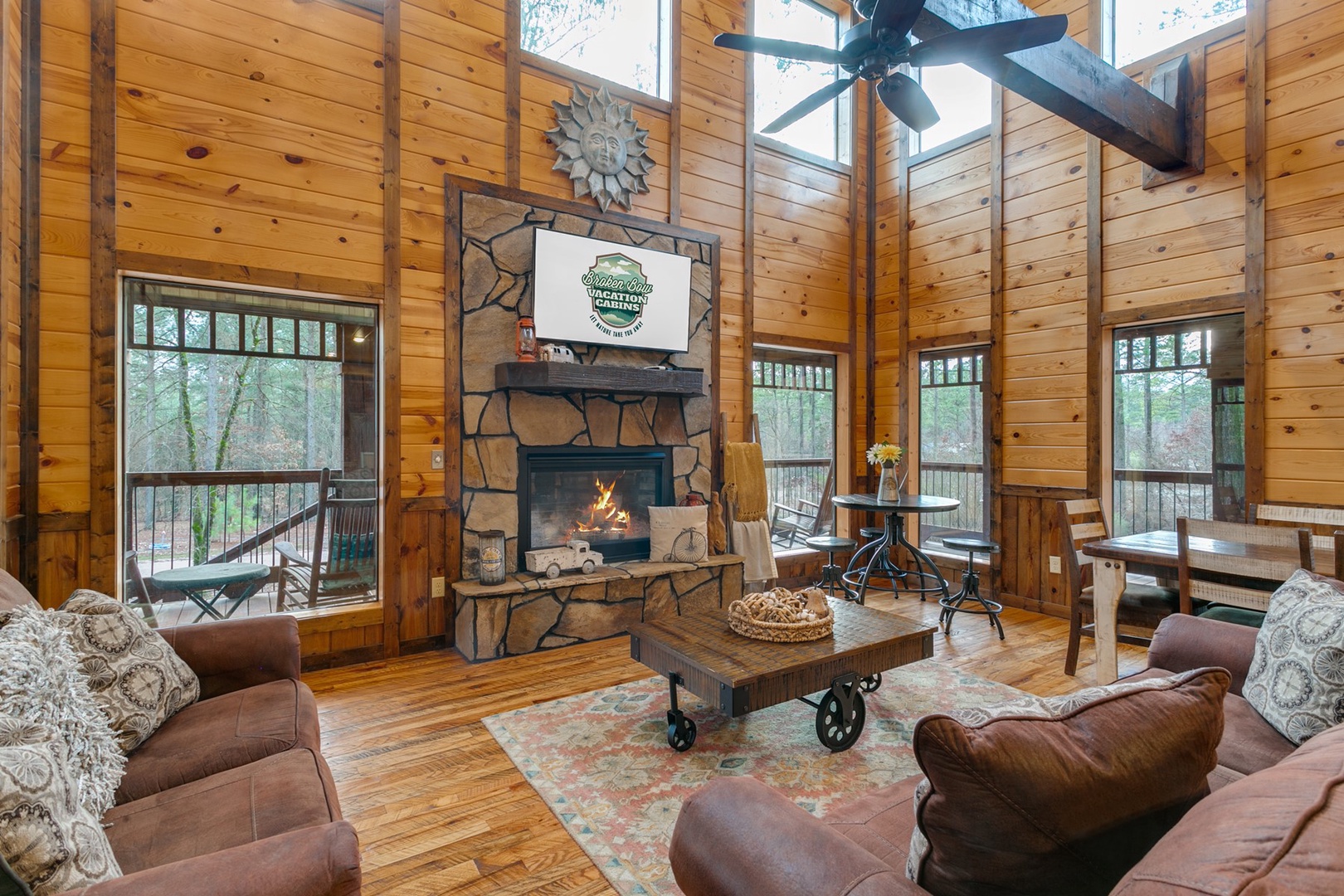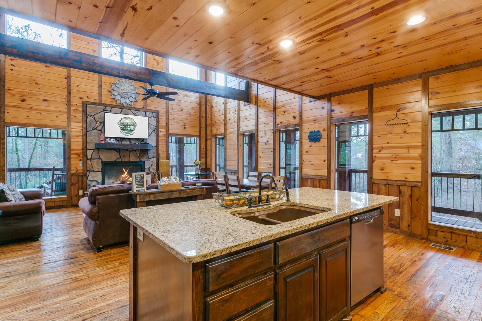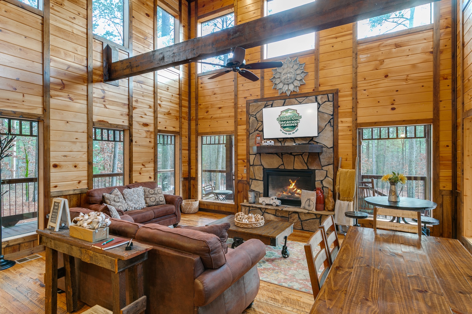This two-story cabin has an open floor plan for the kitchen and living area. Floor to ceiling windows look out onto the wooded grounds bringing natural light to the rooms.