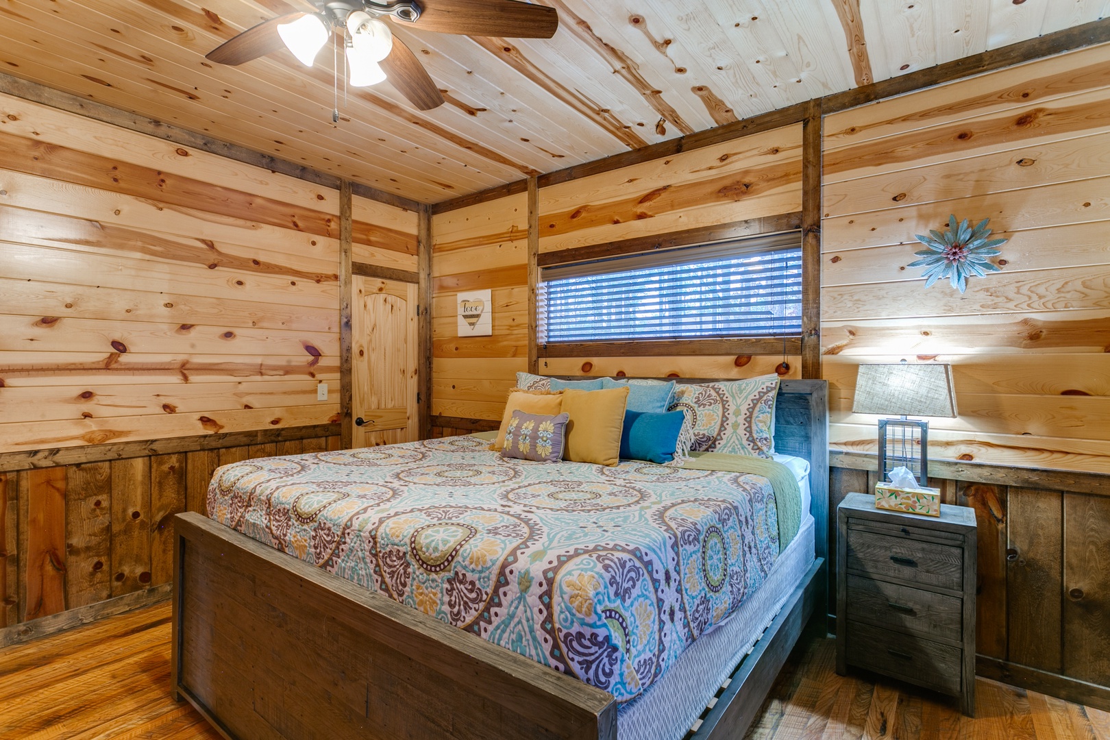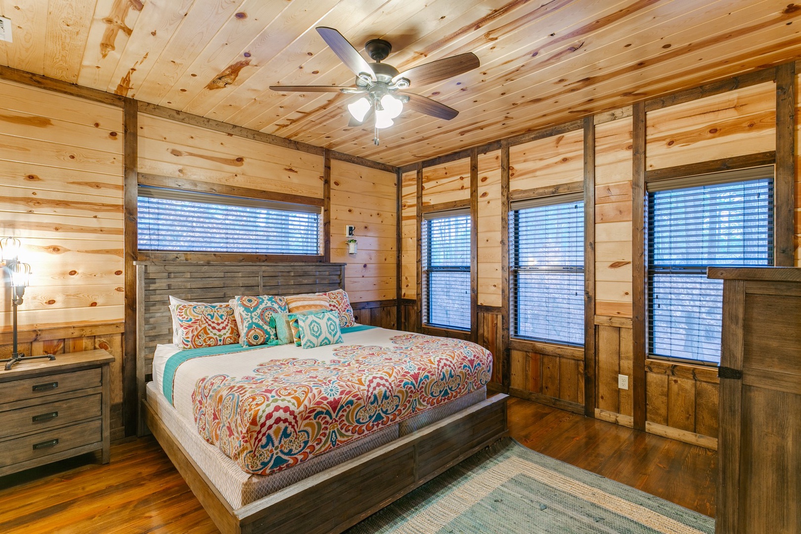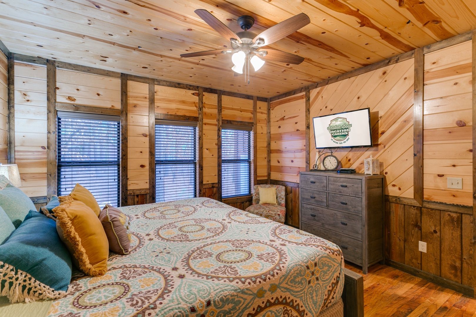 The first-floor bedroom suite is located at the back of the cabin giving an extra sense of privacy. The room is furnished with a king size bed wrapped in luxury linens. There is an HDTV for your viewing. The attached bathroom has a walk-in tiled shower.
