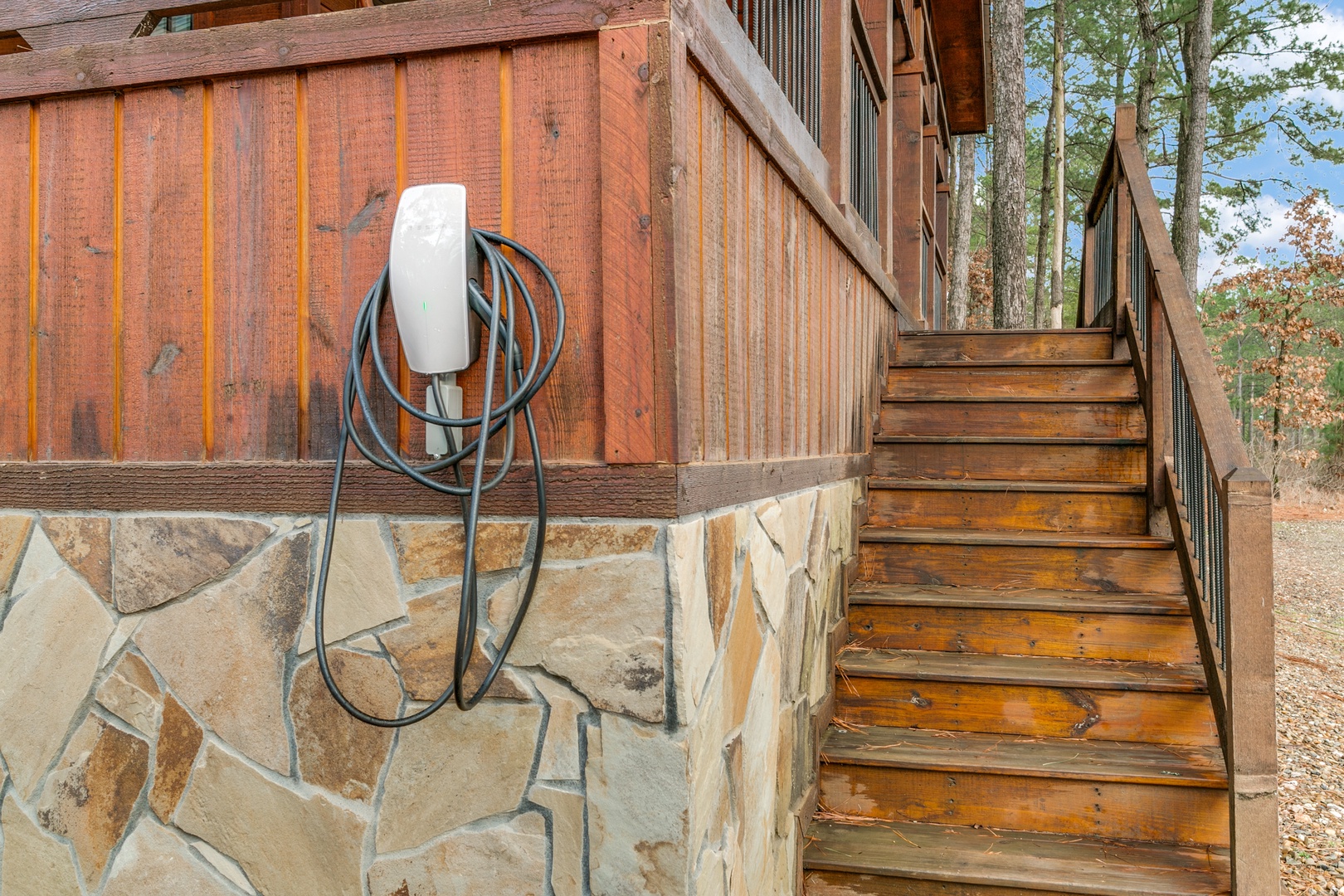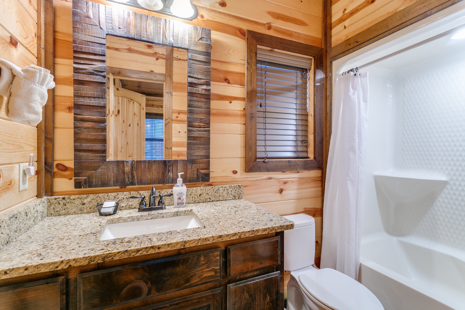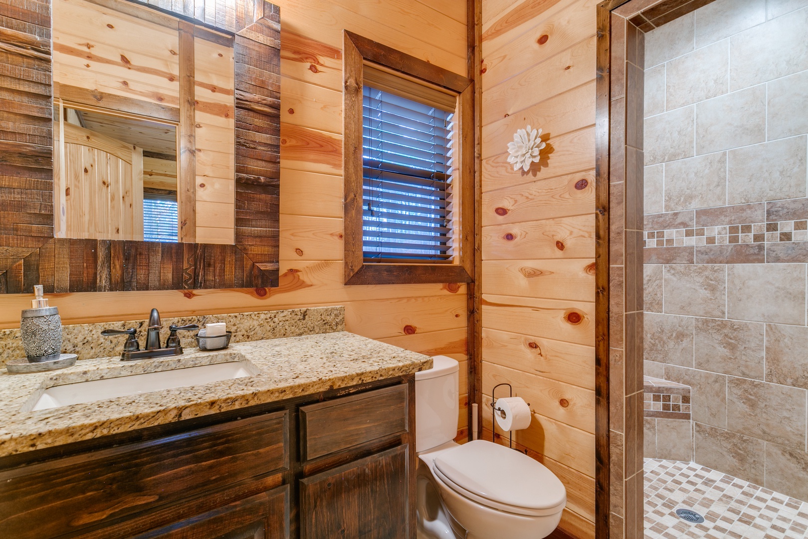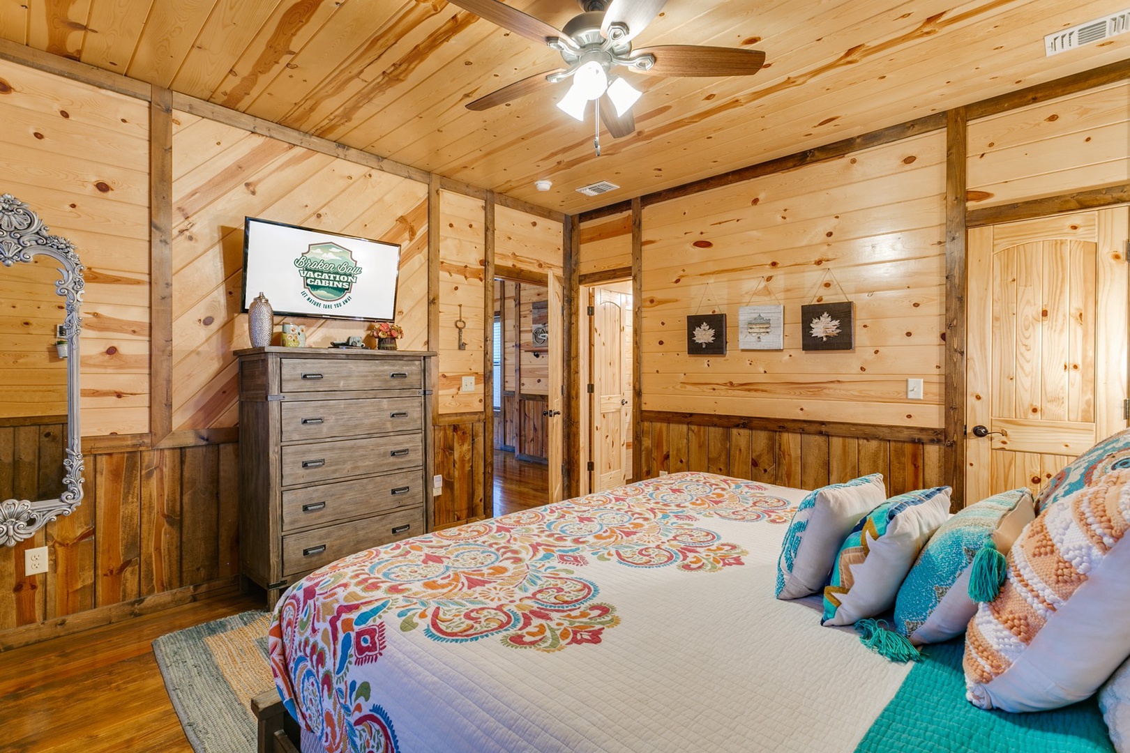 The first-floor bedroom suite is located at the back of the cabin giving an extra sense of privacy. The room is furnished with a king size bed wrapped in luxury linens. There is an HDTV for your viewing. The attached bathroom has a walk-in tiled shower.