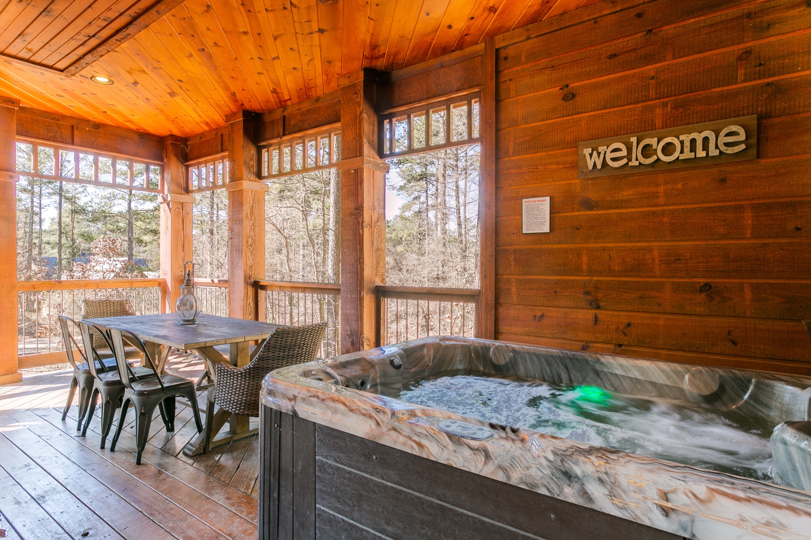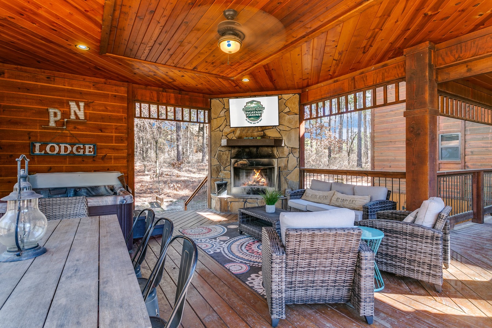 Outdoor veranda porch with dining table, sectional sofa, HDTV and hot tub