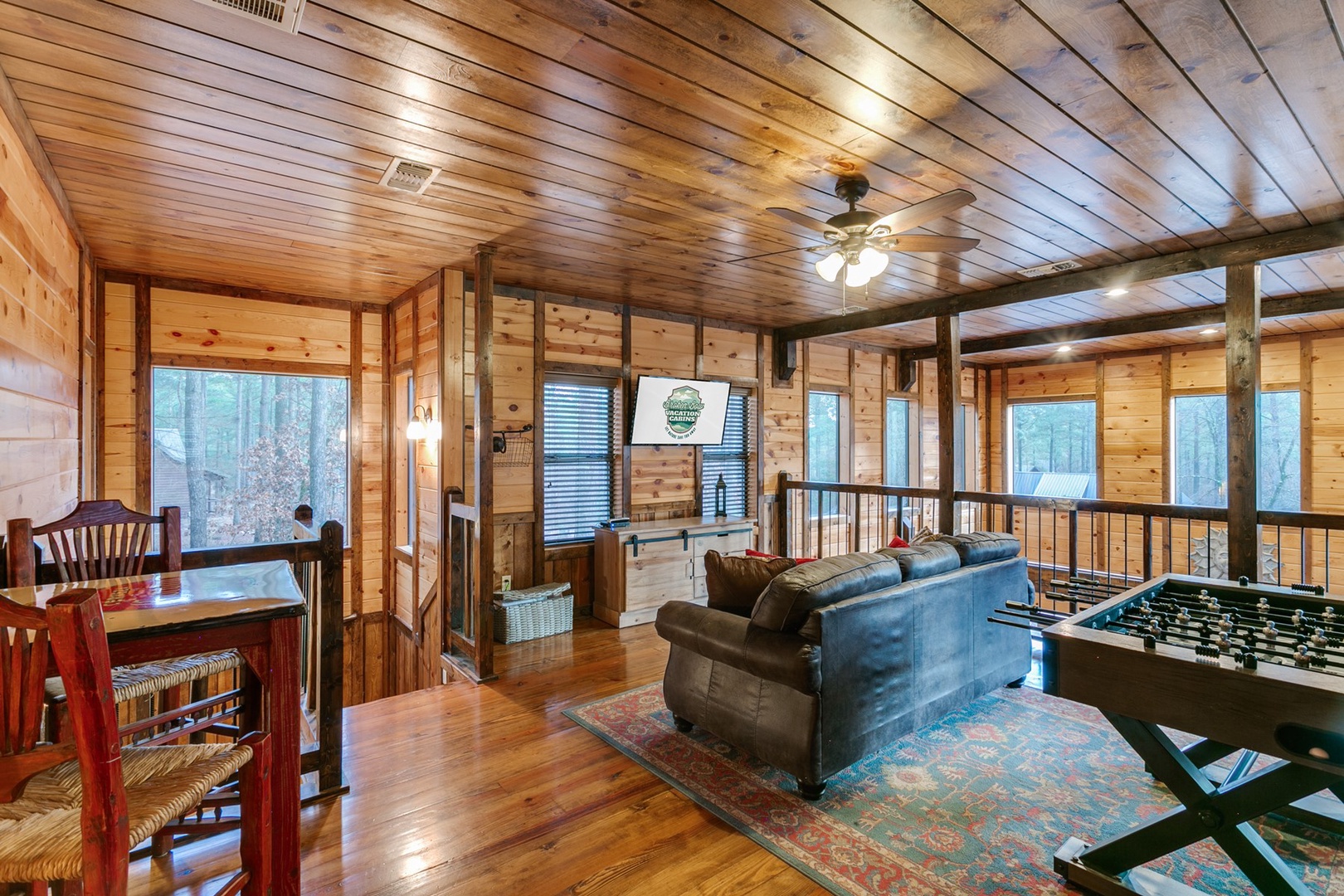 Go up the red oak staircase to find a spacious balcony area. In this room you can enjoy a game of Foosball or watching a movie on the HDTV/Blue-Ray DVD player. There is a lavatory located in this area for added convenience.