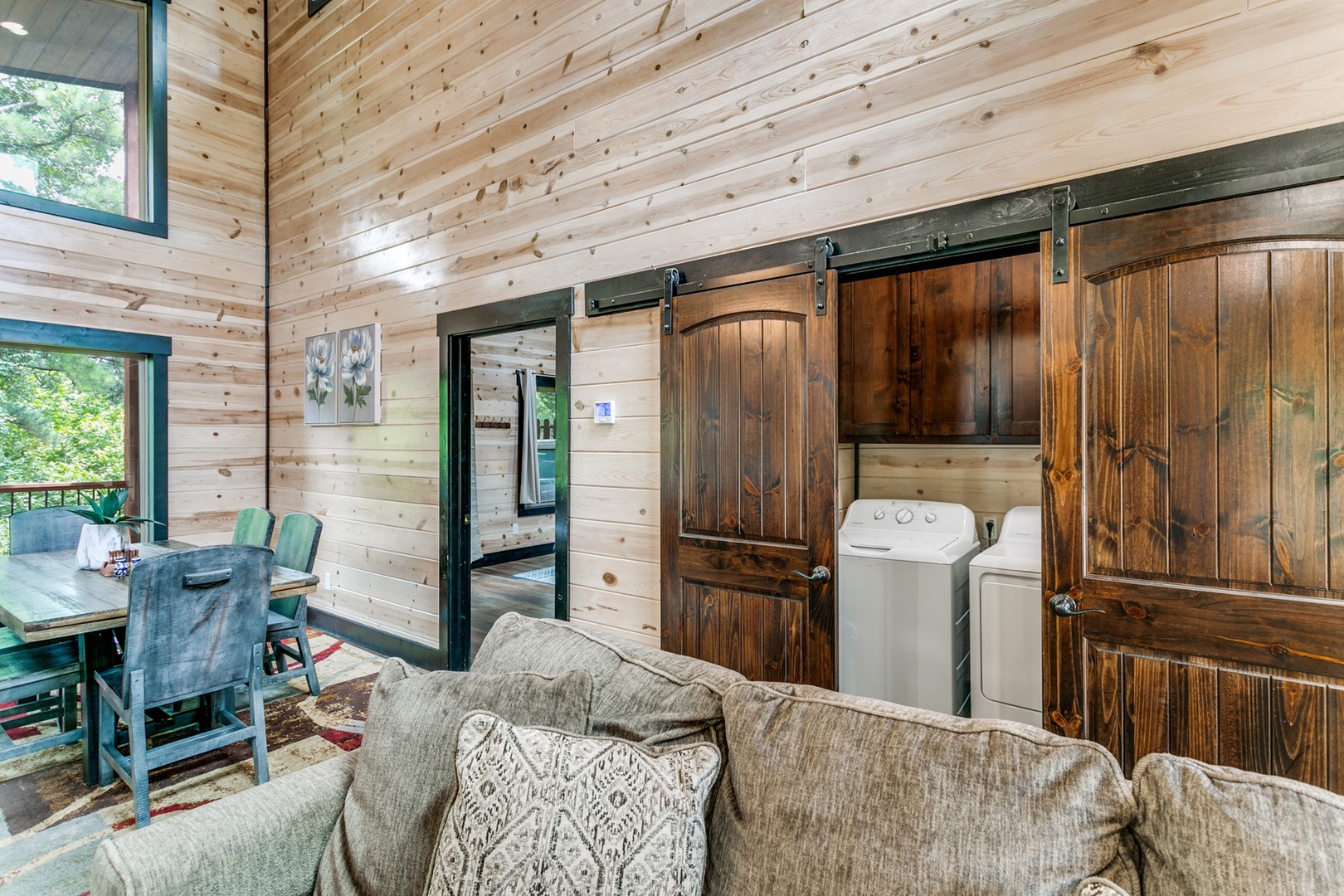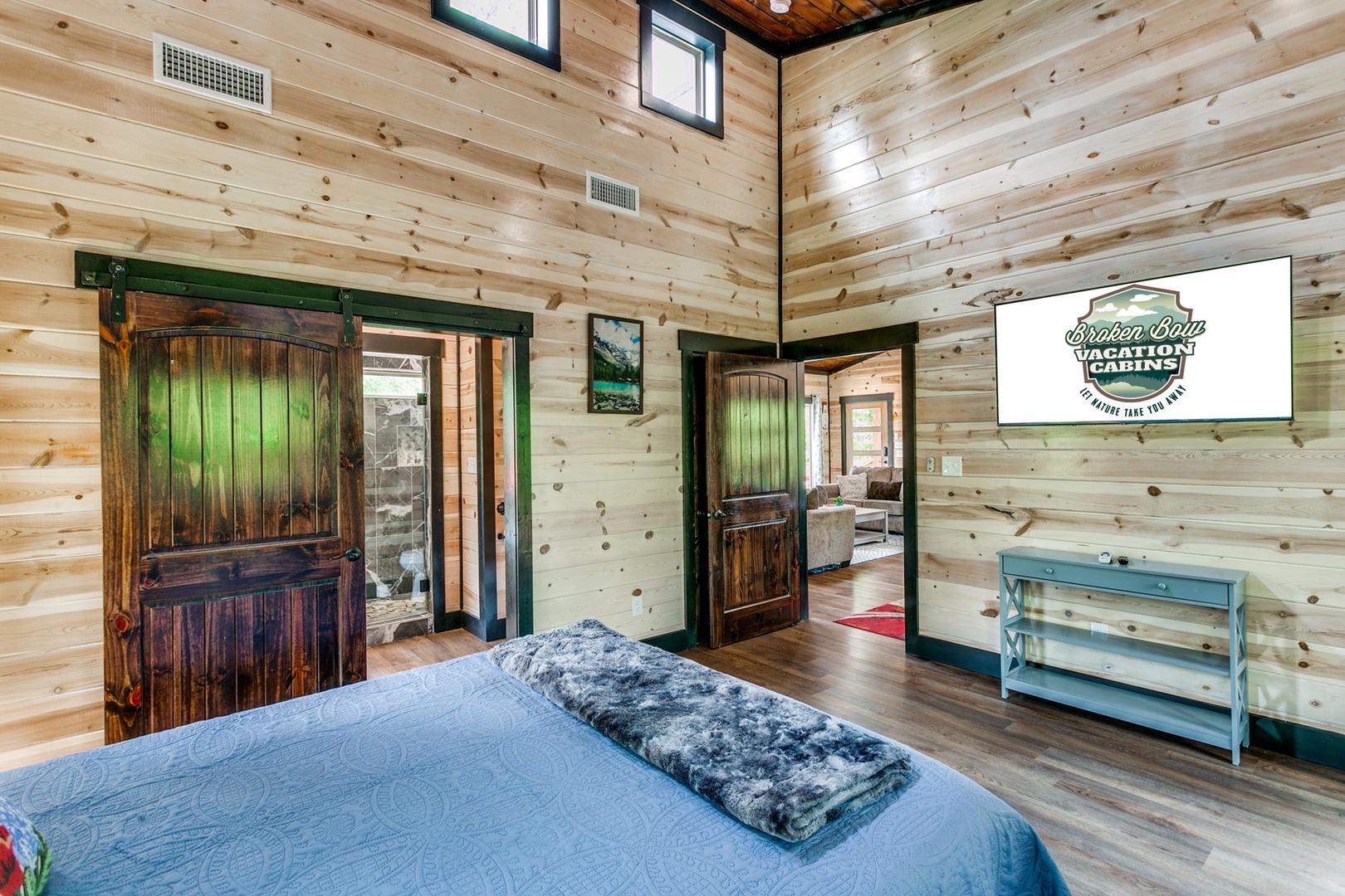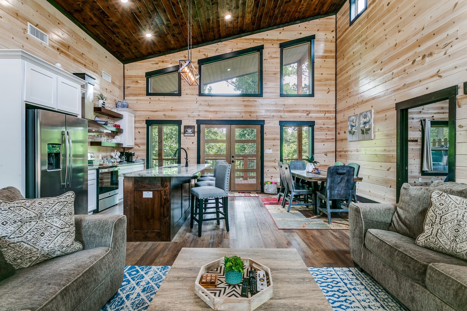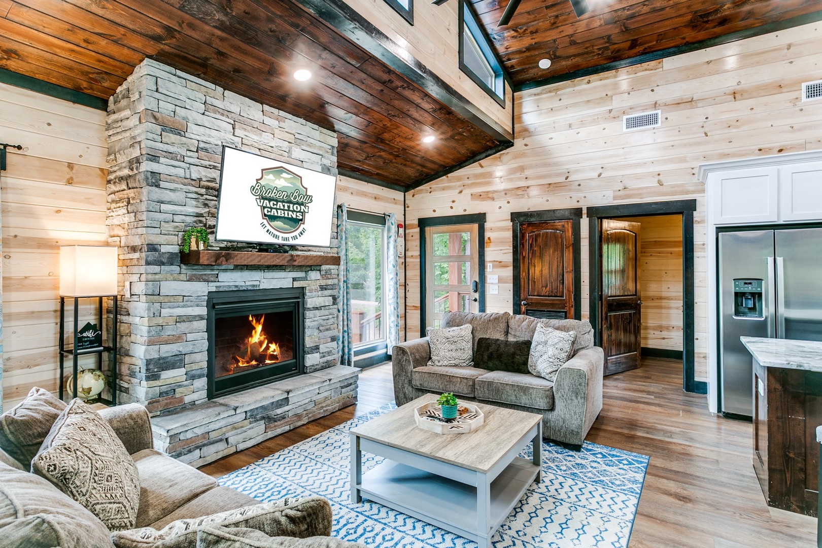 The Polaris cabin is a 2 bedroom that can accommodate up to 6 guests. The main area is an open concept that includes the living, kitchen and dining areas. The living area has seating of a sofa ( pulls out to make a queen sleeper), and love seat in front of the gas log fireplace (seasonal October- April). There is a timer switch on the side wall to ignite the logs. The TV is also mounted on the hearth and is equipped with streaming ability.