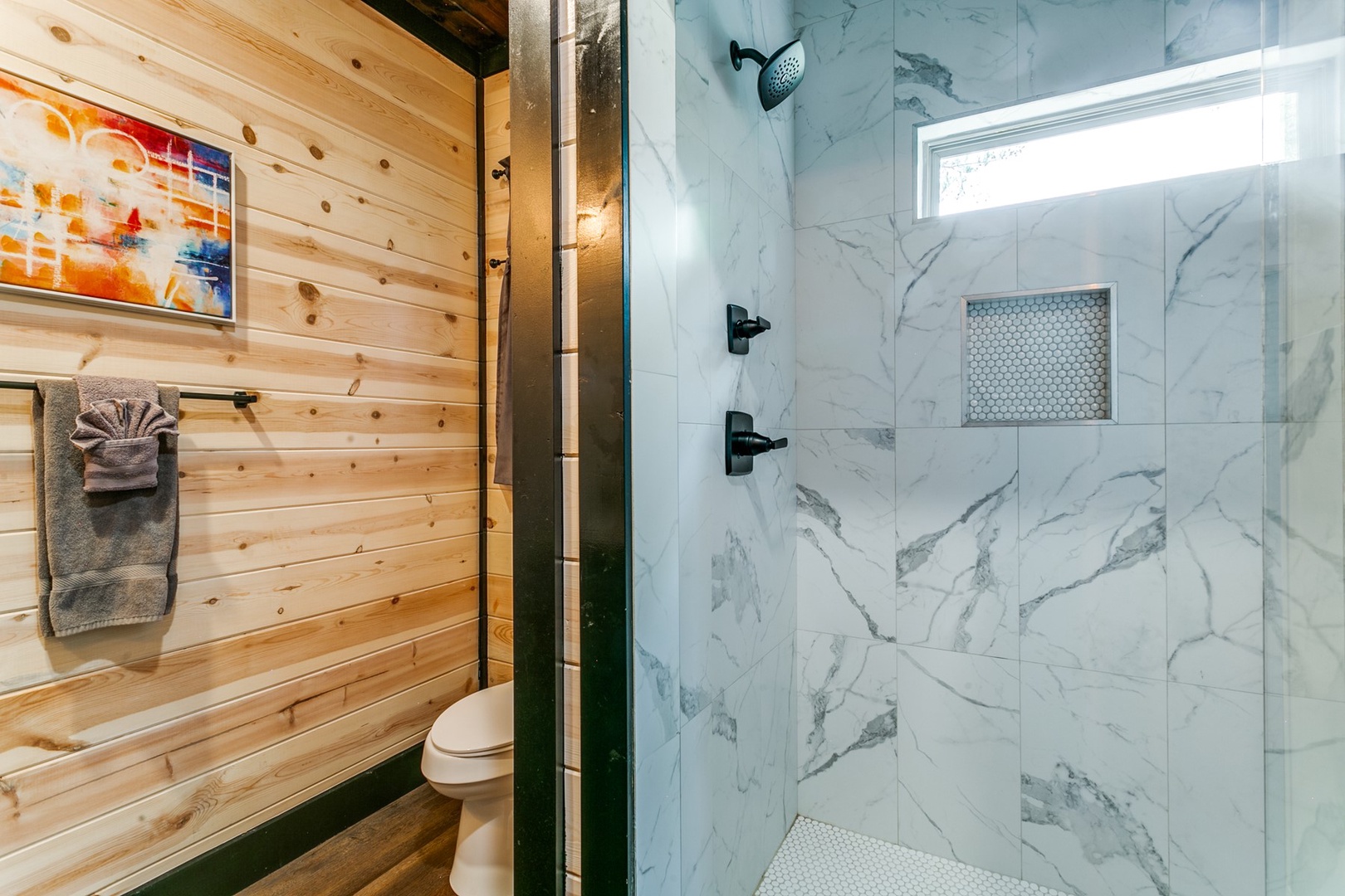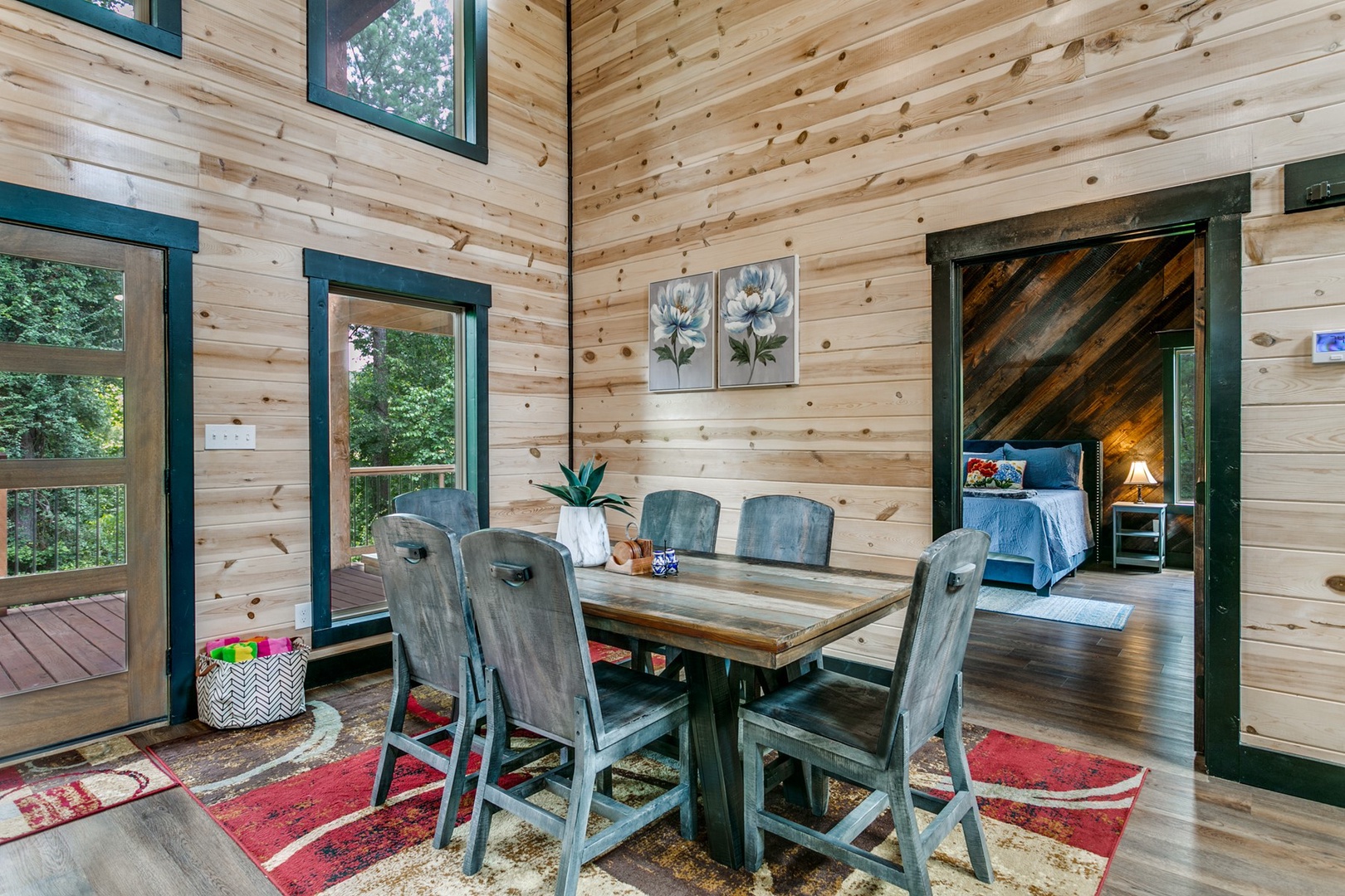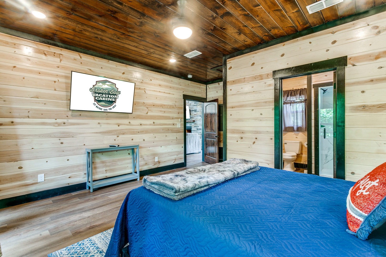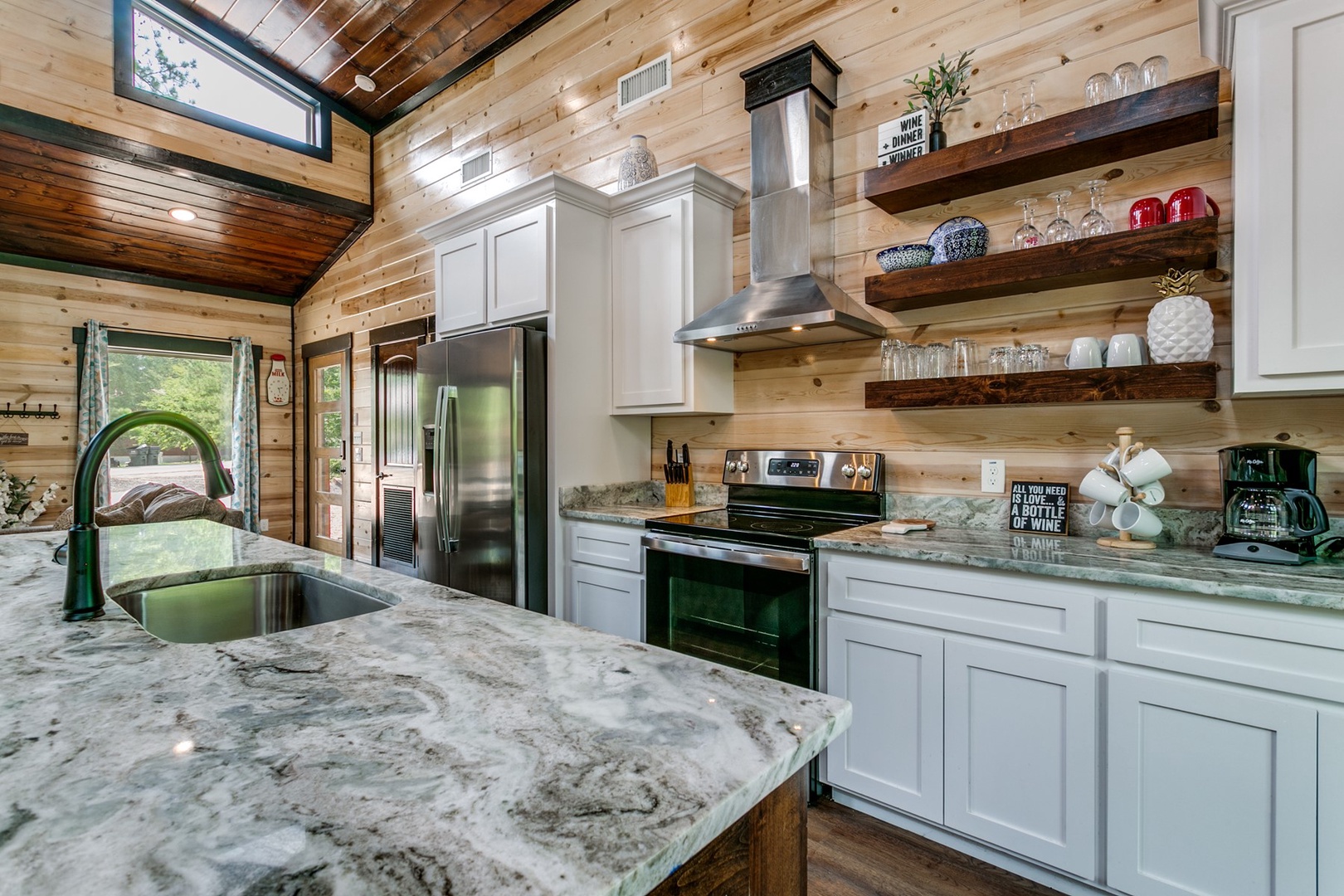 The Polaris cabin is a 2 bedroom that can accommodate up to 6 guests. The main area is an open concept that includes the living, kitchen and dining areas. The living area has seating of a sofa ( pulls out to make a queen sleeper), and love seat in front of the gas log fireplace (seasonal October- April). There is a timer switch on the side wall to ignite the logs. The TV is also mounted on the hearth and is equipped with streaming ability.