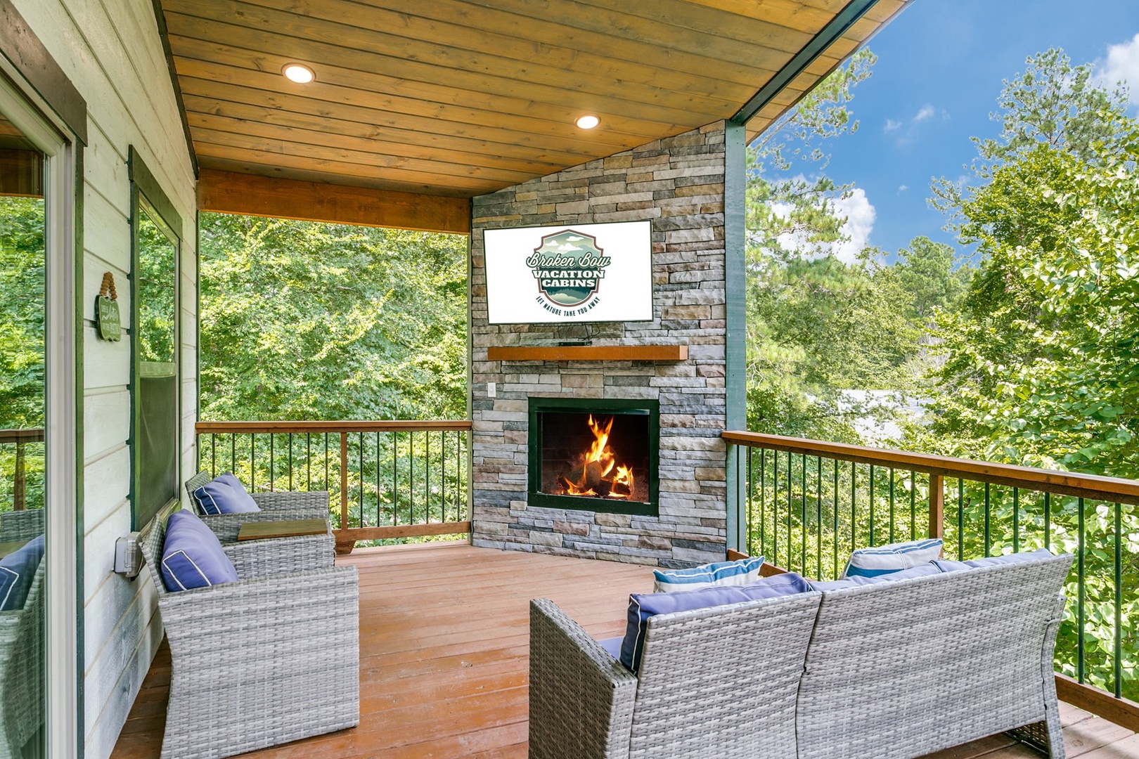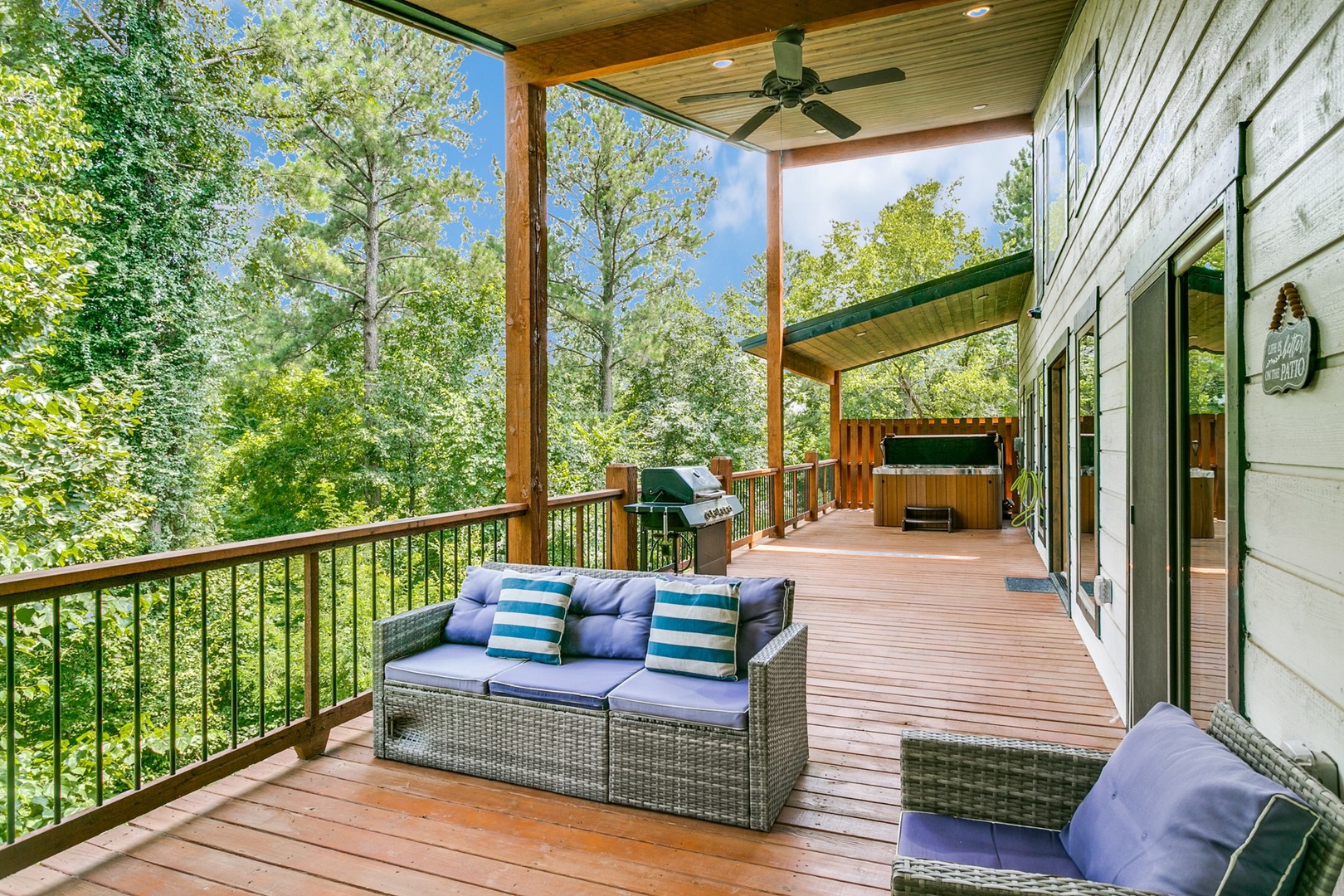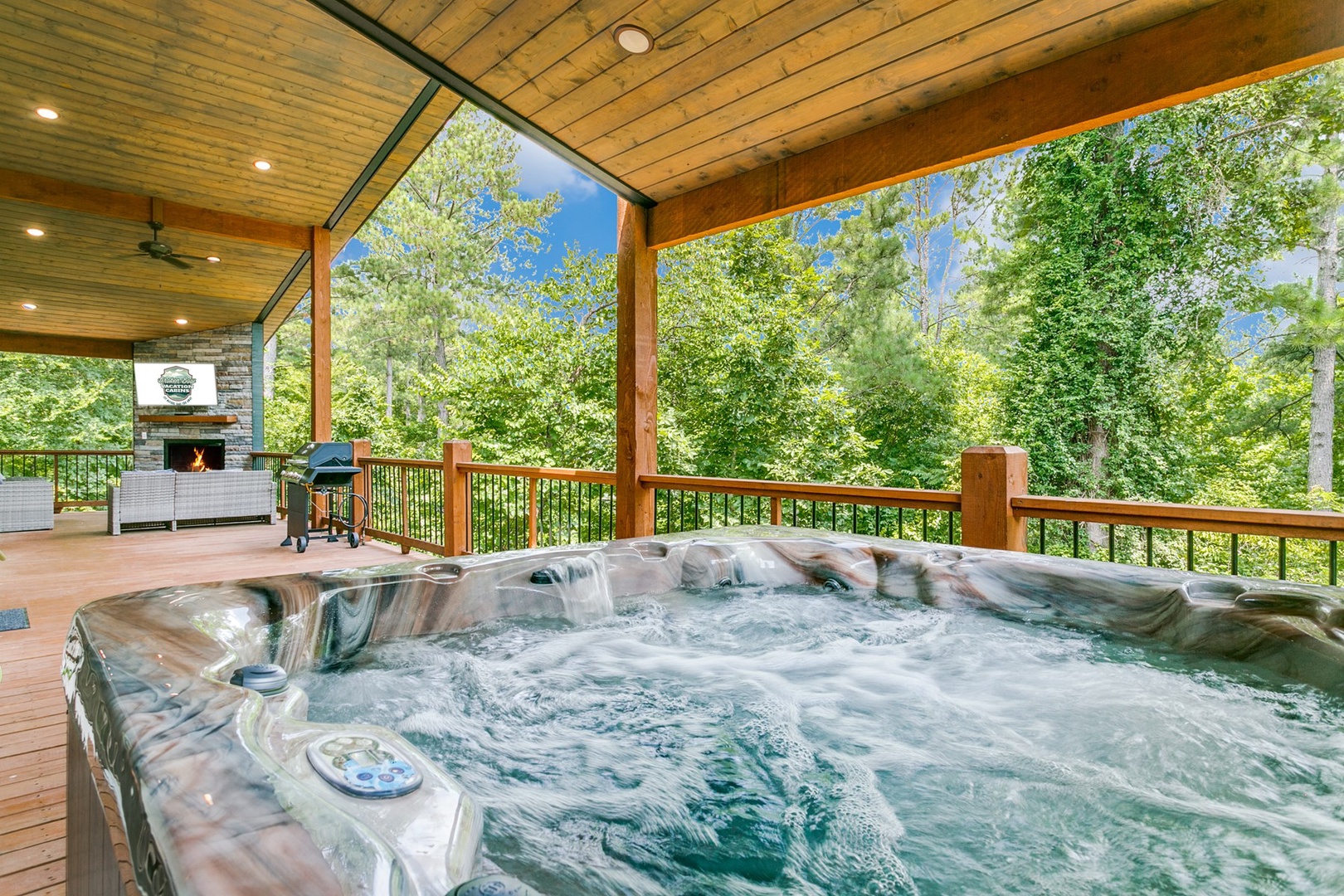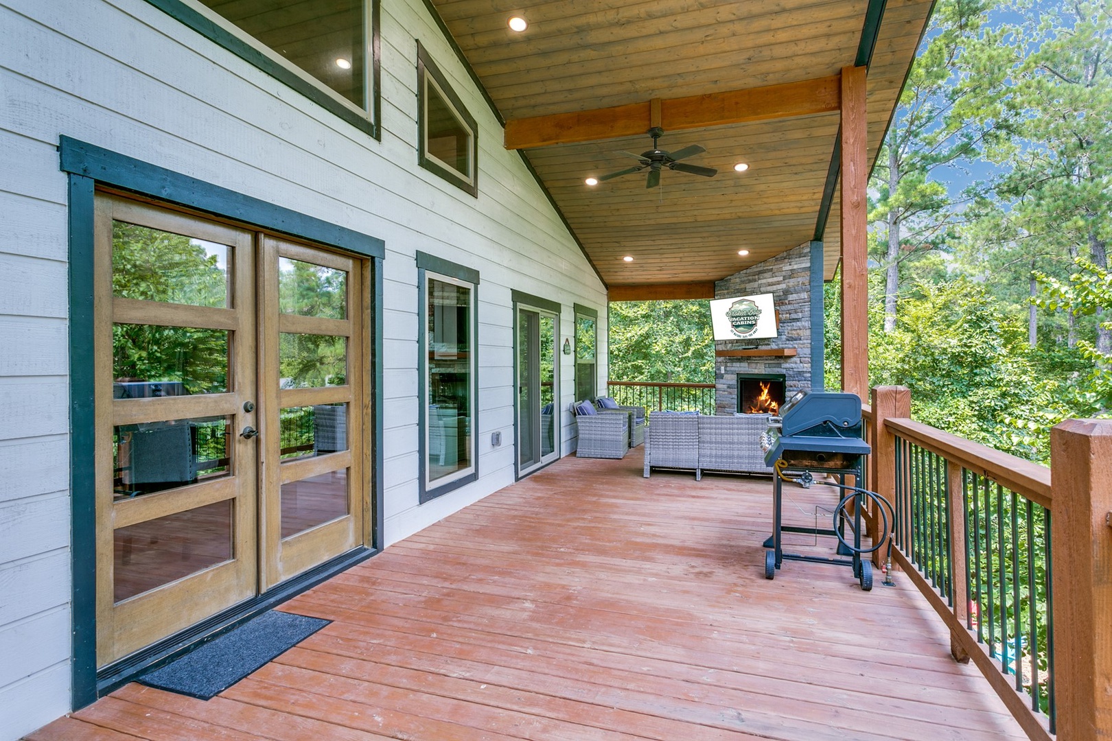 The back porch area can be accessed through both bedrooms as well as the main area. The back looks into the heavily wooded area for added privacy. On the back there is a 6 person hot tub on one end and gas- log fireplace with timer switch on the other end. There is seating in front of the fireplace as well as a TV.