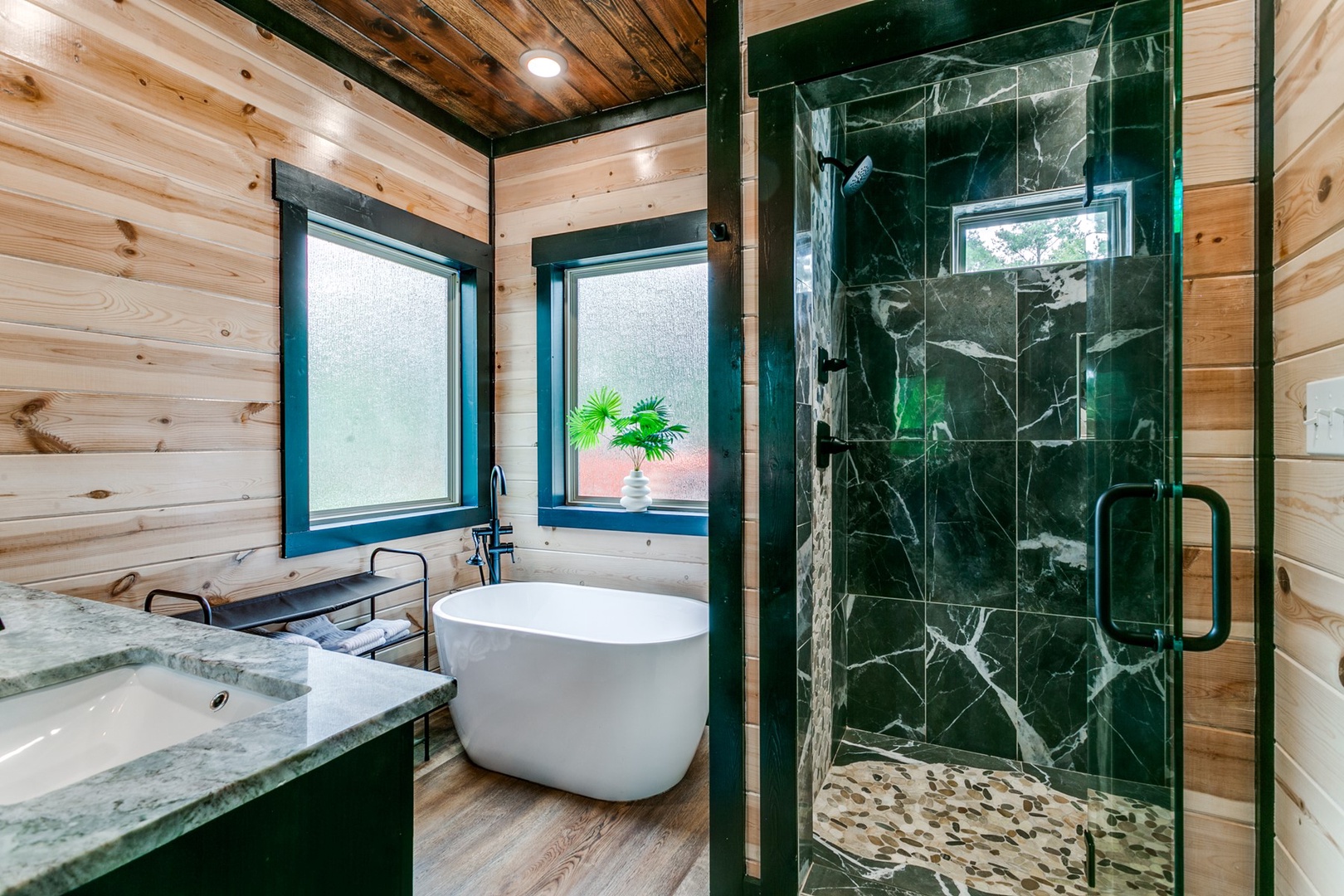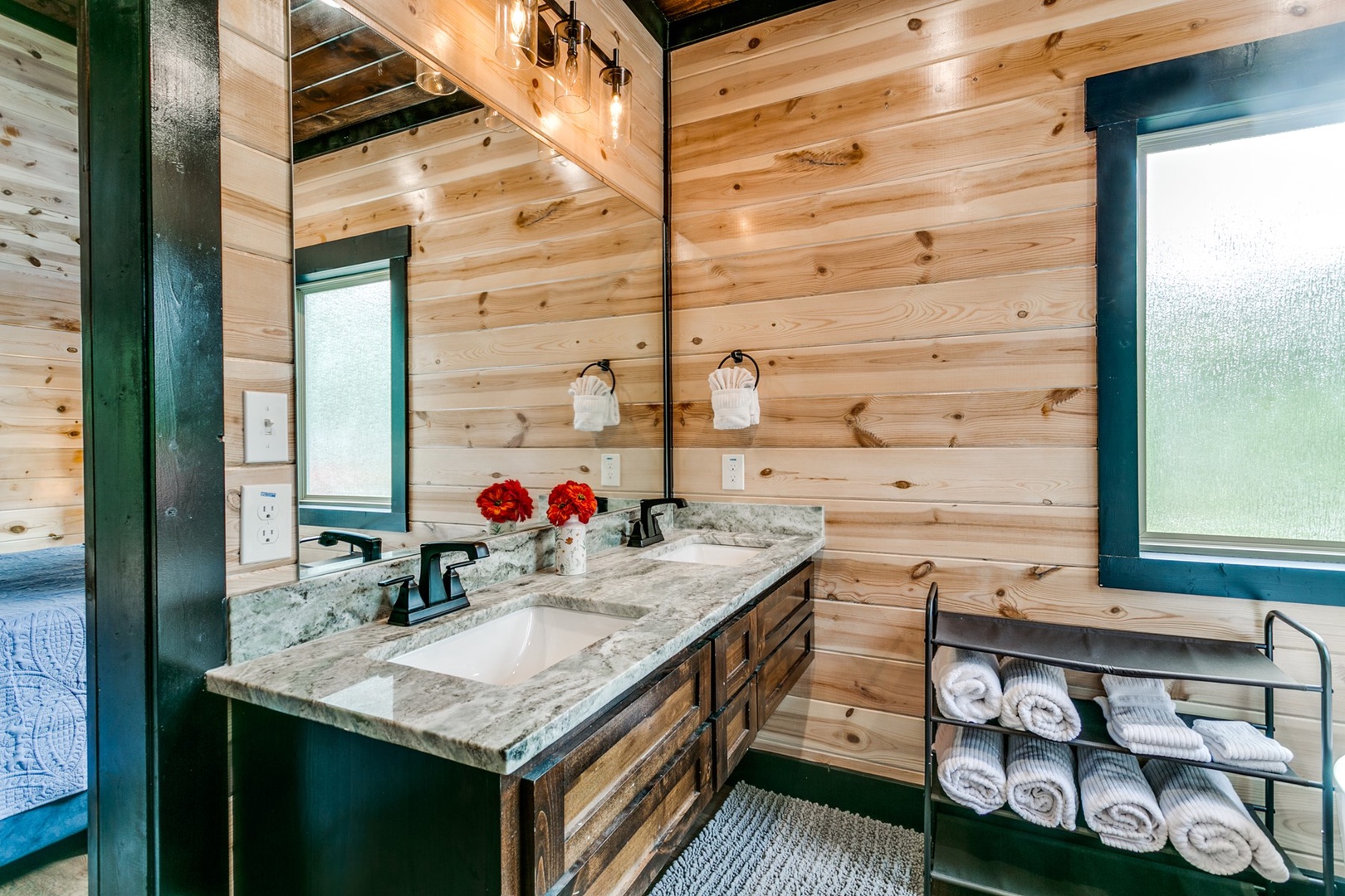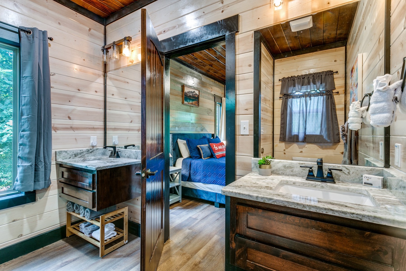 The bedrooms flank each side of the main area. Each has a queen size bed, TV , and a closet for storage of personal items. Each bedroom has a private bath with soak tub, walk-in tile shower and 2 vanities.