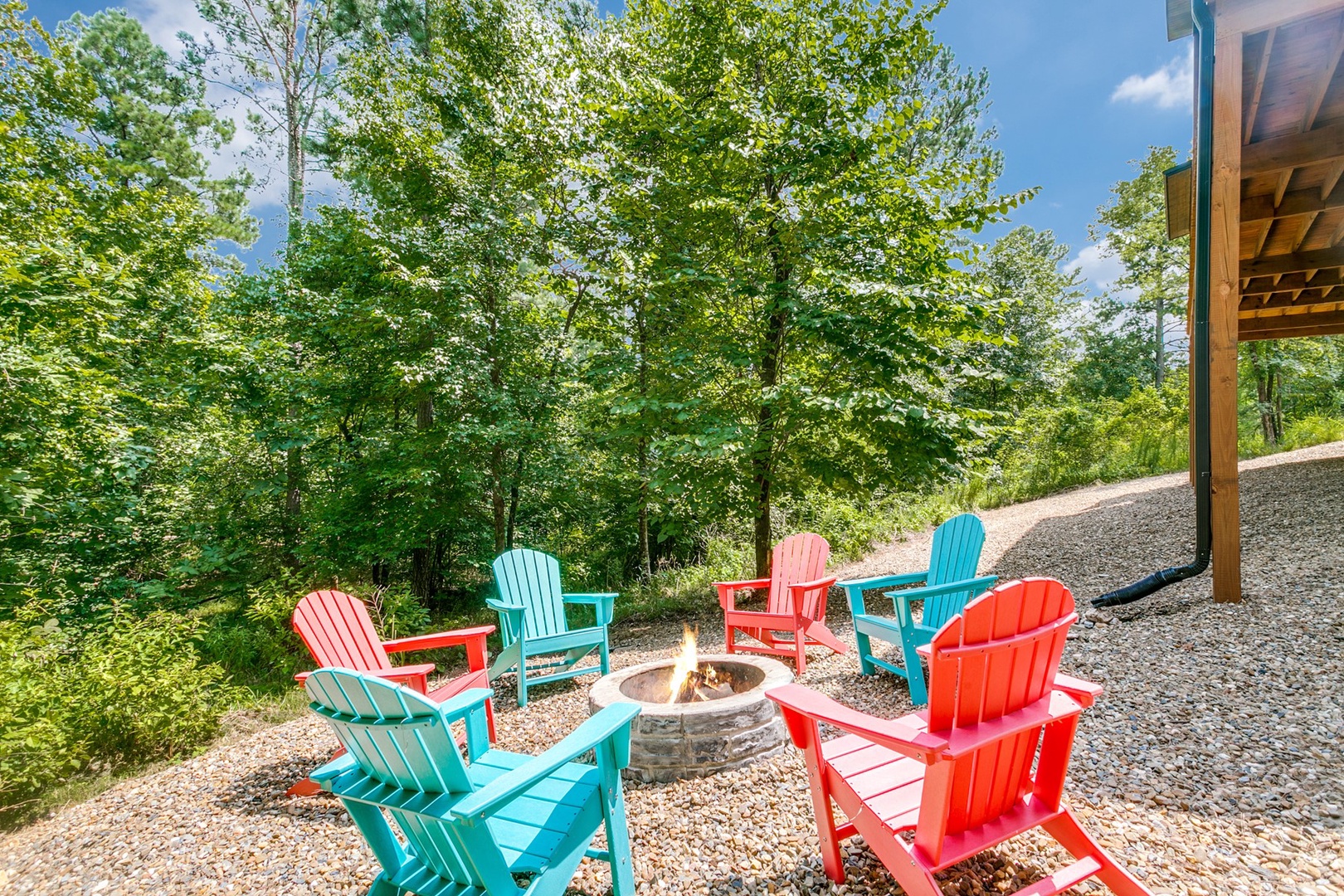 On the grounds out back there is a firepit with Adirondack chairs.