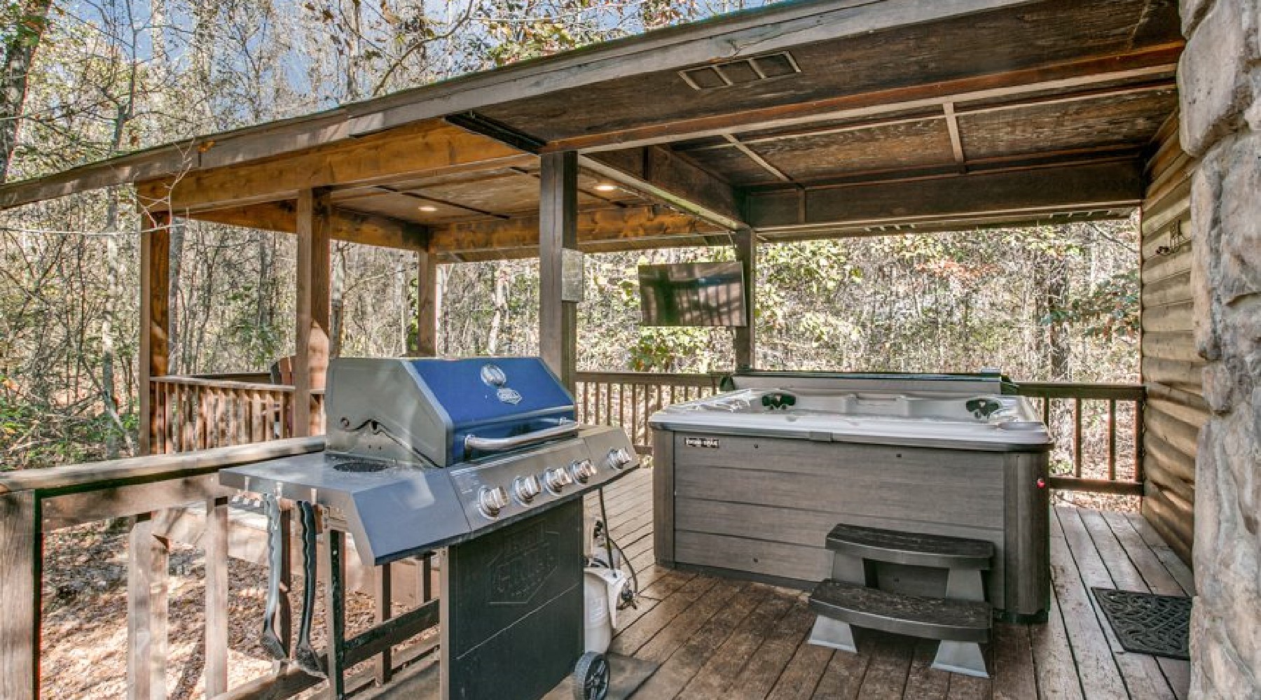 Take a stroll on the deck, adorned with a tall table for four and relax in a private and covered hot tub shadowed by the lofty stone chimney