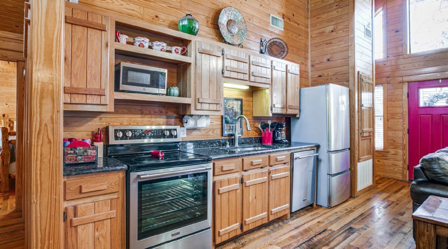 The cherry red front door leads into the common area for living room and kitchen. The kitchen has full size appliances of refrigerator, electric burner stove and dishwasher. There is a 700-watt microwave. The cabinets are stocked with cookware, dinnerware, utensils for eating and cooking, small appliances of toaster, hand mixer and blender. There is a 12-cup coffee maker with filters and coffee provided.