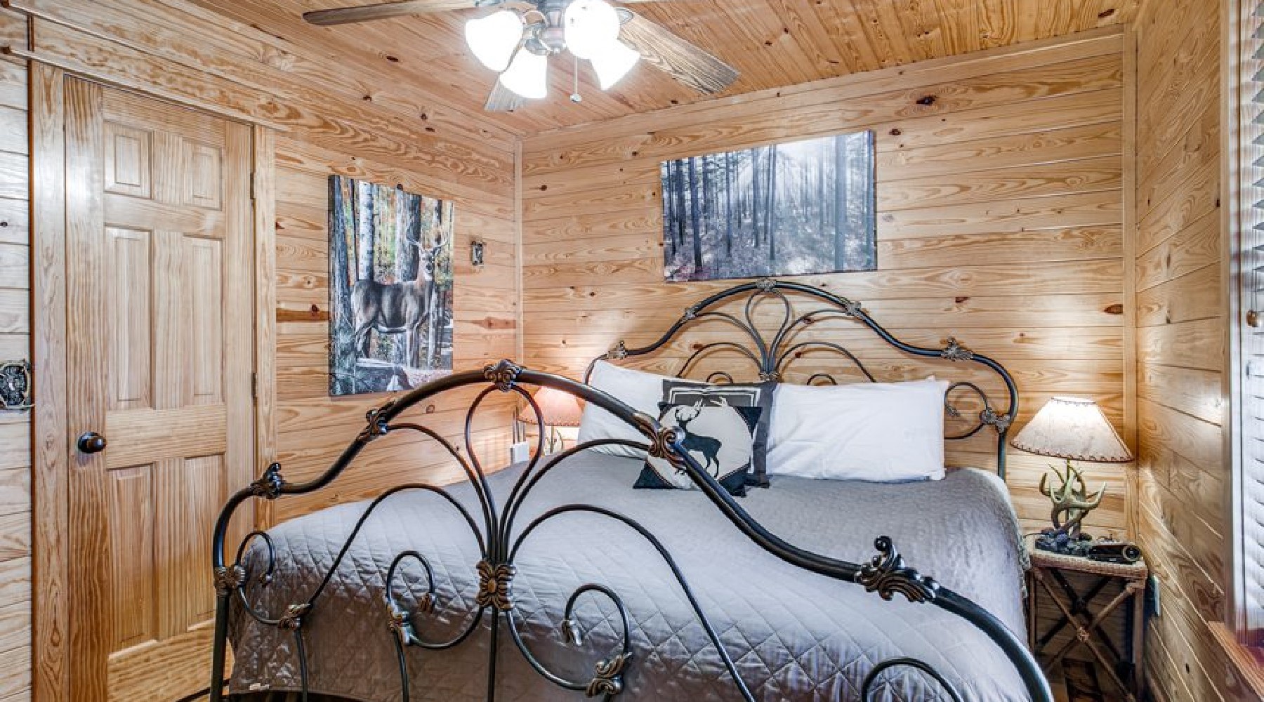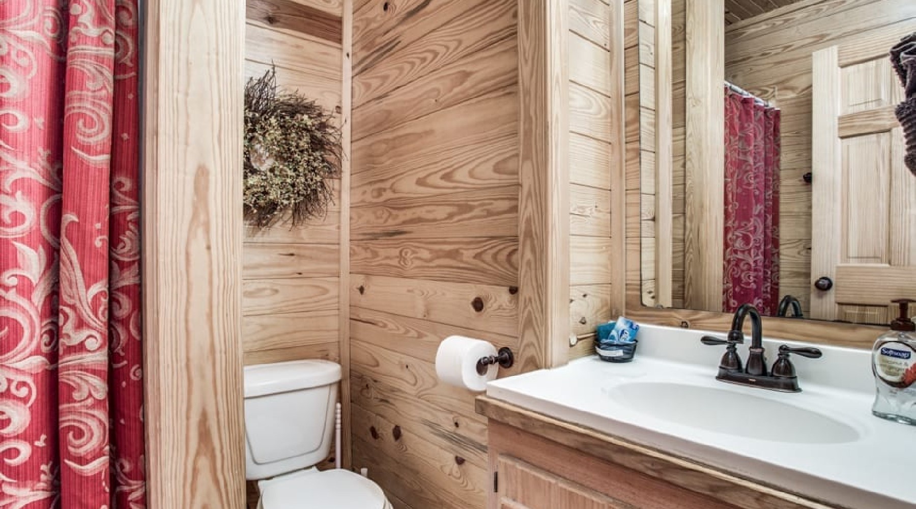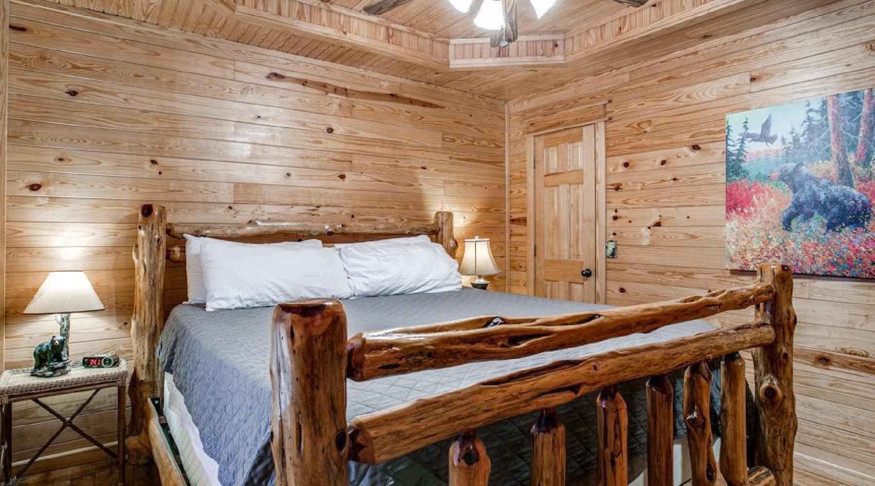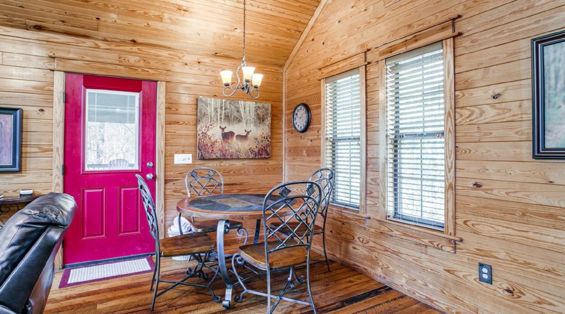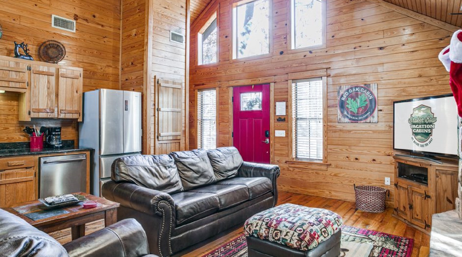 The Red Oak is perfect for a small family or romantic couple’s getaway. Nestled among tall pines and wayward oaks, the yard is spacious and the cabin cozy.