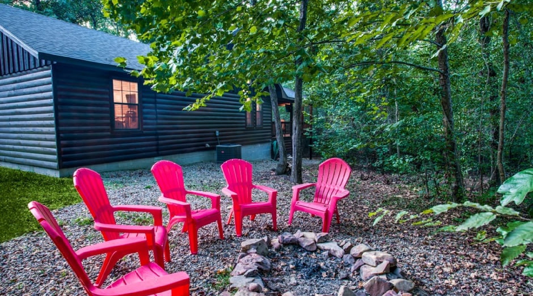 The deck area has amenities of gas cook grill (propane provided), a HDTV with DirecTV channels, rocking chairs and a 4–5-person hot tub (drained and cleaned after each reservation. There is a fire pit on the grounds to enjoy roasting hot dogs and making s’mores.
