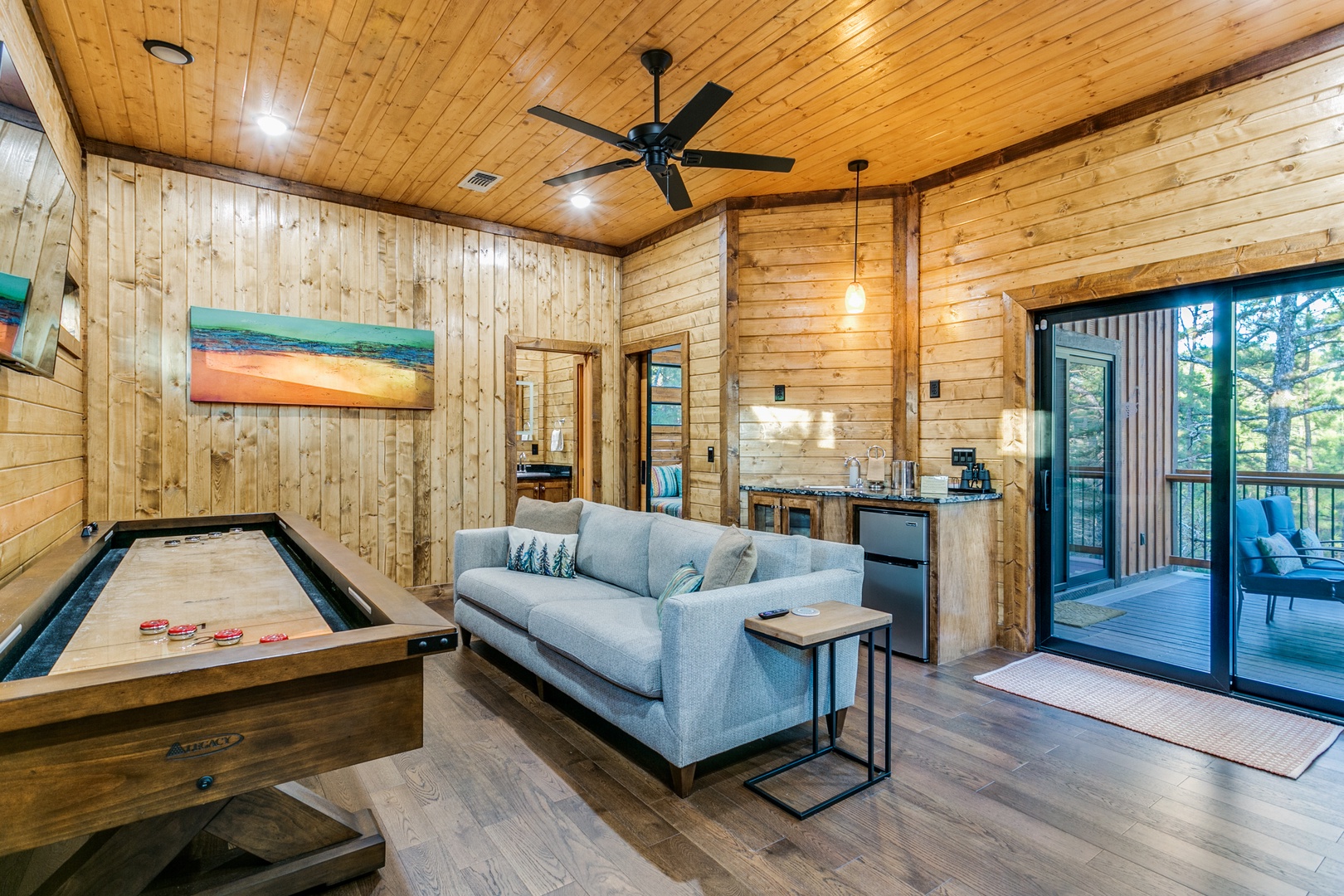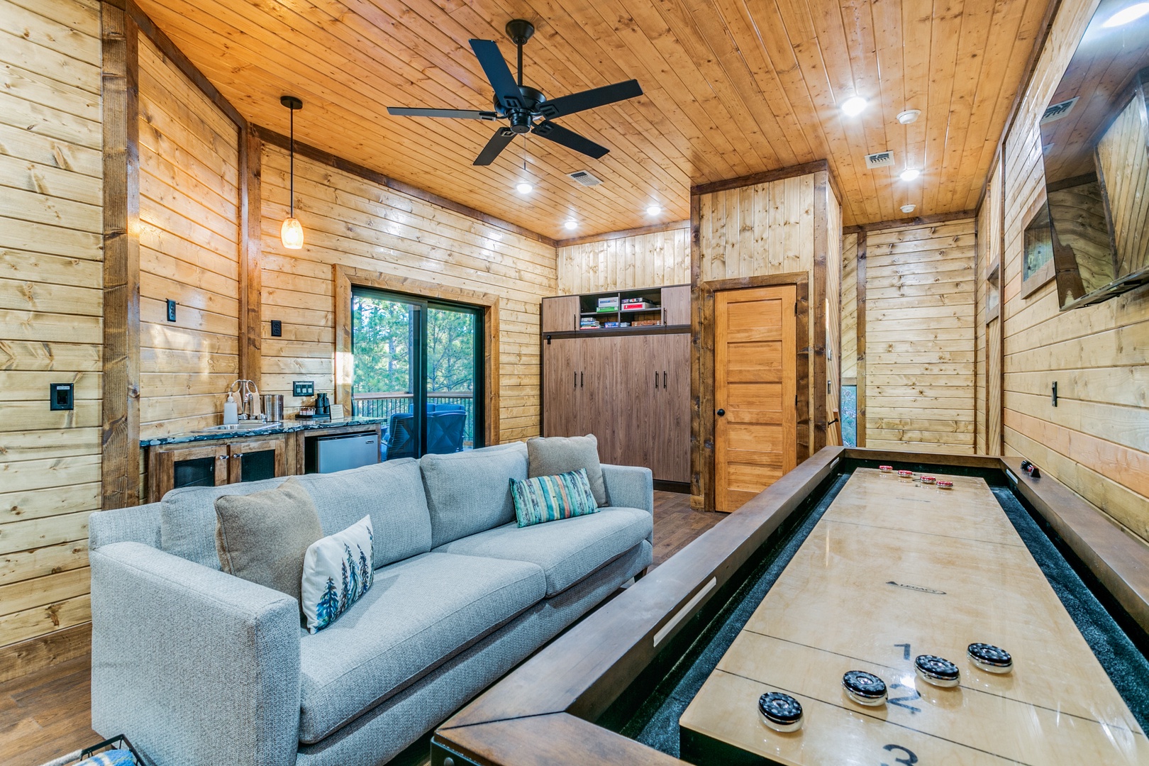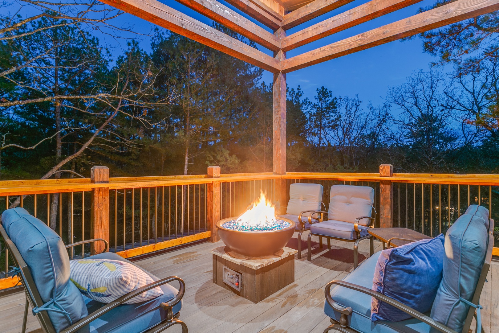 Upstairs, enjoy an indoor living space with a wet bar, shuffleboard, TV with streaming services, and a sofa. From there, walk out to a large balcony with ample seating, a glass glow propane fire bowl on a timer switch, and a stunning view.