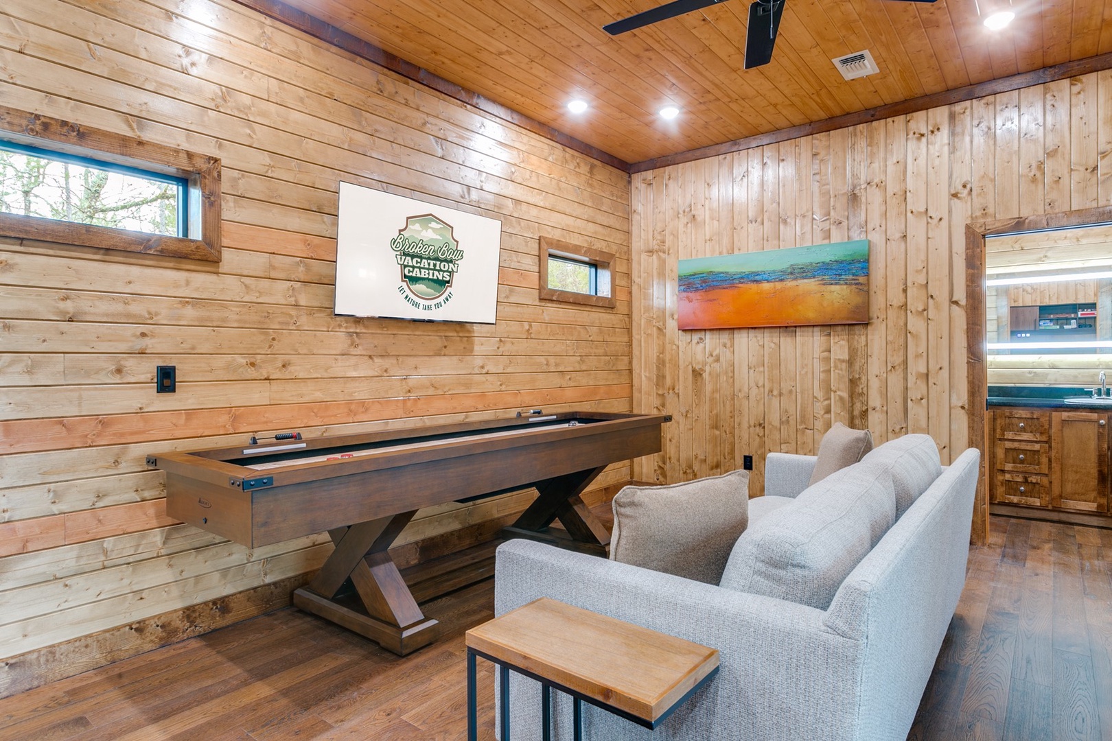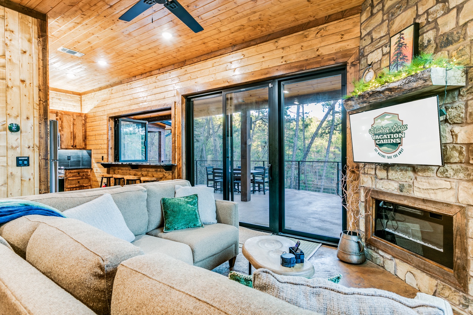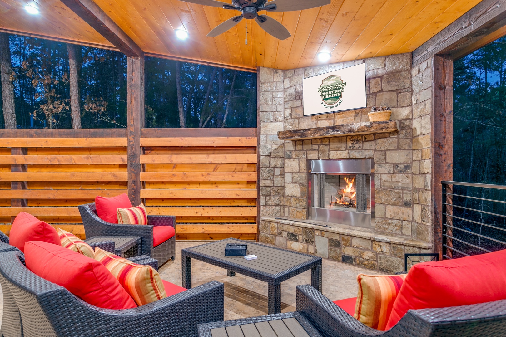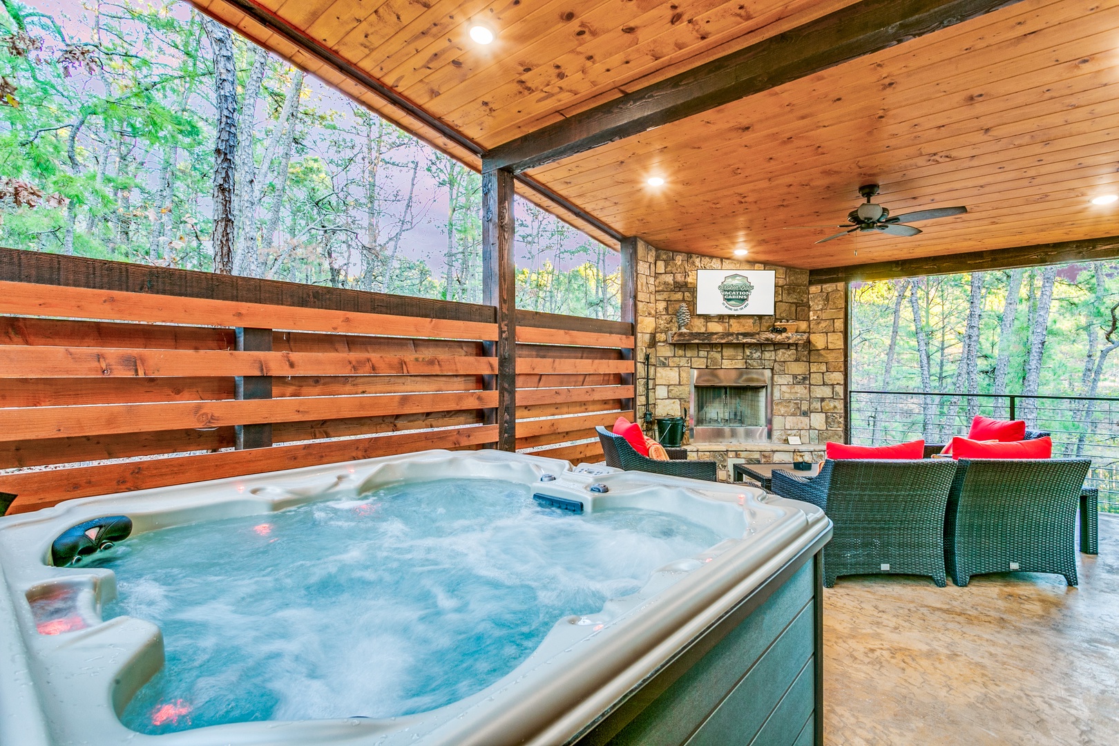Upstairs, enjoy an indoor living space with a wet bar, shuffleboard, TV with streaming services, and a sofa. From there, walk out to a large balcony with ample seating, a glass glow propane fire bowl on a timer switch, and a stunning view.