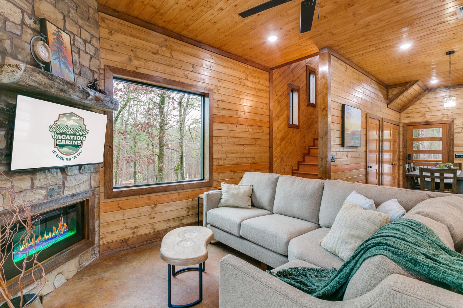 Enter a spacious and airy common area with dining and living spaces. The living area has a sectional sofa in front of a large screen TV with streaming services and a remote-controlled electric ambiance fireplace. A dining table and laundry closet with full-size washer and dryer are located in this area as well.