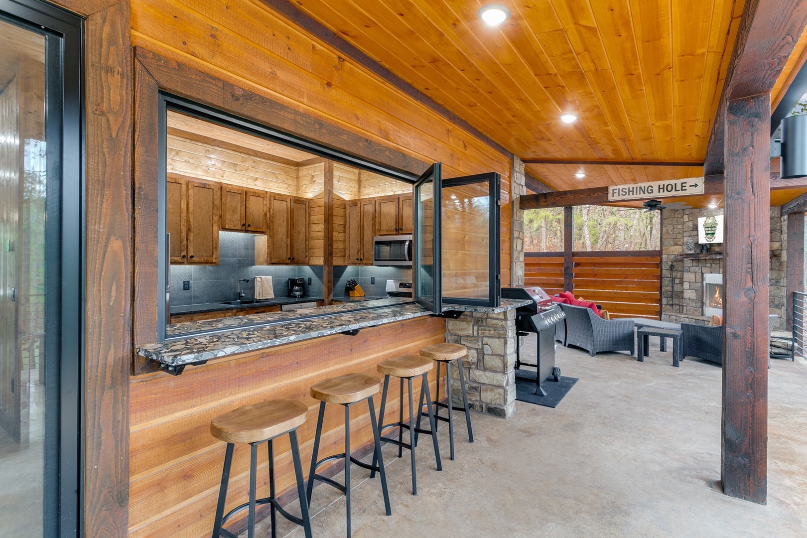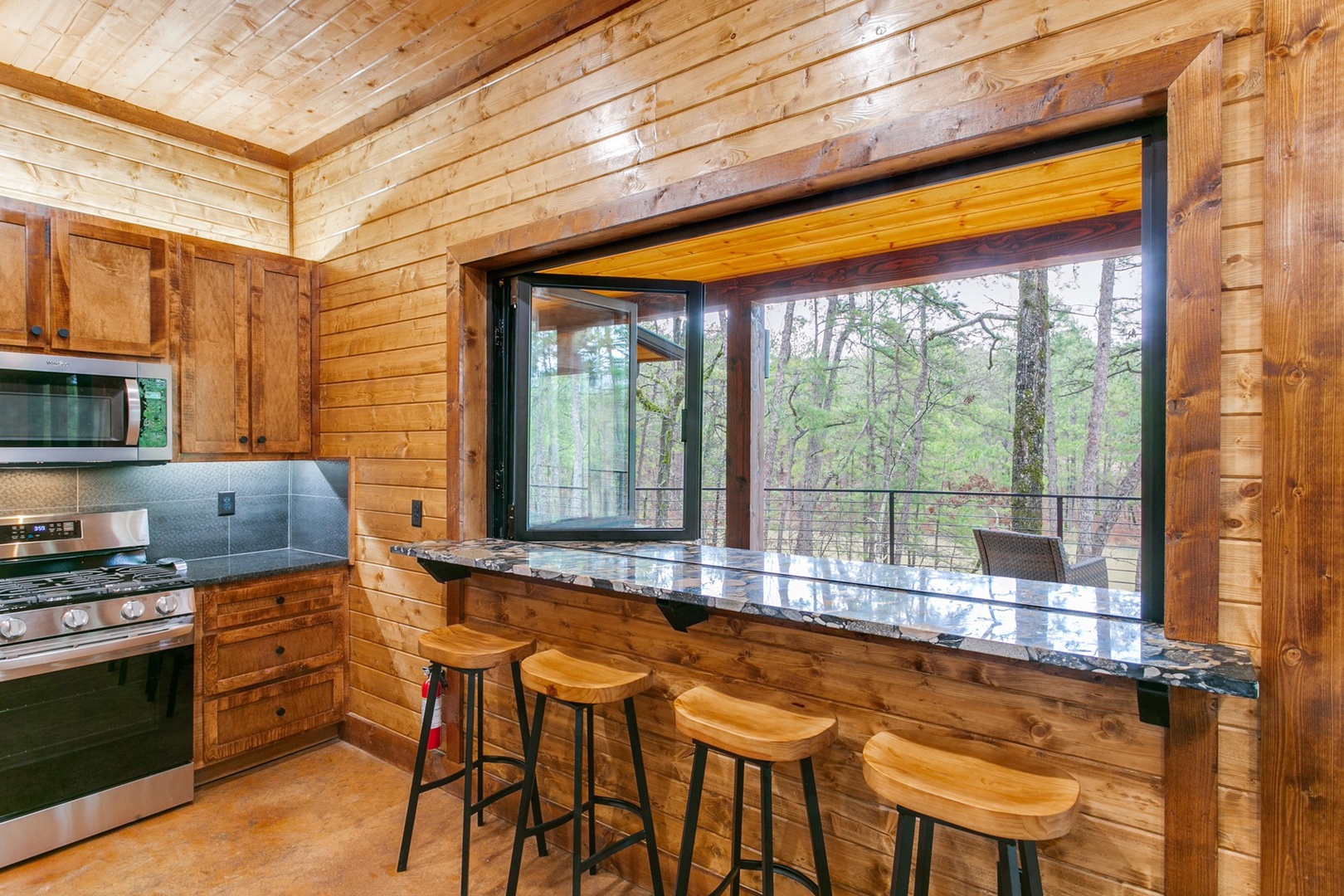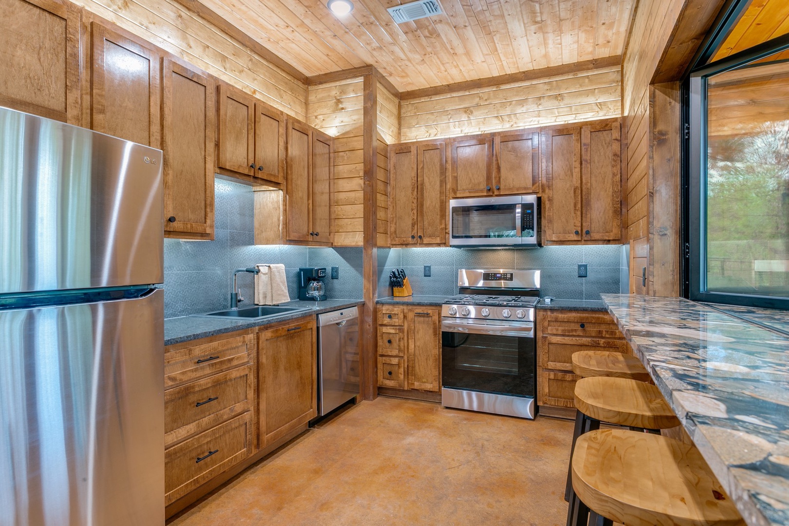 The kitchen features a 5-burner gas stove/convection oven, a dishwasher, microwave oven, and 2-door refrigerator/freezer with ice maker. Cabinets are stocked with cookware, bakeware, dinnerware, and utensils for cooking and eating. The gorgeous granite counter features a slide-away, large pane window allowing pass-thru access between the outdoor back patio and the kitchen. There are four bar stools at the counter on each side of the window for informal dining.