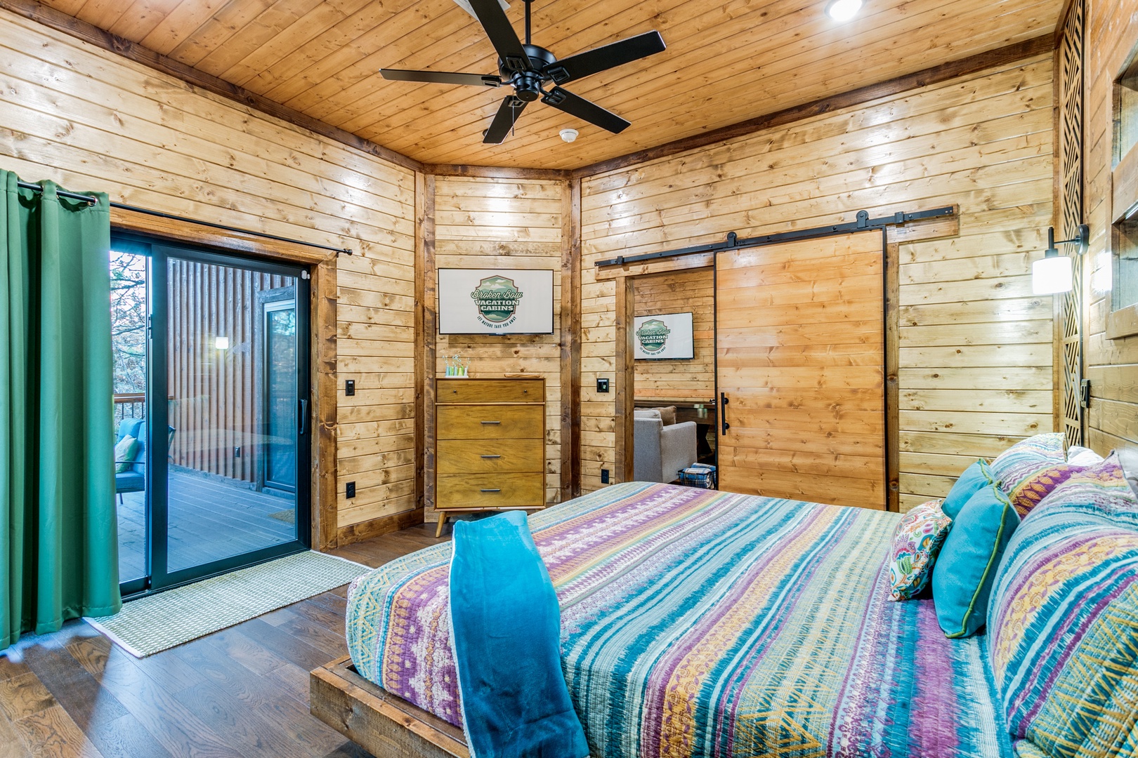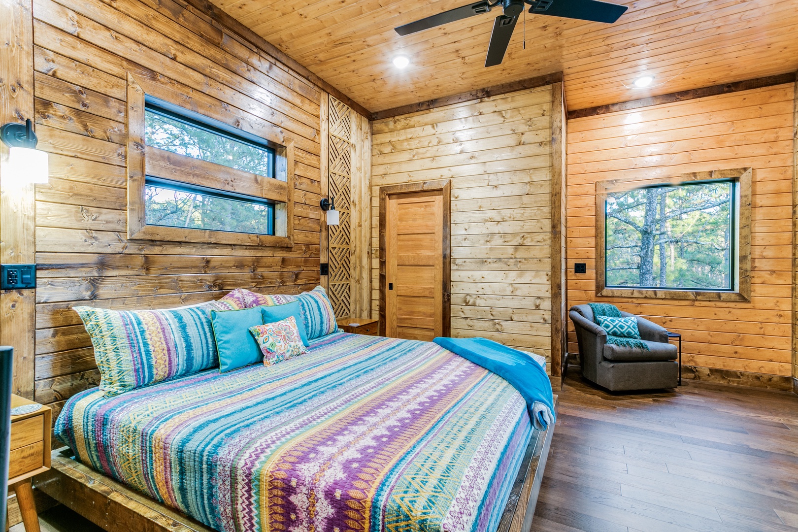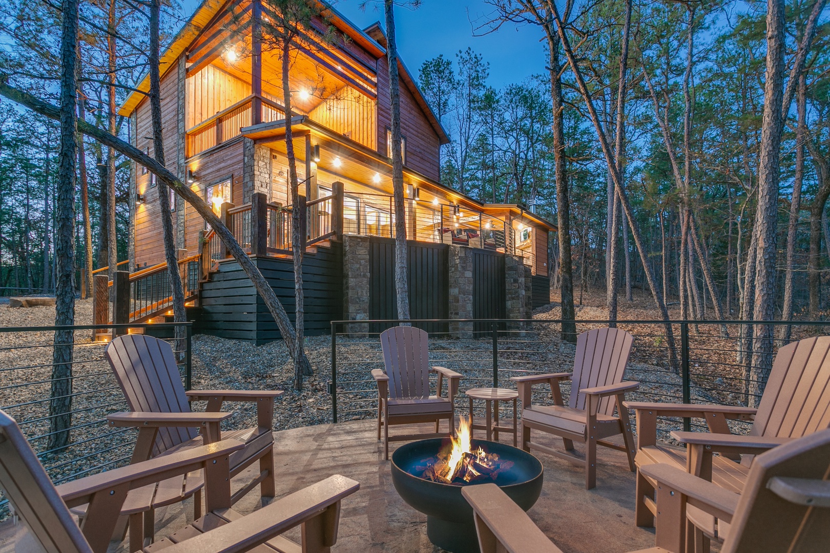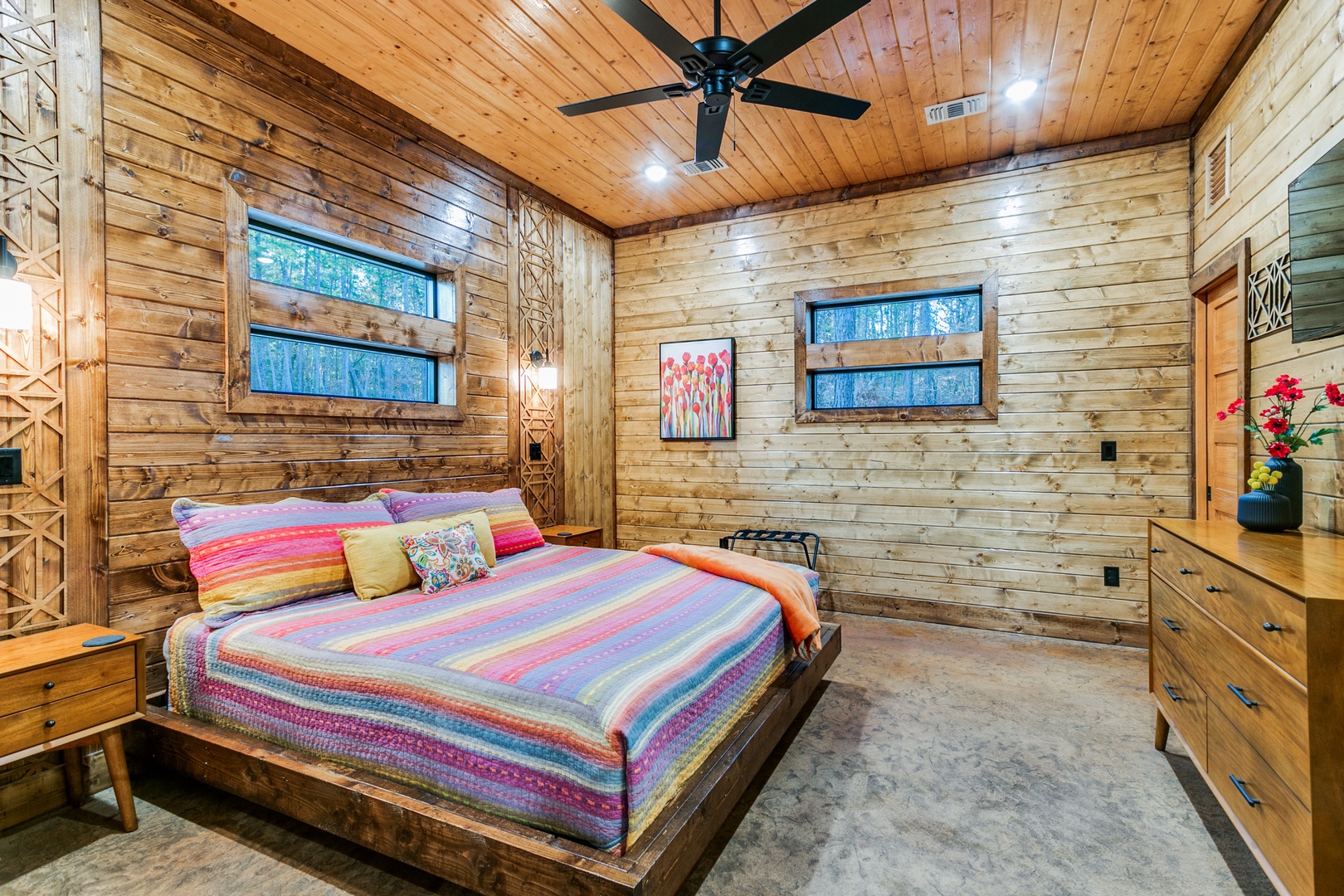 Additional outdoor amenities include a cornhole game, a catch-&-release pond stocked with bass and crappie, and a wood-burning fire pit made for roasting hotdogs and toasting marshmallows. Remember to pack your roasting sticks and your fishing poles!