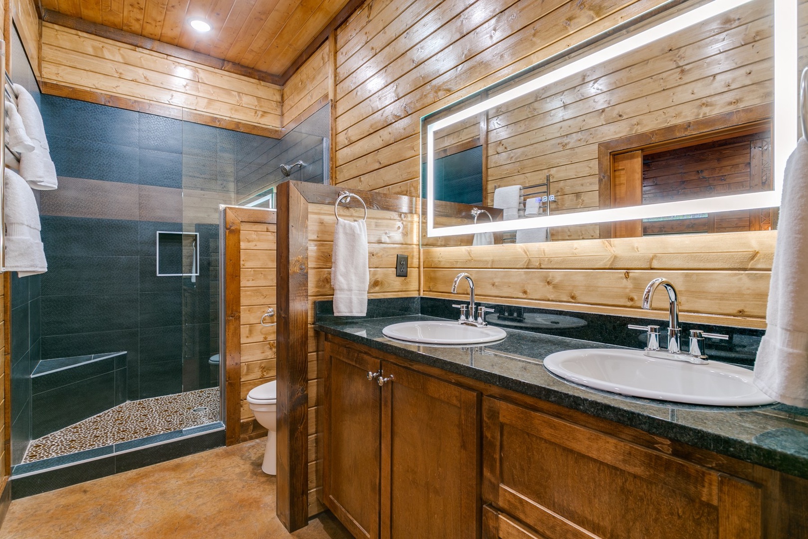 The bathroom on each floor can be accessed from the bedroom or the living area. Features include large, tiled walk-in showers, two vanities in each bath, LED-illuminated touch-sensor and anti-fog mirrors, as well as heated towel bars.