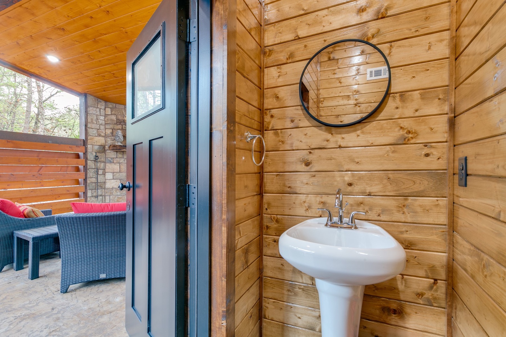 The substantial deck offers almost as much as the indoors! On one side of the deck, there is a spacious covered living area with a wood-burning fireplace, TV with streaming capability, club chair seating, a hot tub and an outdoor dining table. Around the corner, there is a grill for cooking (propane provided) and additional seating to enable guests to enjoy the beautiful view of two ponds. For convenience while outdoors, a half-bath is located off the deck.