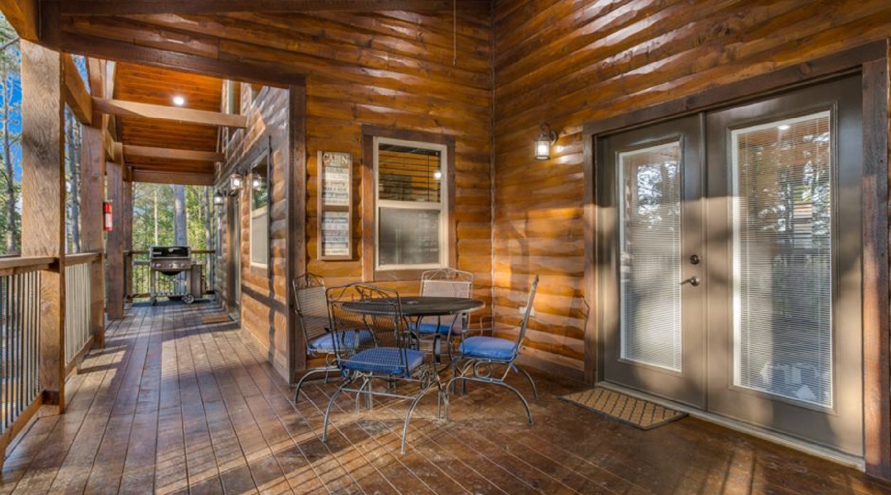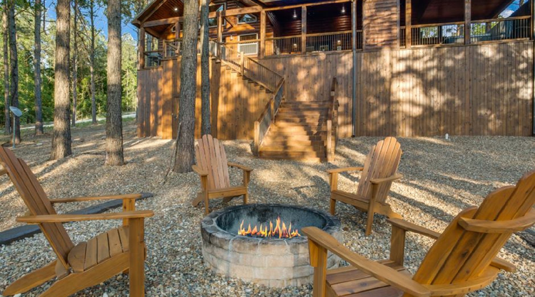 The back deck area has a dining table that seats four and a gas cook grill with propane provided. There is a gas burning fireplace with a push button timer on the side of the hearth (seasonal October 15th – April 15th). The hot tub is on the deck area also. Down the stairs you will find a circular fire pit for roasting hotdogs and watching the night stars.