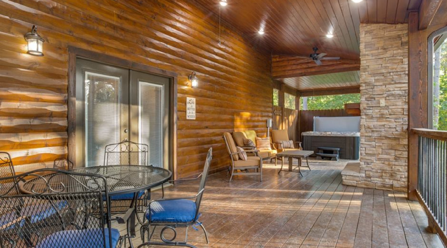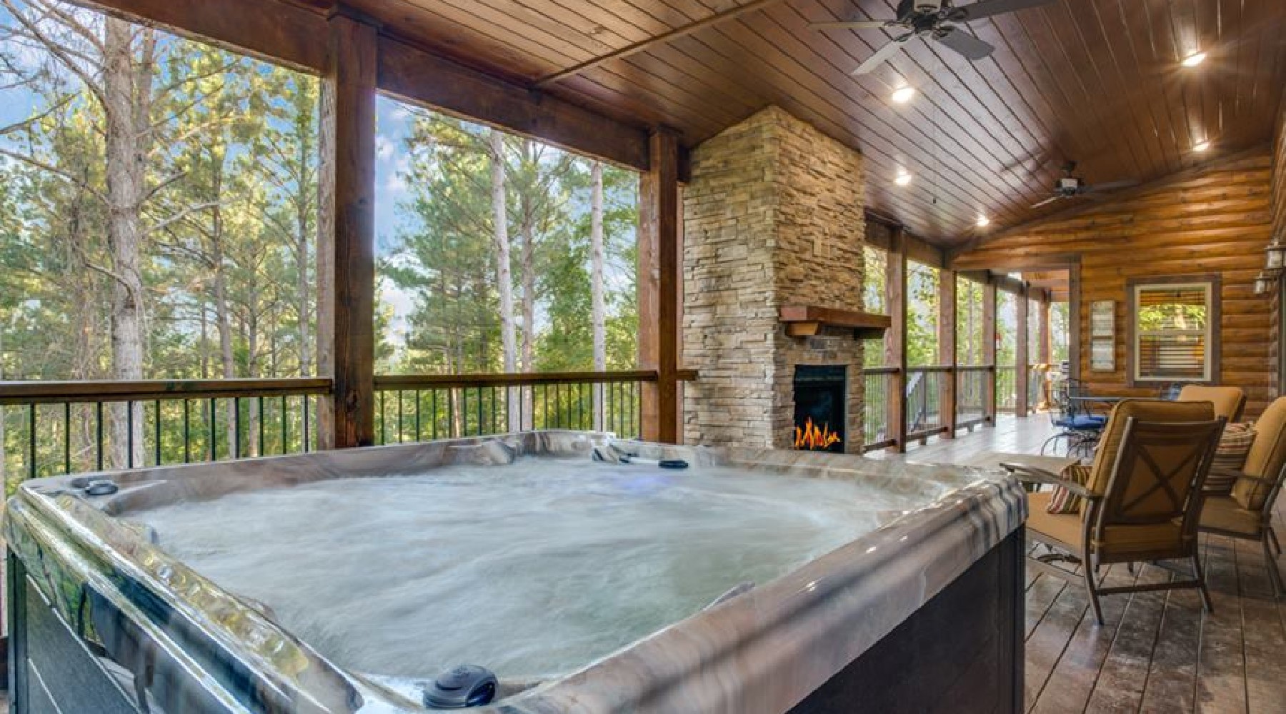 - Outdoor gas burning fireplace with easy on timer (seasonal October 15th – April 15th)