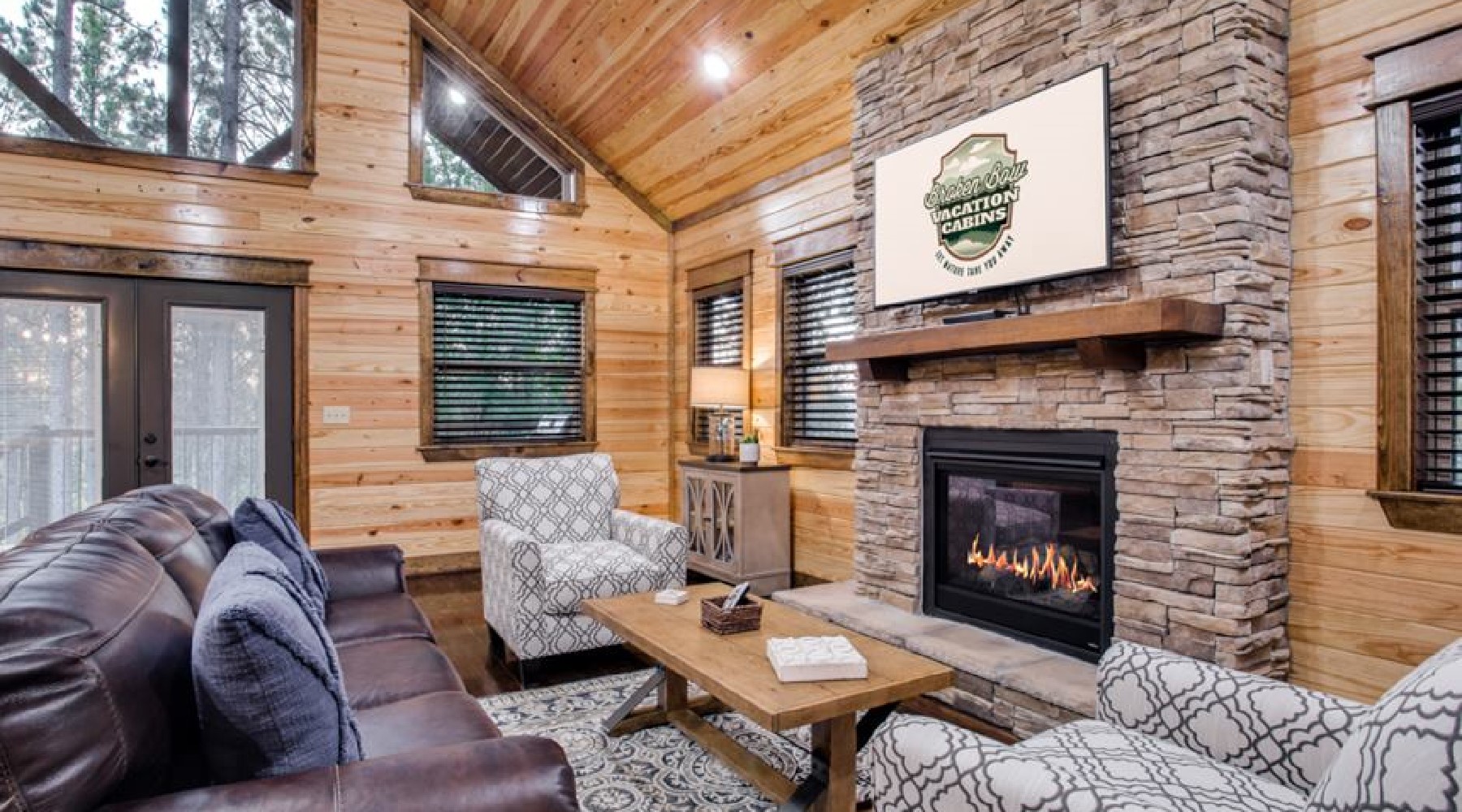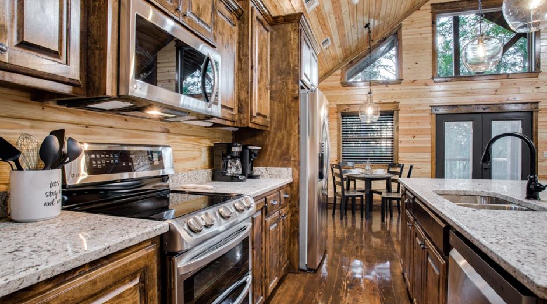 This one-bedroom cabin is complete with all the amenities to make your stay memorable. The living room has a sleeper sofa in front of a stacked-stone hearth with gas burning fireplace (seasonal October 15th – April 15th). The fireplace turns on with a timer switch on the side of the hearth. An HDTV is mounted above the fireplace and has DirecTV channels (PPV not available). There is a DVD player, so stop by the RedBox at Walmart in Broken Bow.