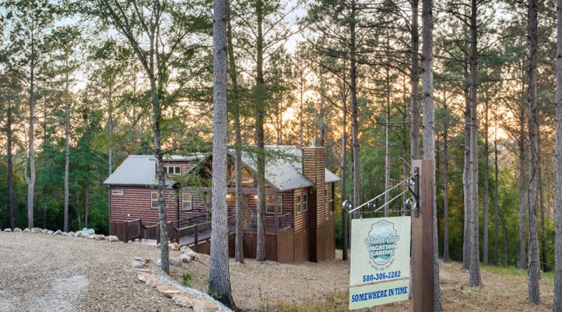 Somewhere In Time is a one-bedroom cabin set on a picturesque lot in the woods of Southeast Oklahoma. Stroll down a craftsman wood bridge to the front door where you will begin a relaxing stay in the Broken Bow area.