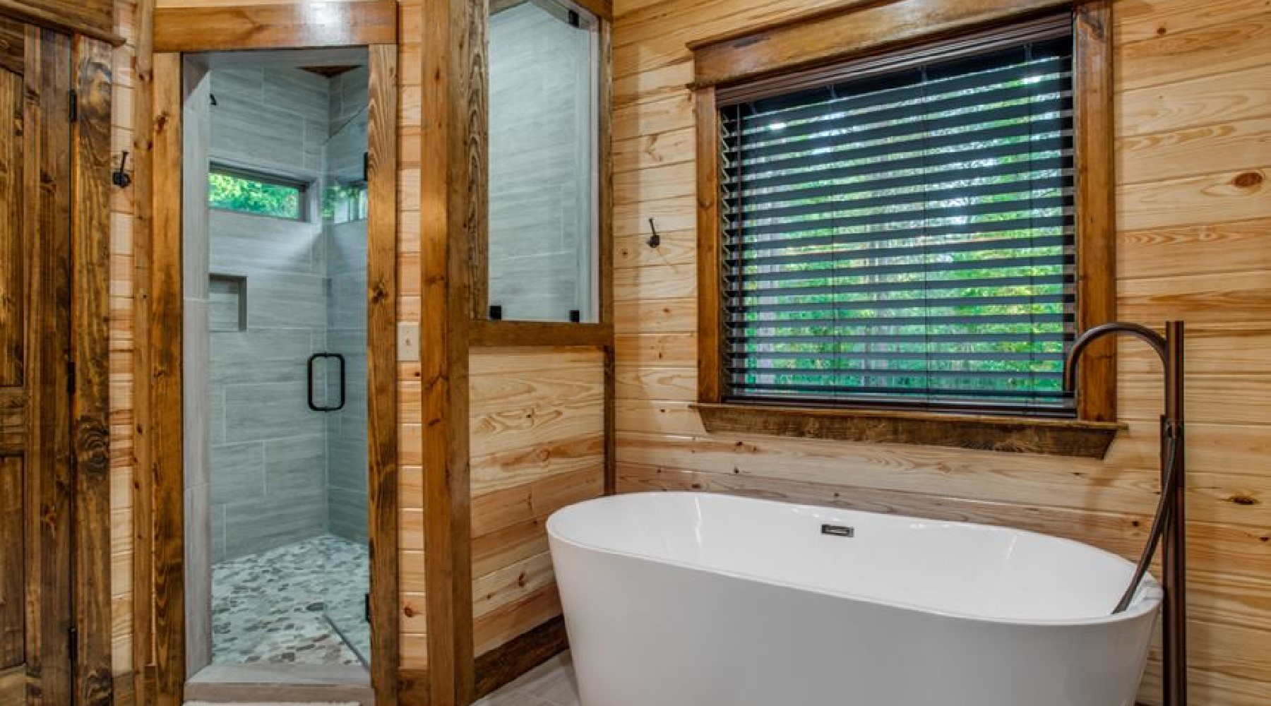 - 1 bathroom with soaking tub, walk-in tile shower, double vanities