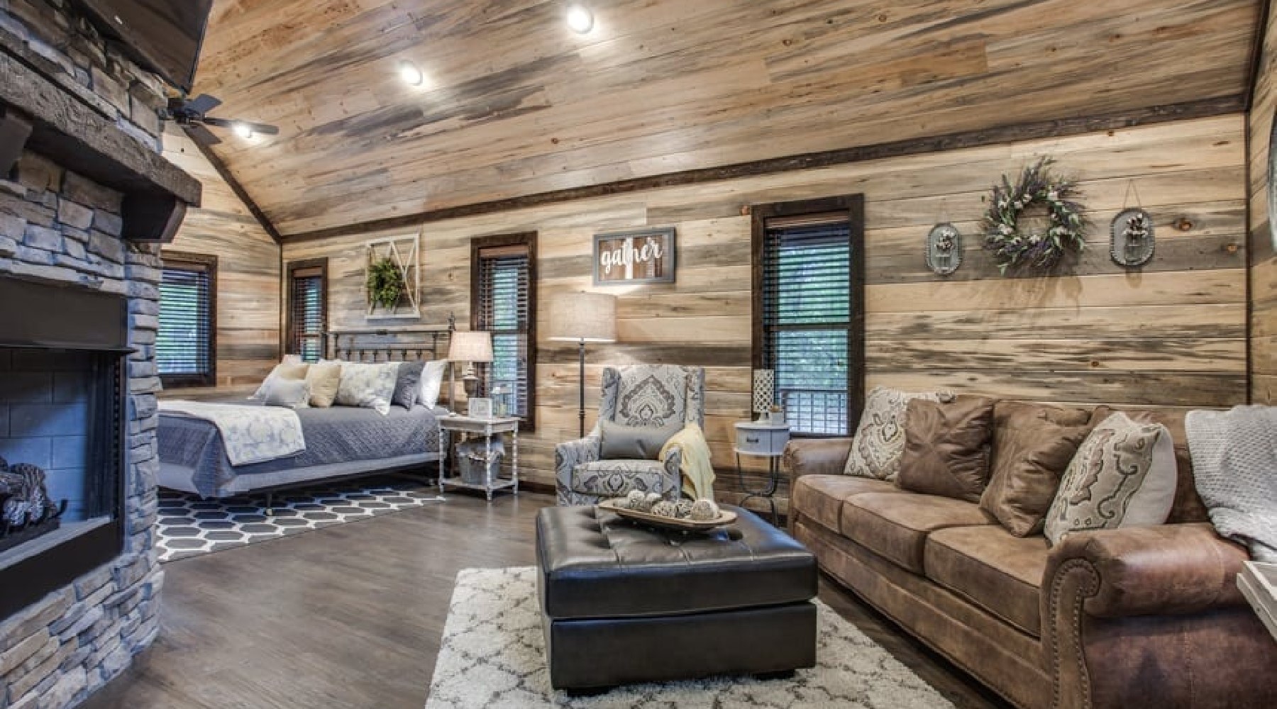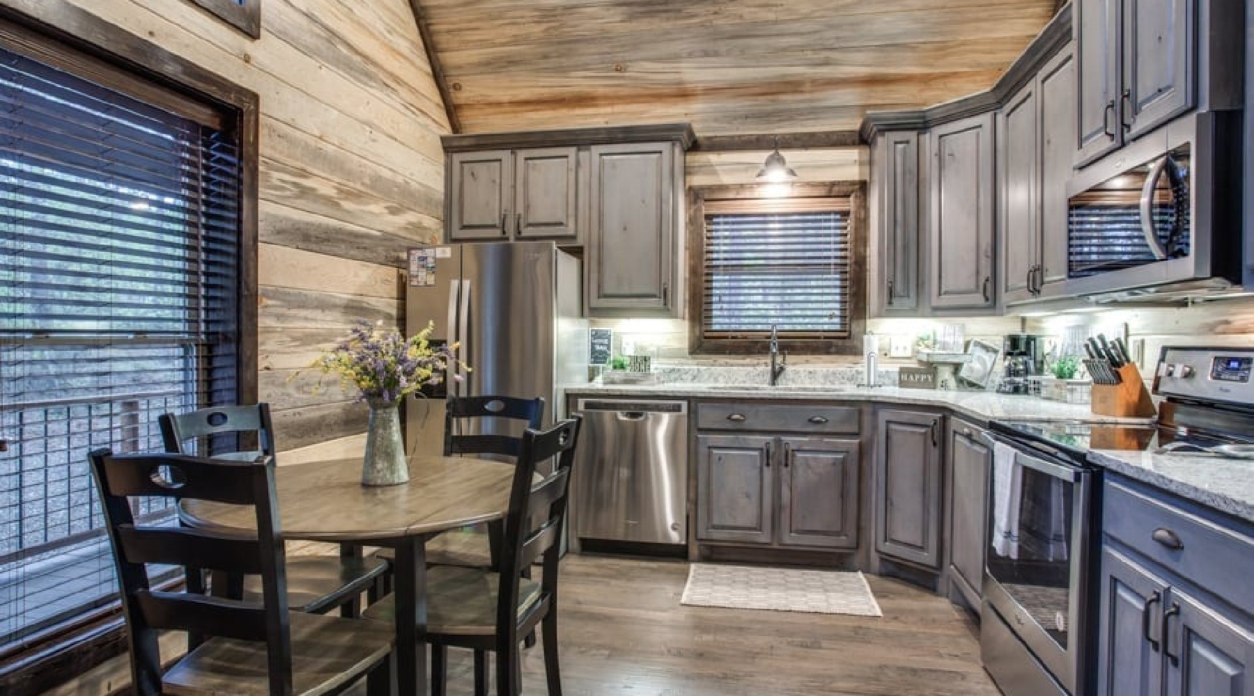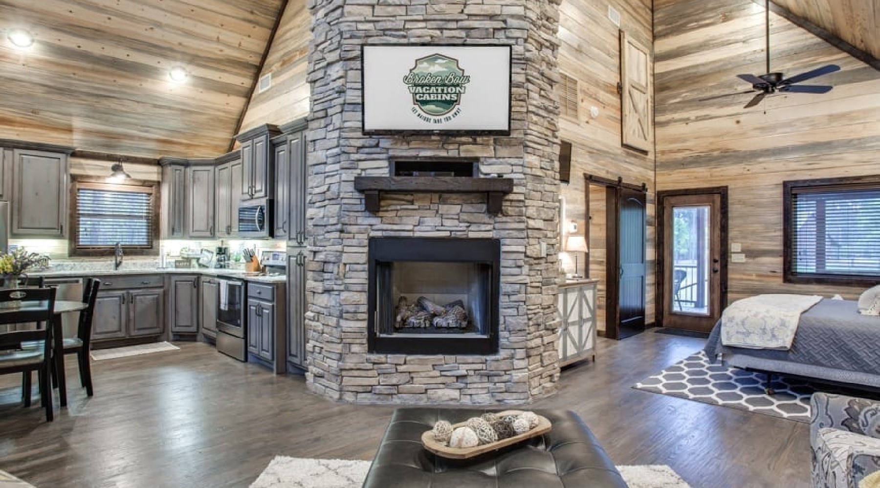 The front door brings you into the Living area with ample seating in front of a gas burning fireplace (seasonal October 15th – April 15th) with floor to ceiling rock hearth. The leather sofa converts to a queen sleeper to accommodate 2 guests. A 50’HDTV with DirecTV package (PPV not available) is mounted above the hearth. The fireplace has an easy start thermostat. To the left of the living area is the Kitchen with full size appliances of glass-top range/oven, microwave, dishwasher and refrigerator. The cabinets are stocked with skillets, pots & pans, utensils, plates and glassware to prepare and enjoy meals at the cabin. There is a dining table with seating for 4 in this area as well.