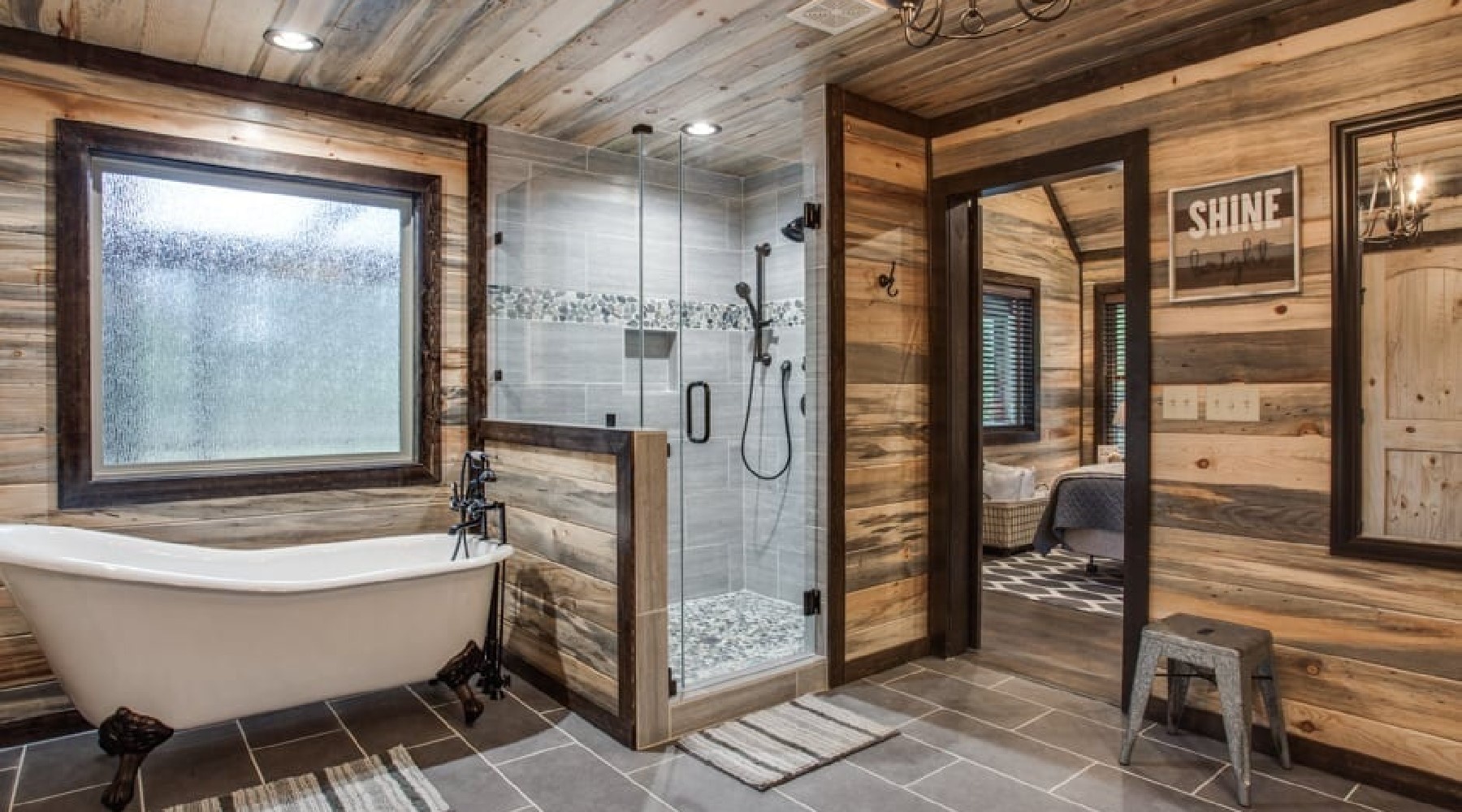 The Bedroom area is to the right of the living area. The king size mattress is wrapped in luxury linens for a comfortable night’s sleep. There is a 32″ HDTV mounted in the bedroom area for night time viewing. The spacious bathroom is an oasis offering a 32″ HDTV with DirecTV package (PPV not available) over a gas burning fireplace with rock hearth (seasonal October 15th – April 15th). A claw-foot soaking basin tub sits in the corner alcove. There is a separate walk-in tiled shower