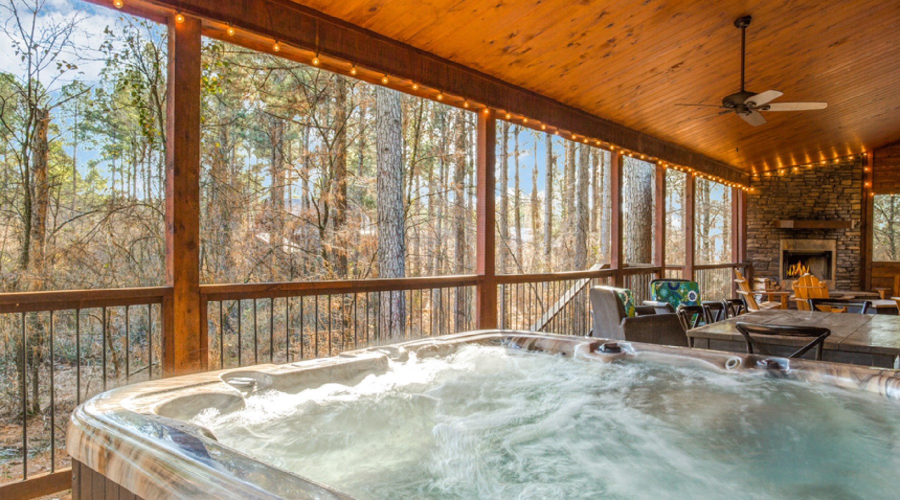 Moving outdoors, there is a massive back porch with a grill and sink for outdoor cooking. The beautiful rock fireplace (seasonal October 15th – April 15th) will keep you warm on cool nights and provide a place for you to gather and visit. A table, bench, and plenty of outdoor seating gives you enough space for outdoor dining or relaxing. Also on the back porch is a spacious hot tub to soak and enjoy the view of Oklahoma nature.