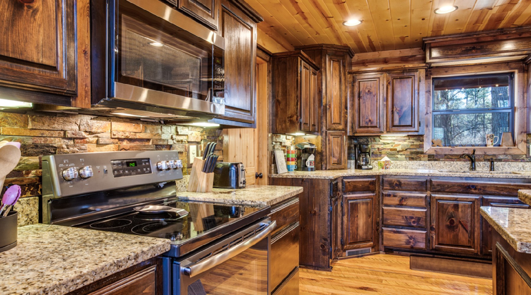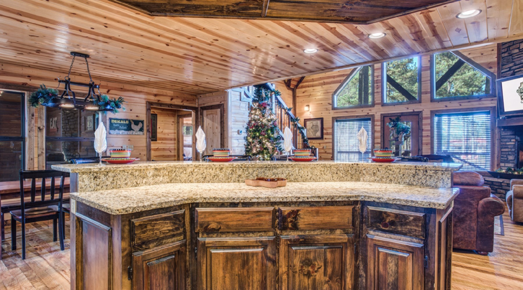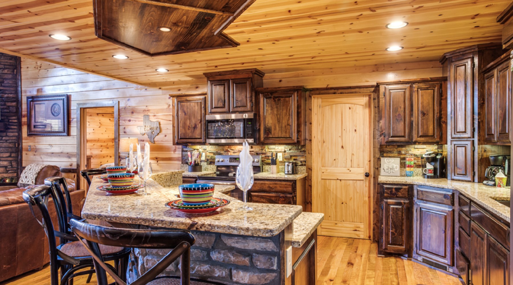 The minute you enter this cabin from the spacious front porch, you will feel relaxed and at home. The openness of this cabin engages everyone. The living room has ample seating with a comfortable leather couch and cozy chair. The rock fireplace lights with the flip of a switch (seasonal October 15th – April 15th). Enjoy a movie or watch the game on the big streaming TV