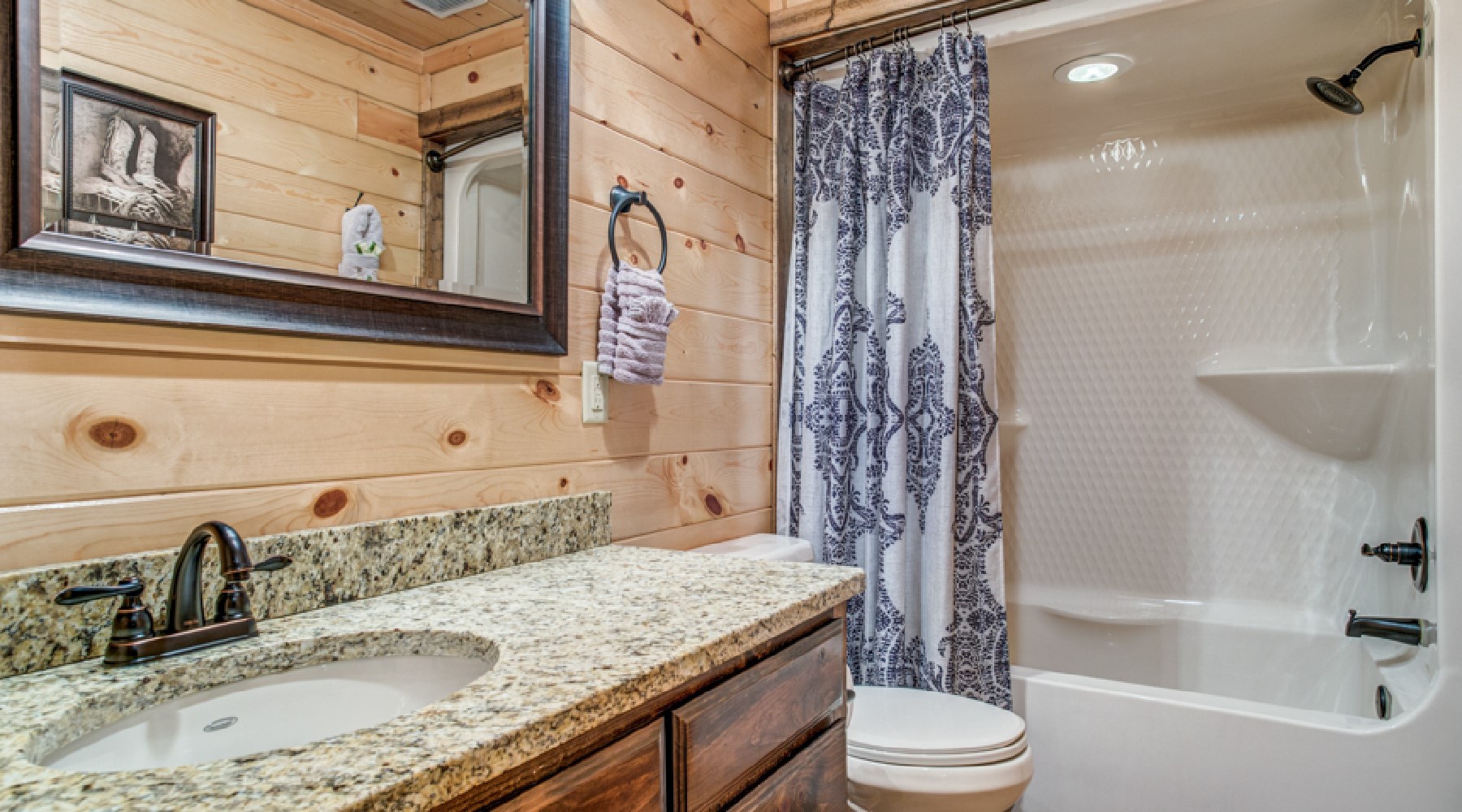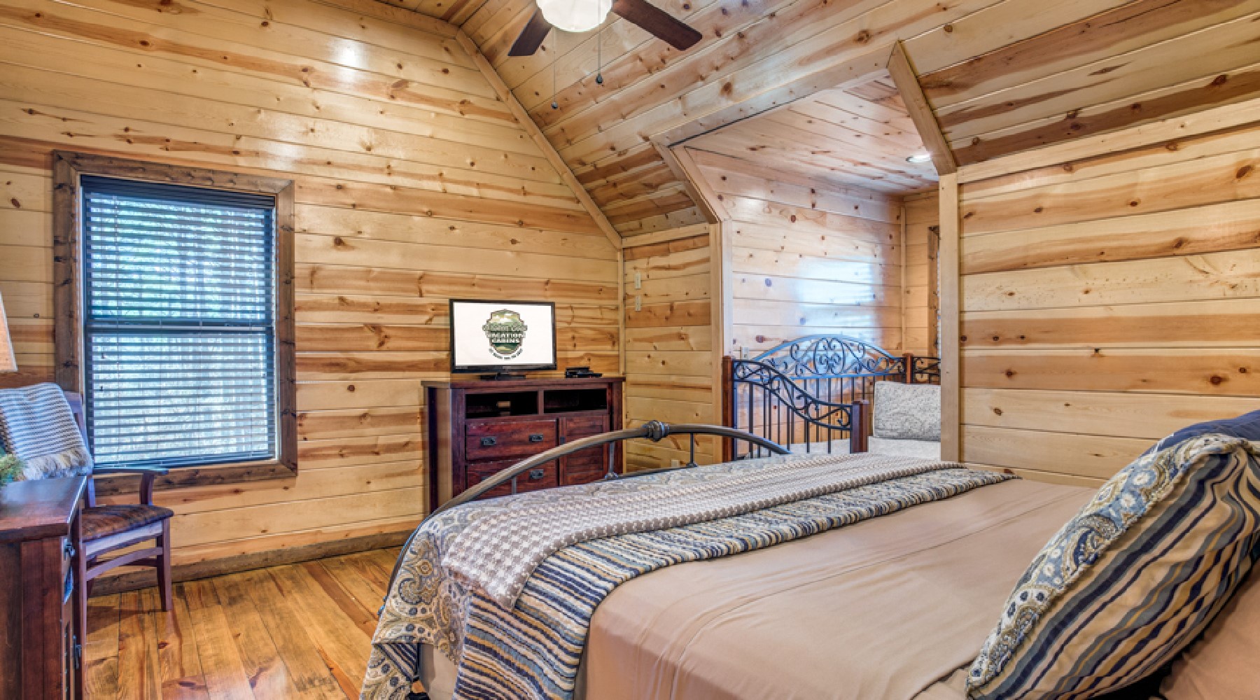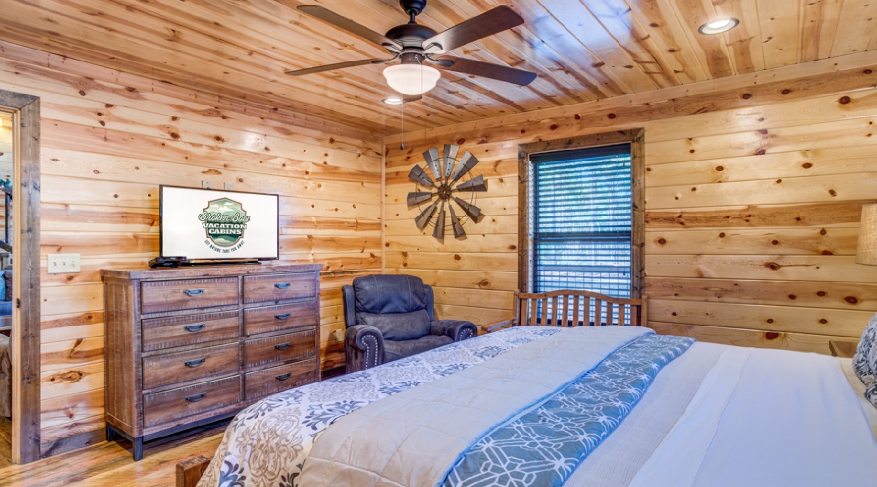 The minute you enter this cabin from the spacious front porch, you will feel relaxed and at home. The openness of this cabin engages everyone. The living room has ample seating with a comfortable leather couch and cozy chair. The rock fireplace lights with the flip of a switch (seasonal October 15th – April 15th). Enjoy a movie or watch the game on the big streaming TV