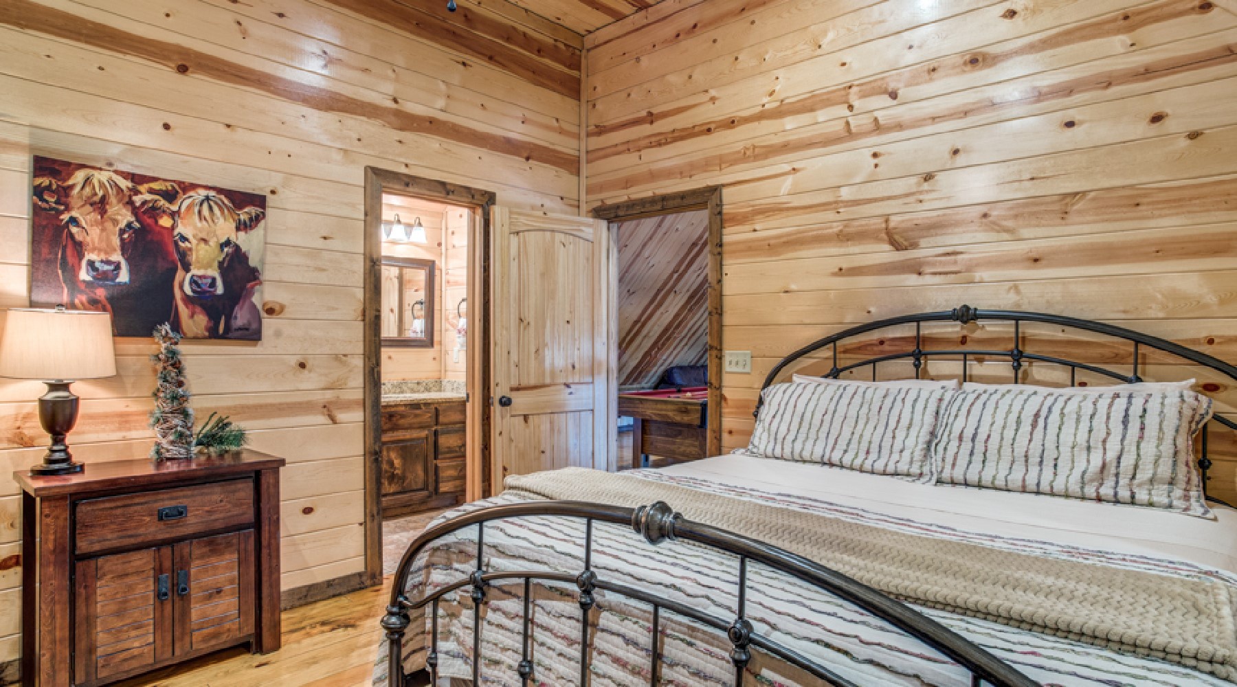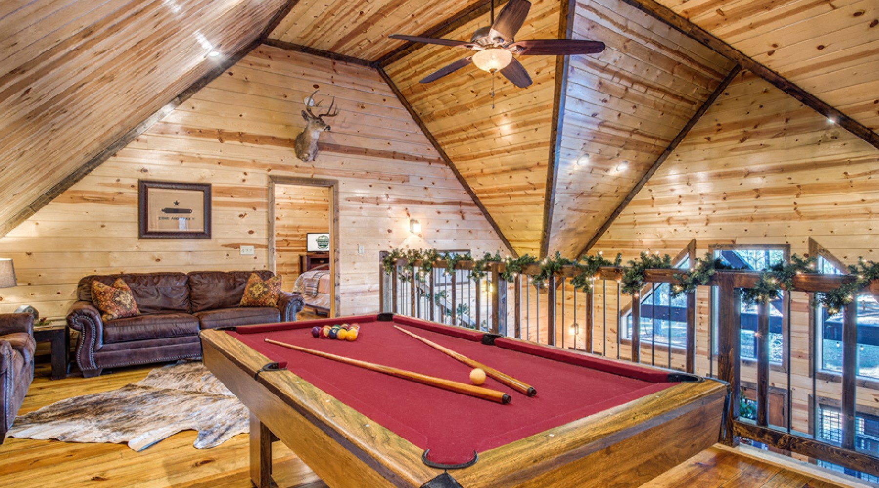 Up the beautiful staircase is a roomy loft with a full pool table and plenty of seating with a comfy sofa and loveseat. The sofa opens up to a queen size bed. The guests who sleep on the sofa have entry to one of the bathrooms from the loft.