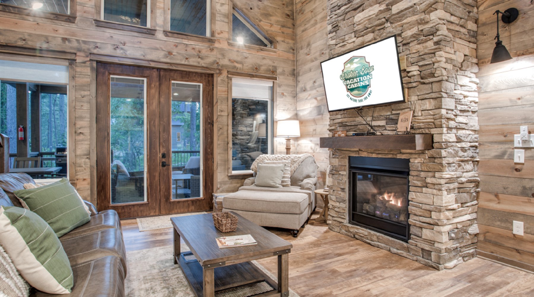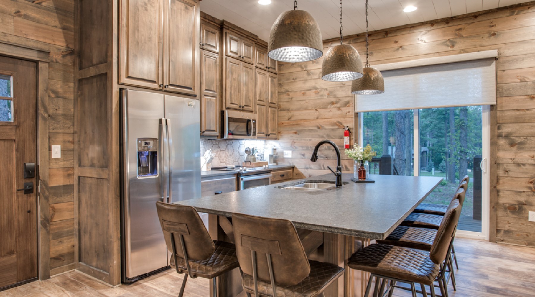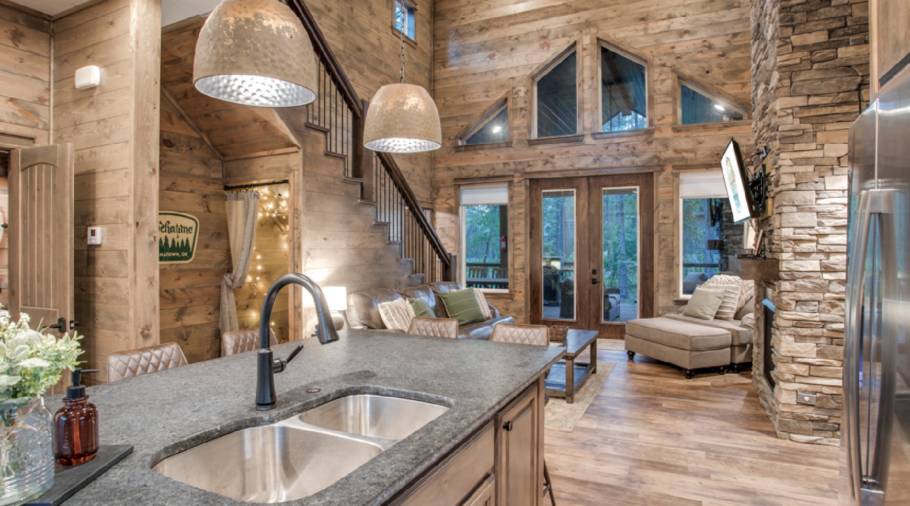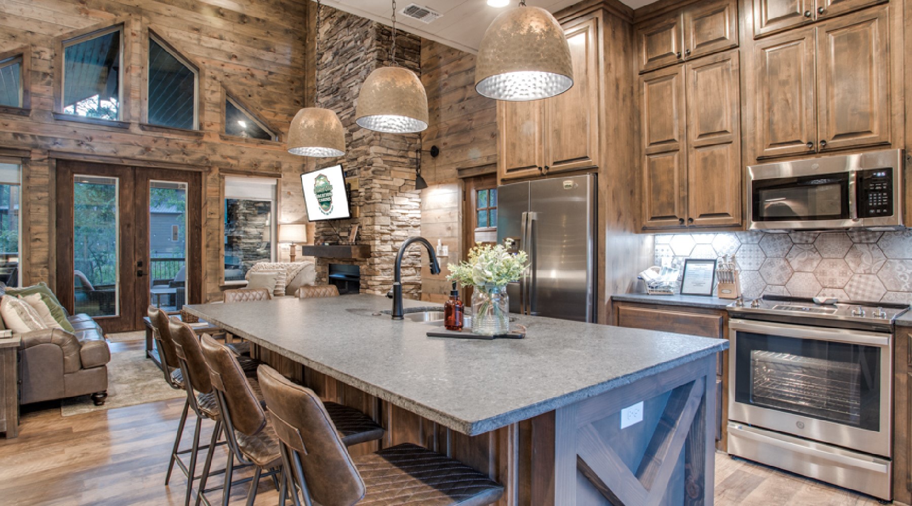 The Barn At Broken Bow is a modern-rustic luxury retreat nestled in the trees and tranquility of Lost Creek development, located 1.3 miles from Choctaw Landing. The open floor plan is beautifully designed to create a welcoming space with a touch of privacy throughout the cabin. The Barn At Broken Bow features a rock hearth with gas burning fireplace (seasonal October 15th – April 15th) in the living room area for creating a cozy atmosphere. The thermostat timer control on the side of the hearth makes on and off of the flame easy. The living area is furnished with a flat screen TV with DirecTV package (PPV not available) mounted above the hearth alongside a sofa and oversized armchair for comfortable viewing. There is a child’s play nook nestled into the under stairs space accessed in the kitchen/living area.