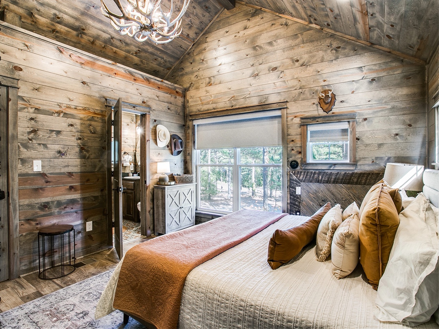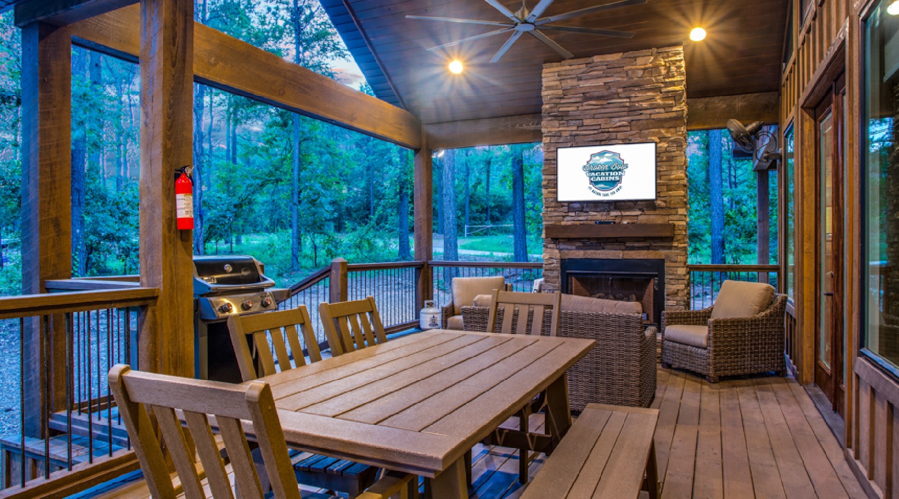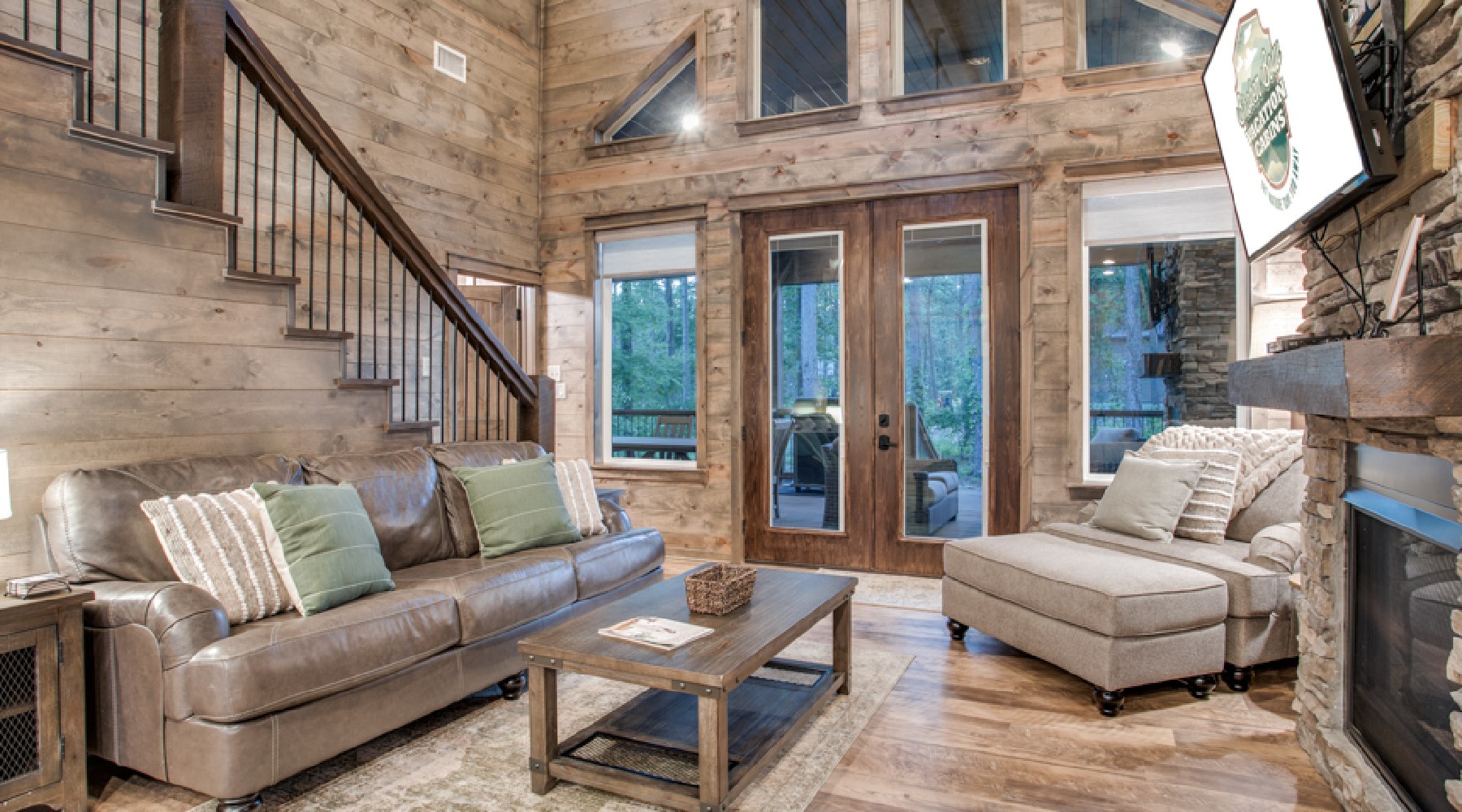 The Barn At Broken Bow is a modern-rustic luxury retreat nestled in the trees and tranquility of Lost Creek development, located 1.3 miles from Choctaw Landing. The open floor plan is beautifully designed to create a welcoming space with a touch of privacy throughout the cabin. The Barn At Broken Bow features a rock hearth with gas burning fireplace (seasonal October 15th – April 15th) in the living room area for creating a cozy atmosphere. The thermostat timer control on the side of the hearth makes on and off of the flame easy. The living area is furnished with a flat screen TV with DirecTV package (PPV not available) mounted above the hearth alongside a sofa and oversized armchair for comfortable viewing. There is a child’s play nook nestled into the under stairs space accessed in the kitchen/living area.