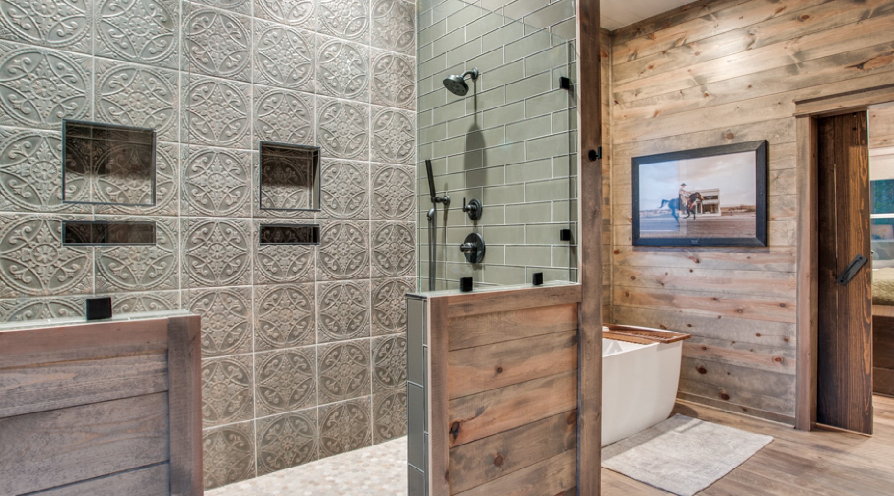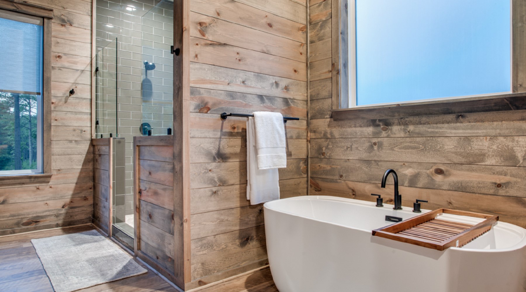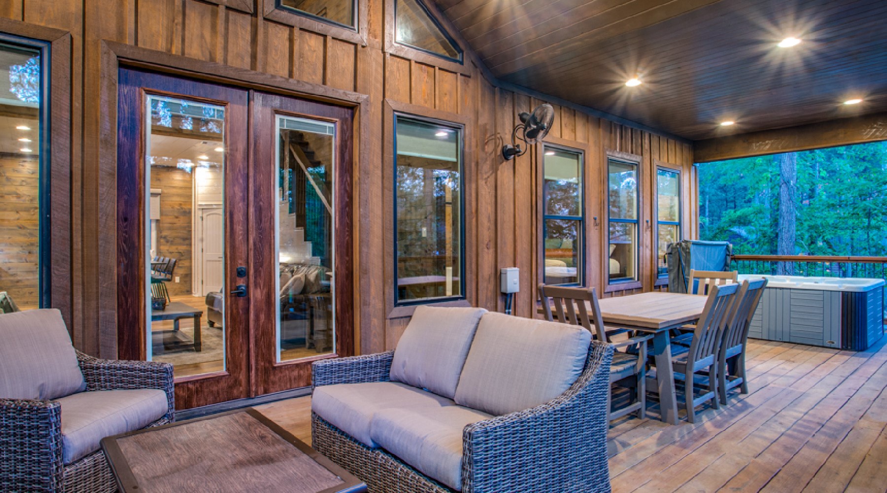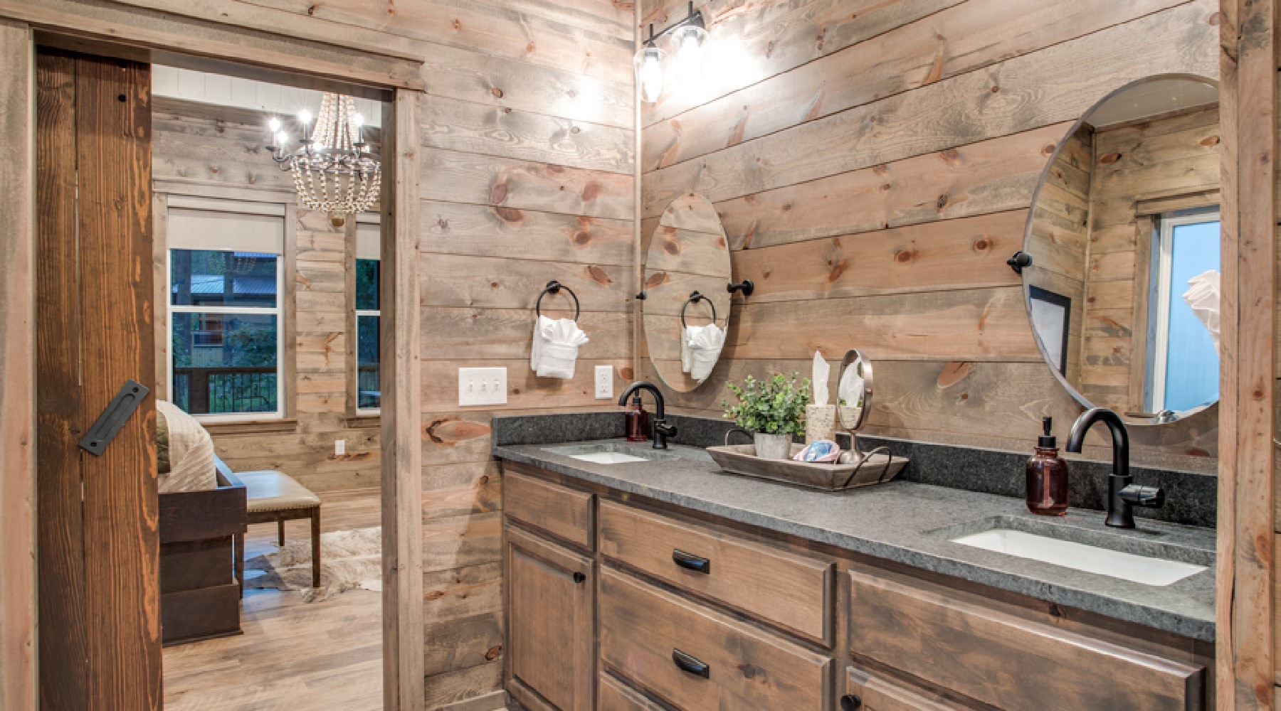 The Barn At Broken Bow is a modern-rustic luxury retreat nestled in the trees and tranquility of Lost Creek development, located 1.3 miles from Choctaw Landing. The open floor plan is beautifully designed to create a welcoming space with a touch of privacy throughout the cabin. The Barn At Broken Bow features a rock hearth with gas burning fireplace (seasonal October 15th – April 15th) in the living room area for creating a cozy atmosphere. The thermostat timer control on the side of the hearth makes on and off of the flame easy. The living area is furnished with a flat screen TV with DirecTV package (PPV not available) mounted above the hearth alongside a sofa and oversized armchair for comfortable viewing. There is a child’s play nook nestled into the under stairs space accessed in the kitchen/living area.
